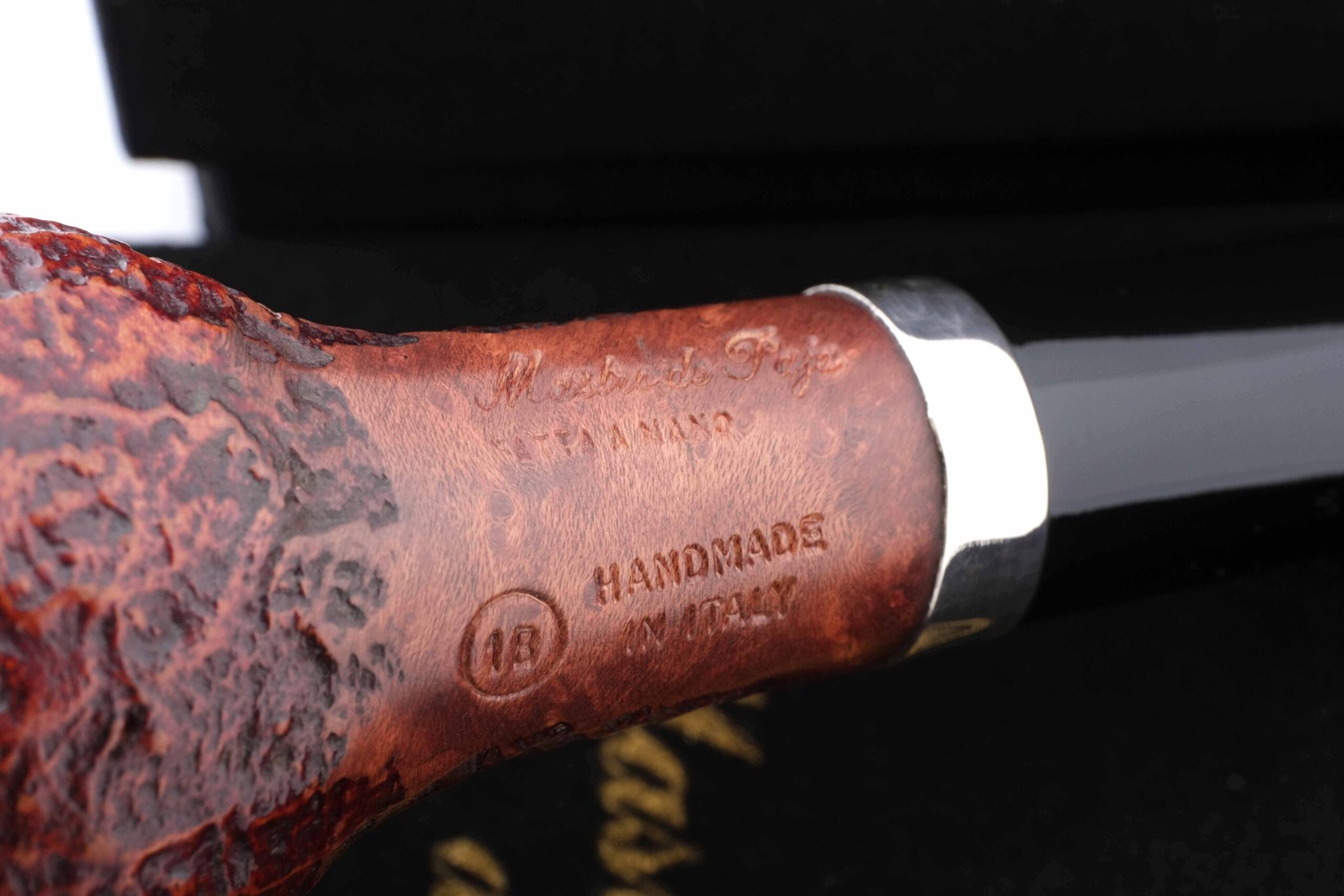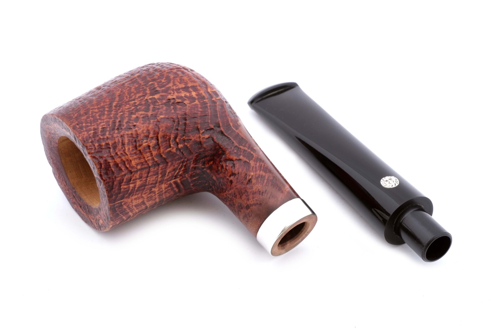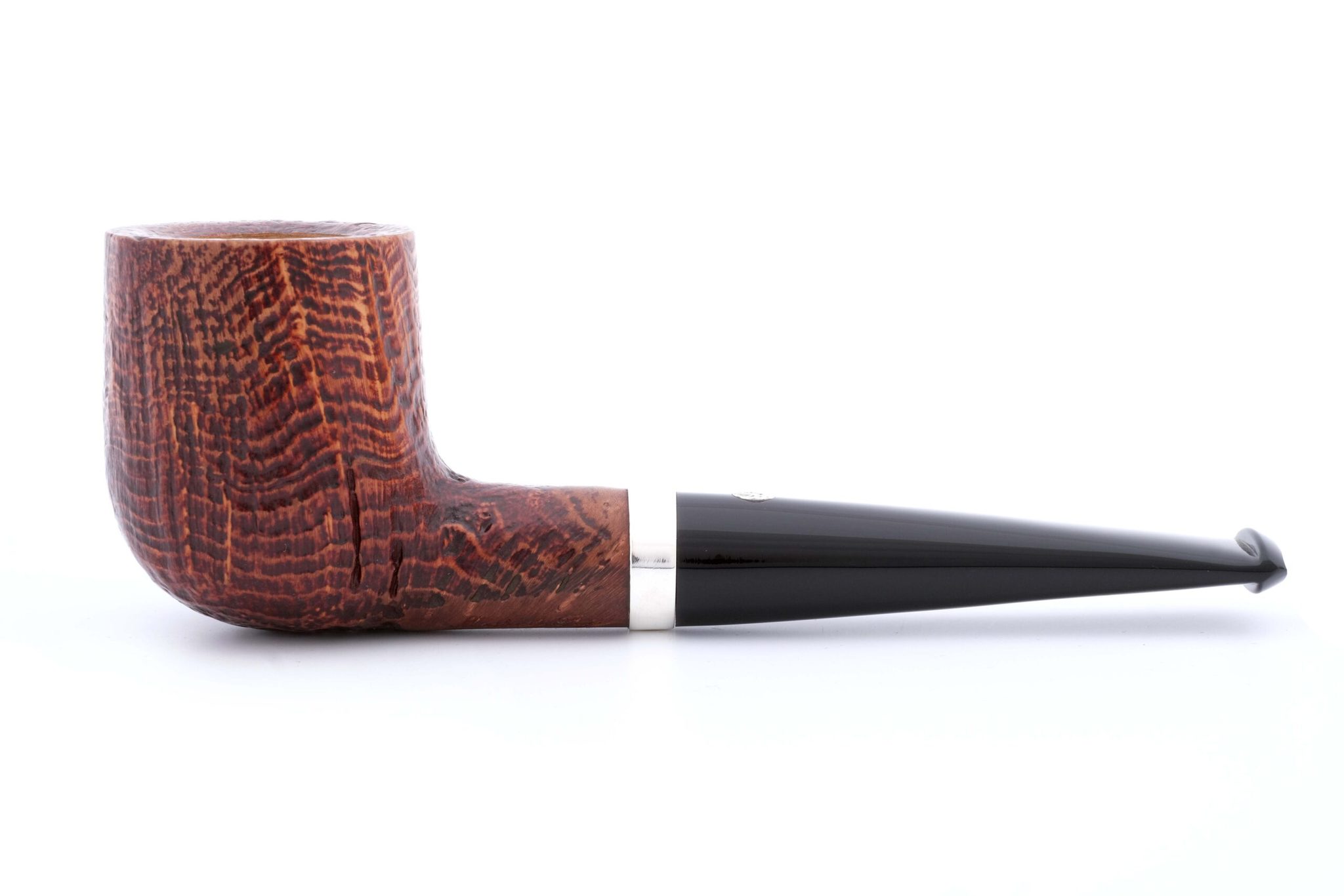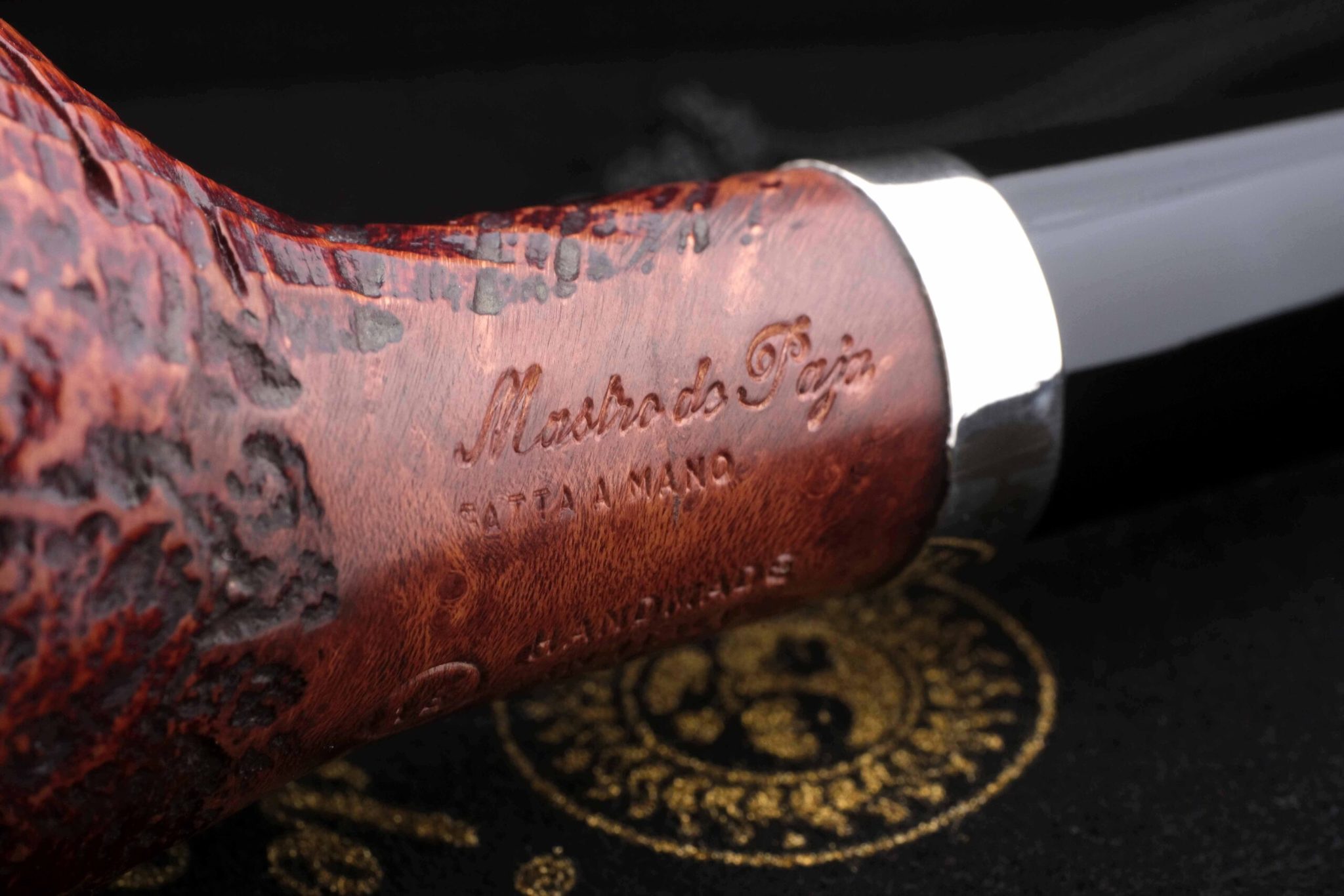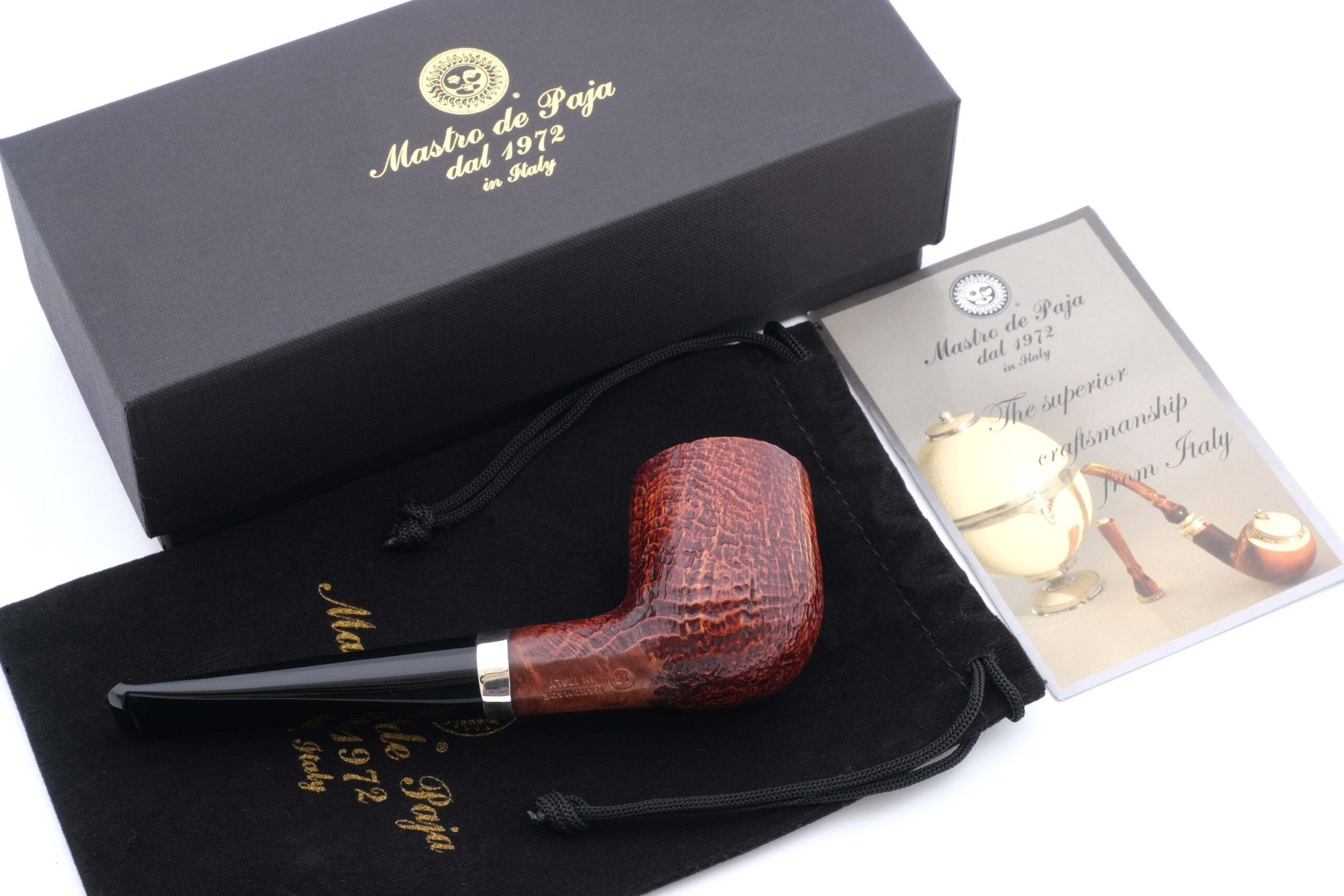 (когда мощная струя измельченного в песок стекла выбивает мягкие частицы корнекапа, оставляя твердые капилляры и придавая осязаемый объем натуральному рисунку бриара, площадь поверхности трубки при этом увеличивается, что способствует лучшему охлаждению чаши и более приятному «прохладному» курению, также снижается и вес трубки). Мундштук — акрил. Кольцо на чубуке — серебро 925 пробы. В комплекте фирменный кисет, подарочная коробка и буклет-каталог компании Mastro de Paja.