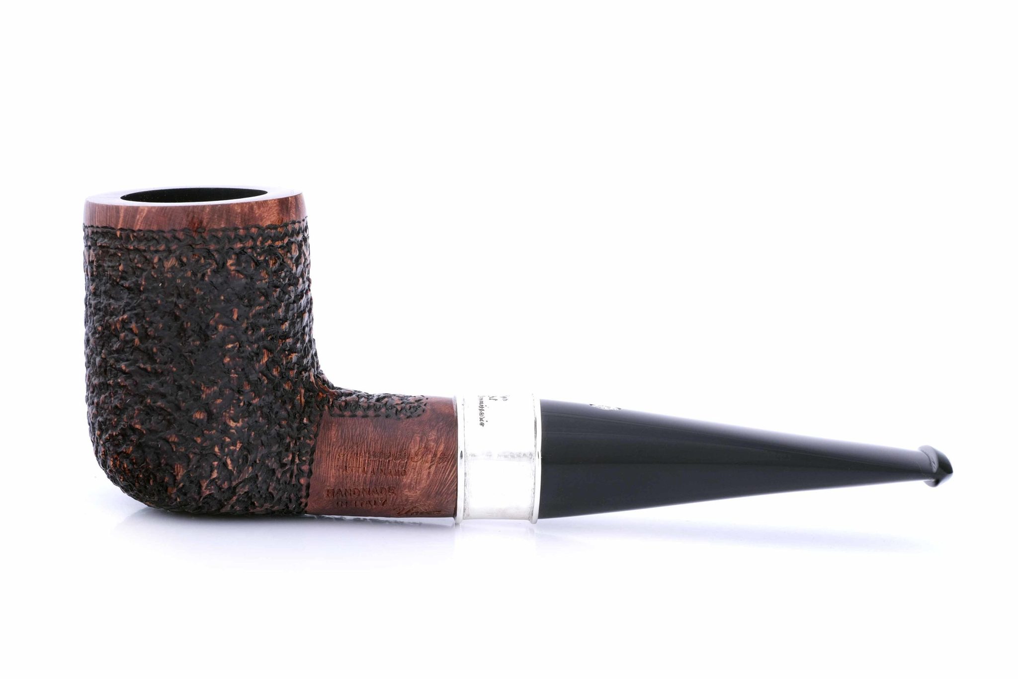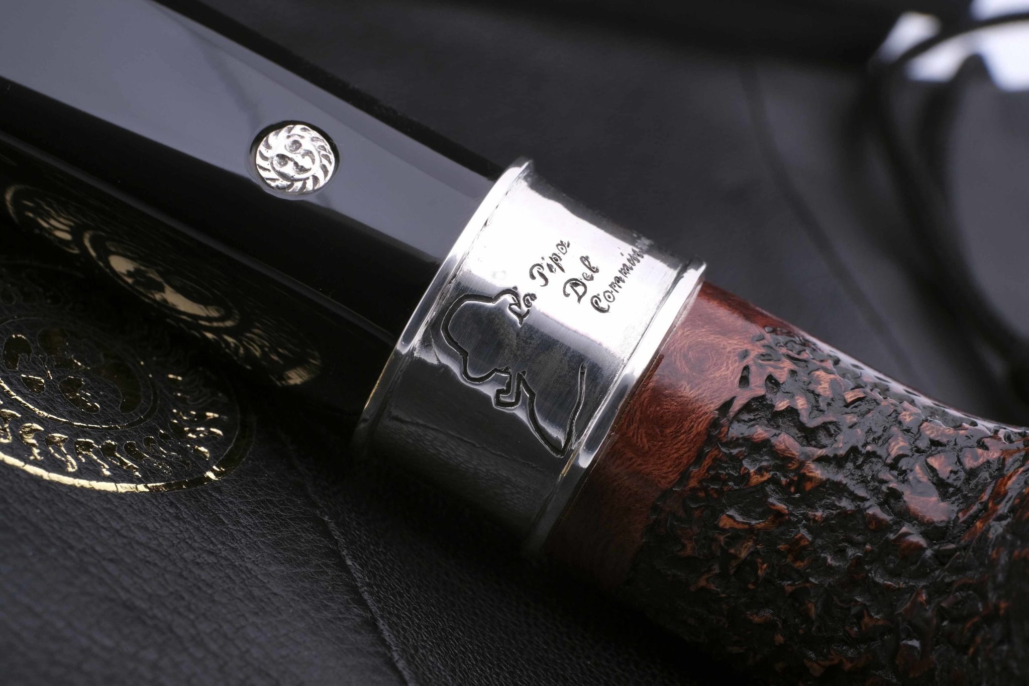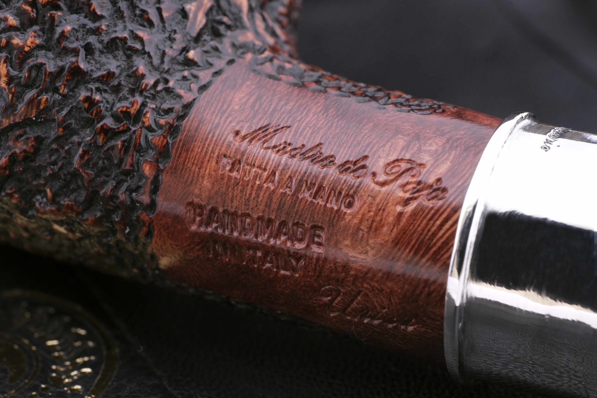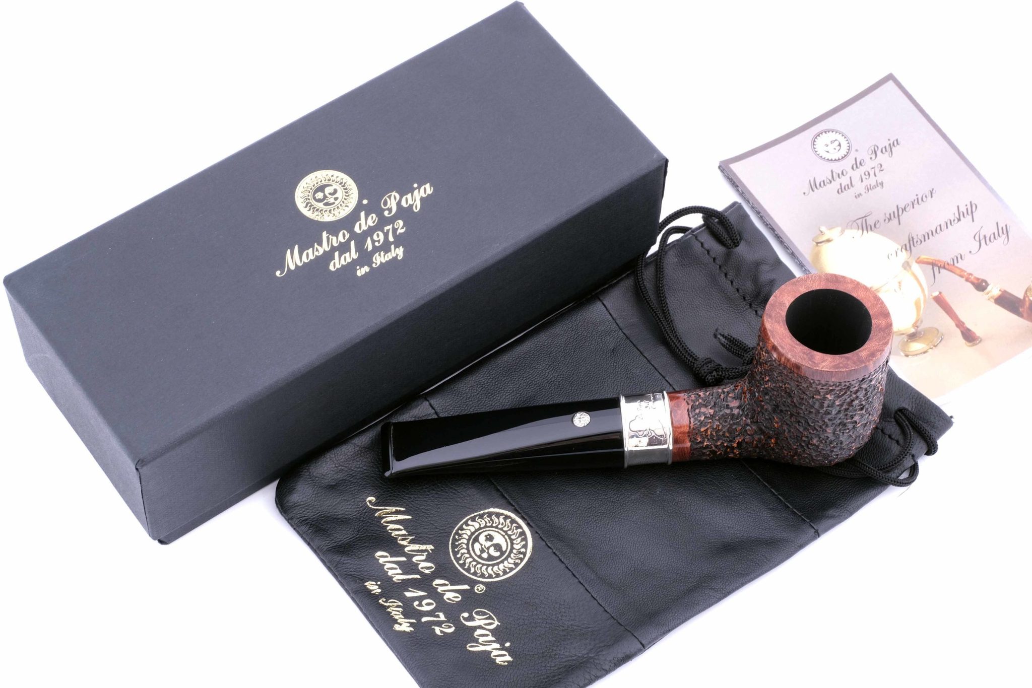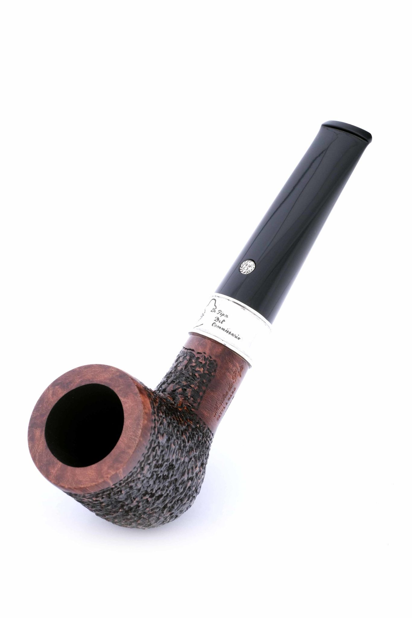 Подобную модель и воссоздали в мастерской Мастро де Пайа, украсив кольцо гравировкой с абрисом Мегрэ и надписью «Трубка Комиссара». Кольцо на чубуке выполнено из серебра 925 пробы. Табачная камера карбонизирована. В комплекте фирменный кисет, подарочная коробка и буклет-каталог компании Mastro de Paja.