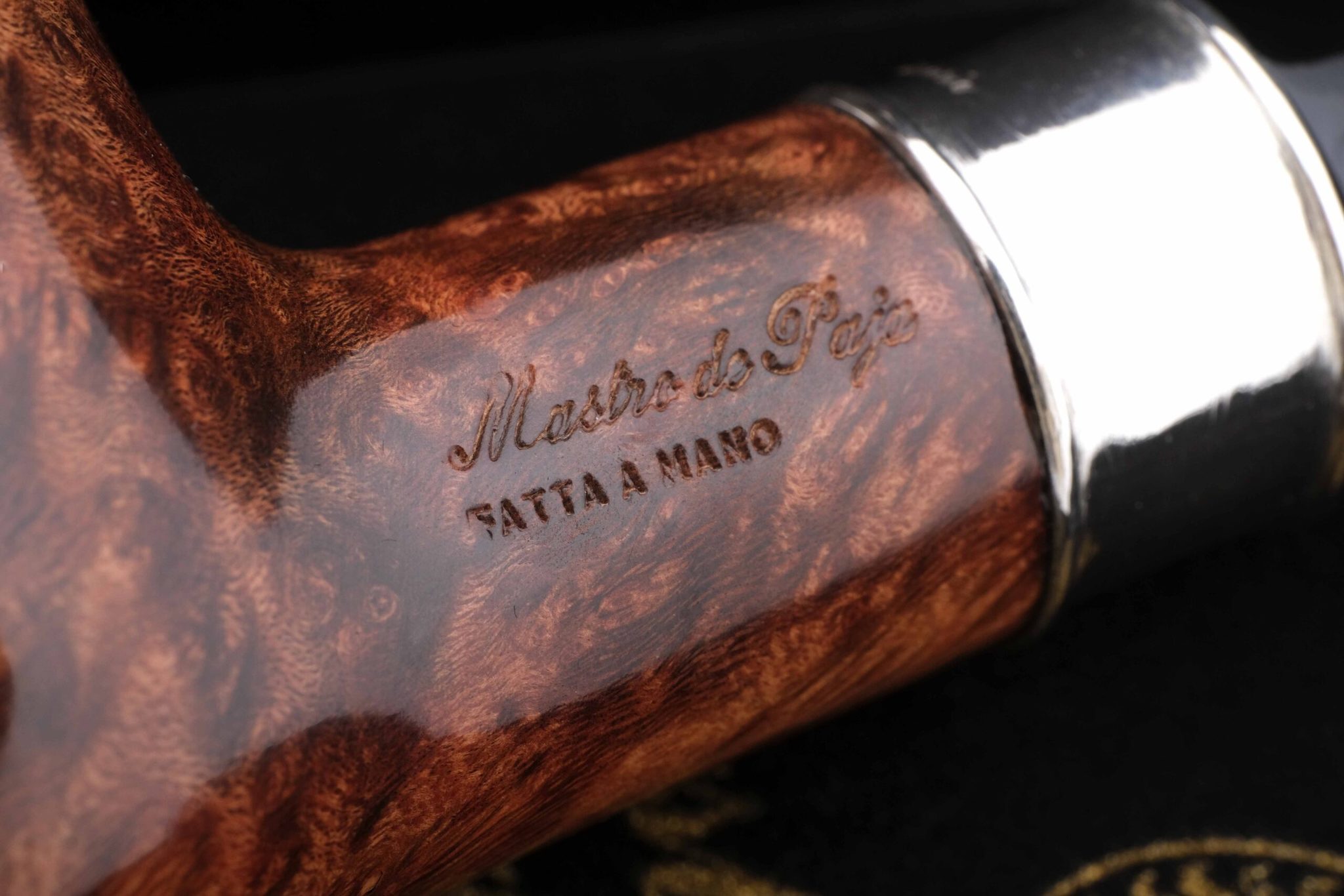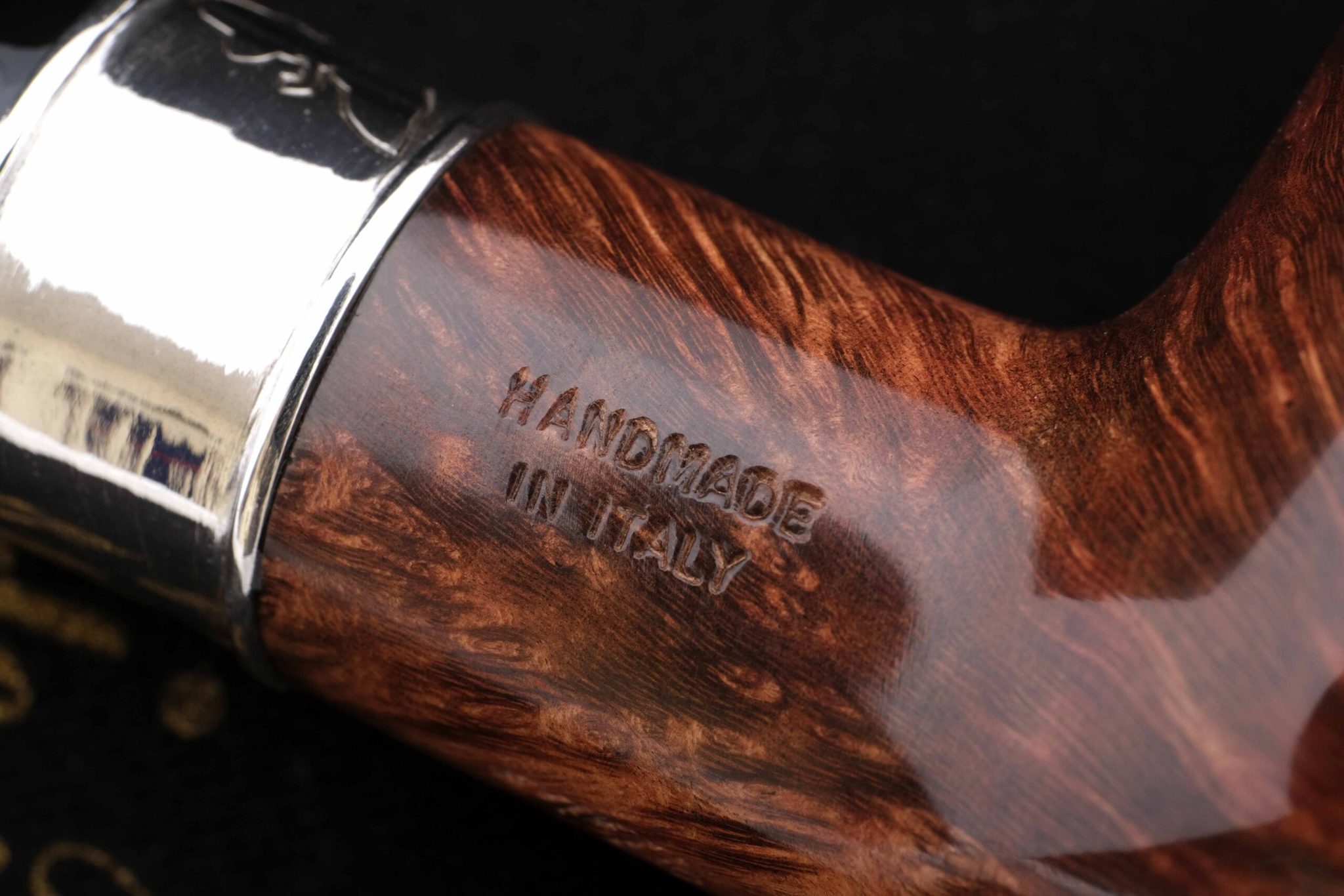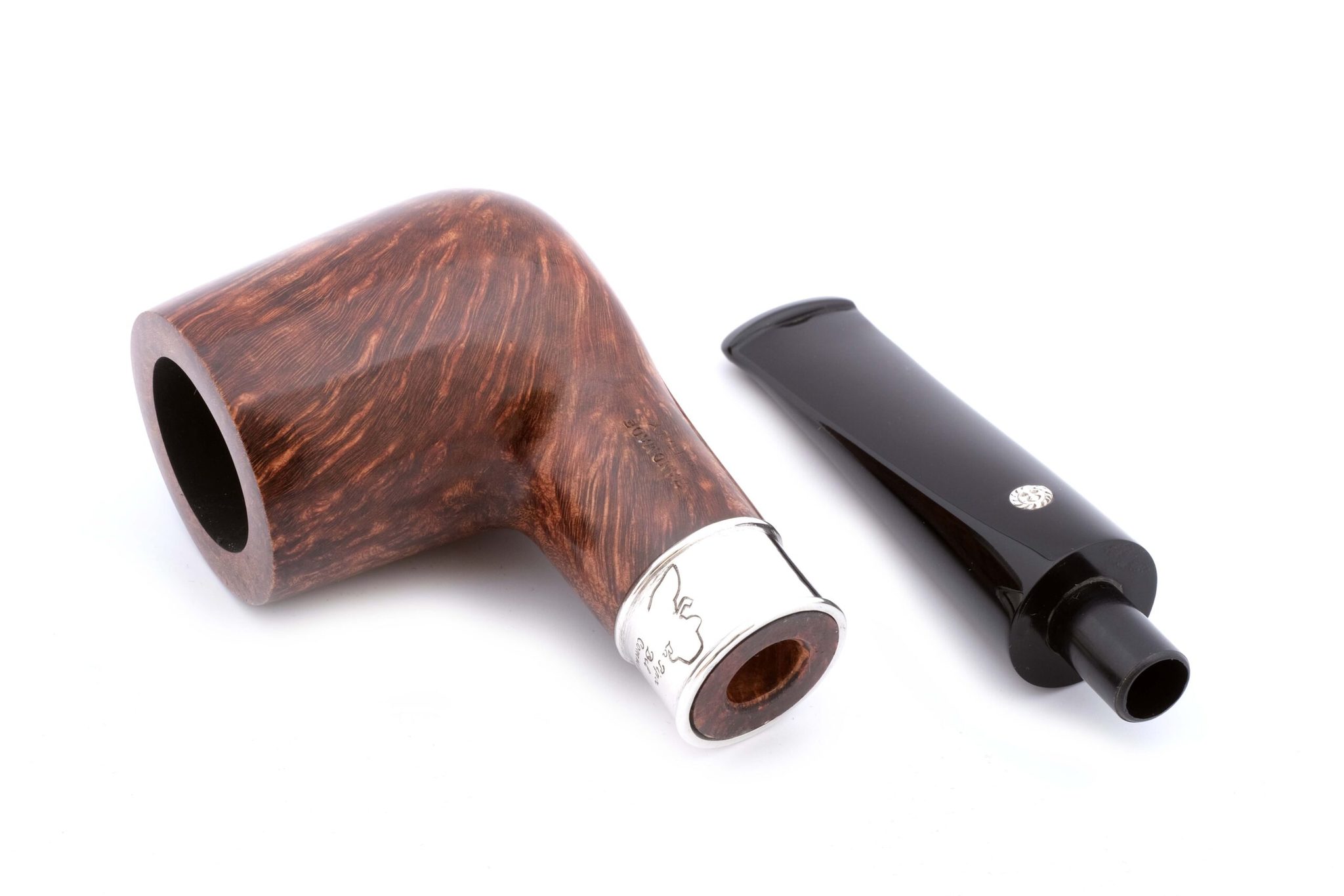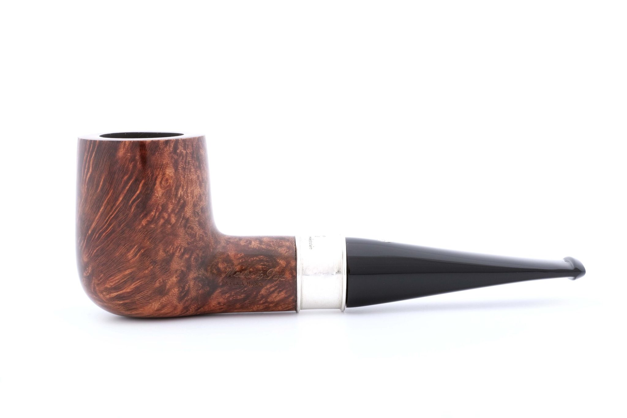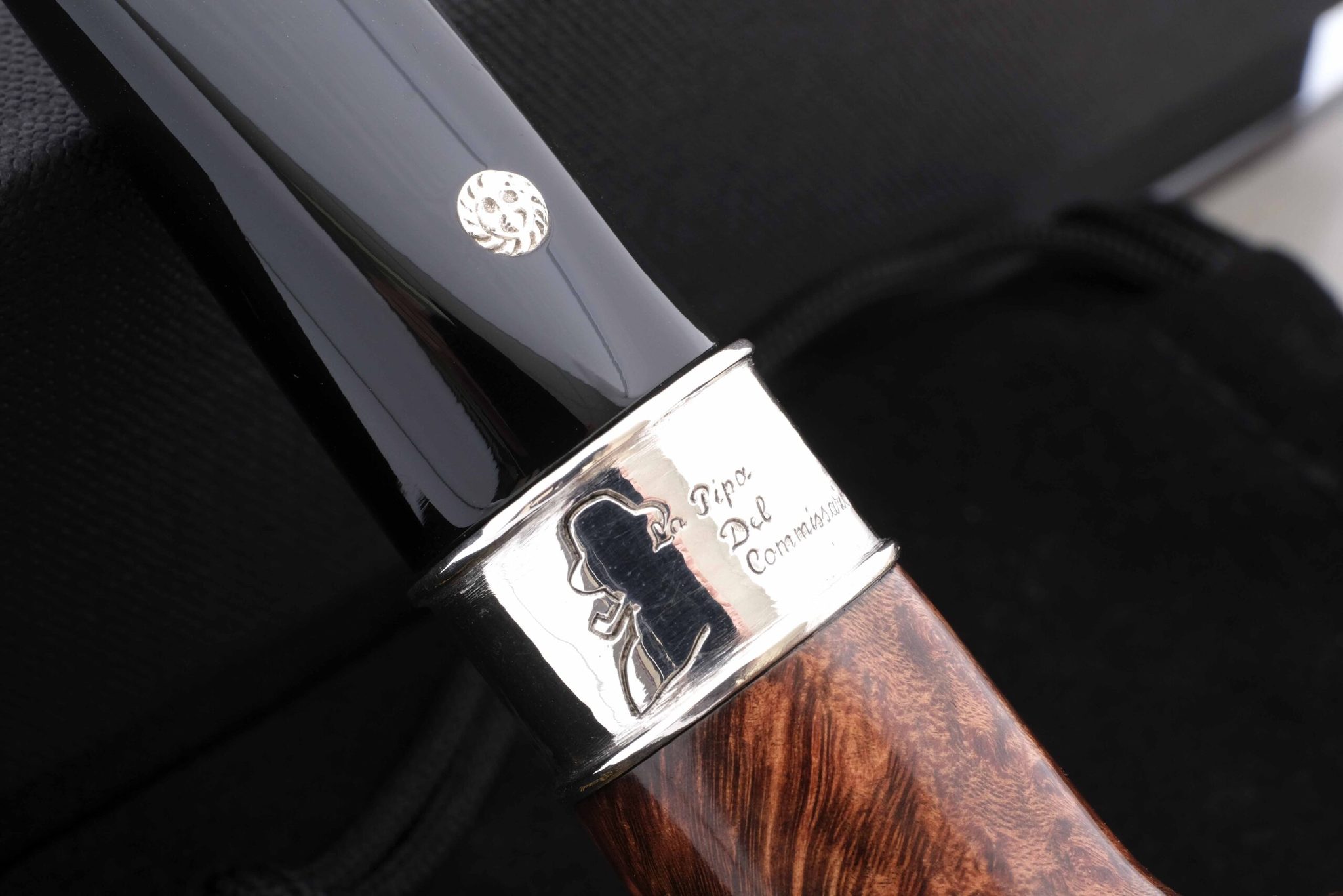 Распутывать сложные дела ему помогала неизменная массивная трубка формы «прямой Бильярд». Подобную модель и воссоздали в мастерской Мастро де Пайа, украсив кольцо гравировкой с абрисом Мегрэ и надписью «Трубка Комиссара». Мундштук — акрил. Кольцо на чубуке выполнено из серебра 925 пробы. В комплекте фирменный кисет, подарочная коробка и буклет-каталог компании Mastro de Paja.