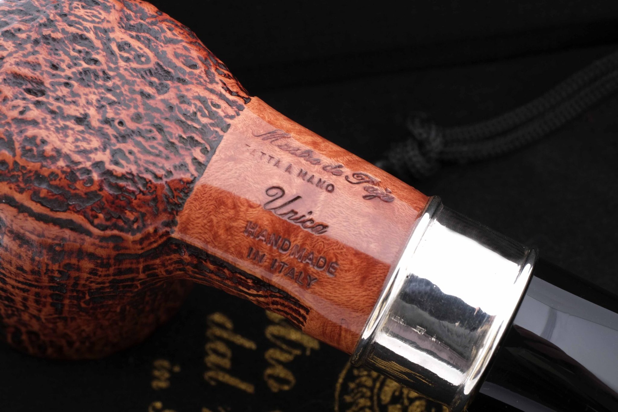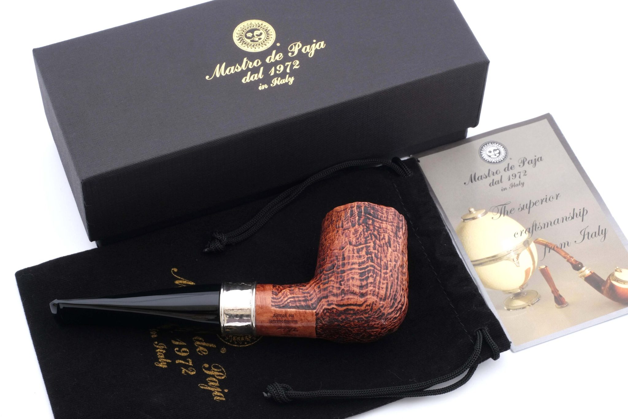 Распутывать сложные дела ему помогала неизменная массивная трубка формы «прямой Бильярд». Подобную модель и воссоздали в мастерской Мастро де Пайа, украсив кольцо гравировкой с абрисом Мегрэ и надписью «Трубка Комиссара». Модель выпущена ограниченной серией с вариантами отделки: гладкая, сэндбласт и рустик. Сэндбласт придает осязаемый объем натуральному рисунку бриара. Площадь поверхности трубки при этом увеличивается, что способствует лучшему охлаждению чаши и более приятному «прохладному» курению. Также снижается и вес трубки. Мундштук — акрил. Кольцо на чубуке выполнено из серебра 925 пробы. В комплекте фирменный кисет, подарочная коробка и буклет-каталог компании Mastro de Paja.