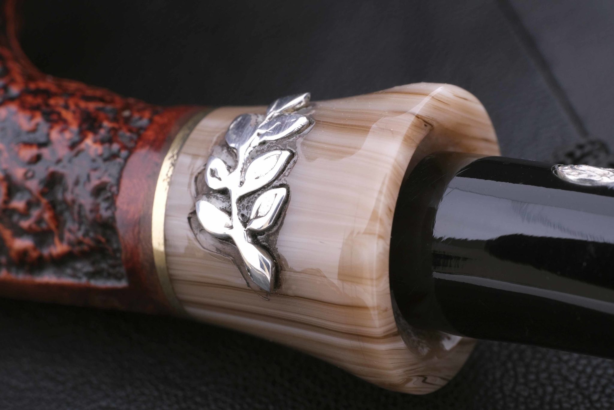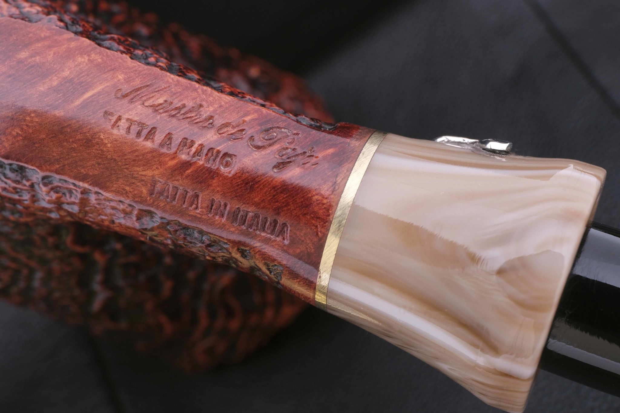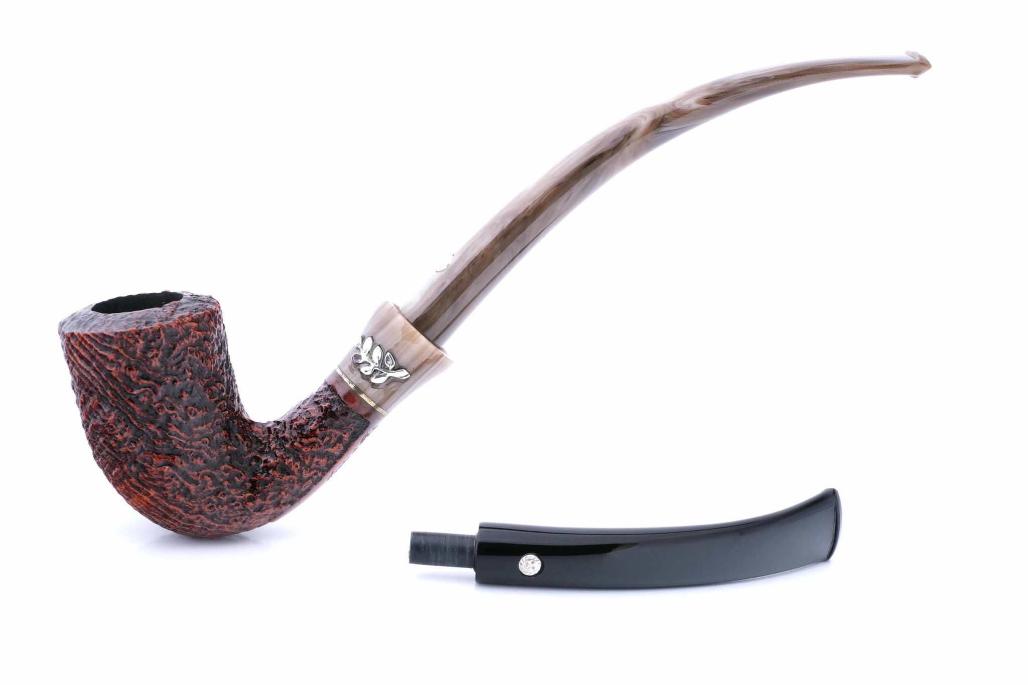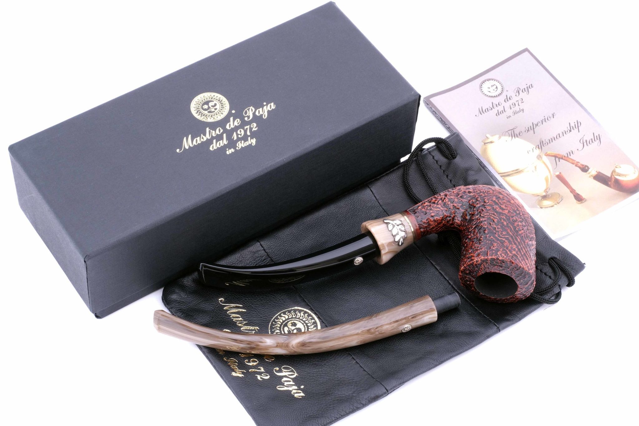 Вставки на мундштуке — из серебра 925 пробы. Табачная камера карбонизирована. В комплекте фирменный кожаный кисет, подарочная коробка и буклет-каталог компании Mastro de Paja.