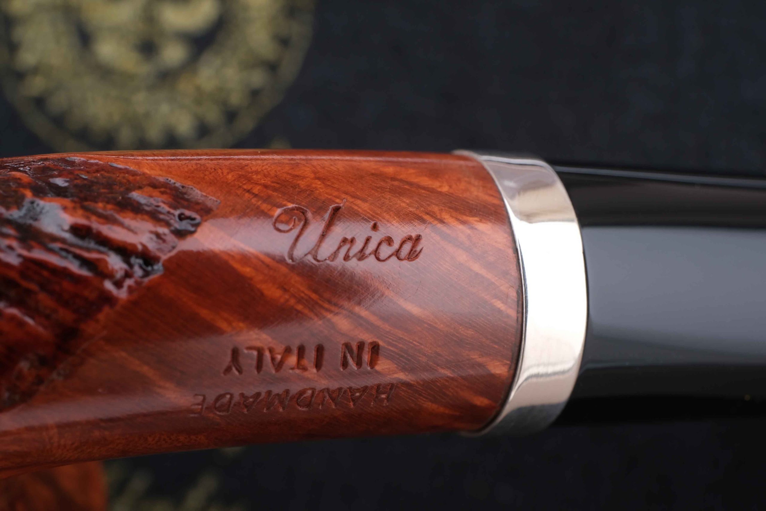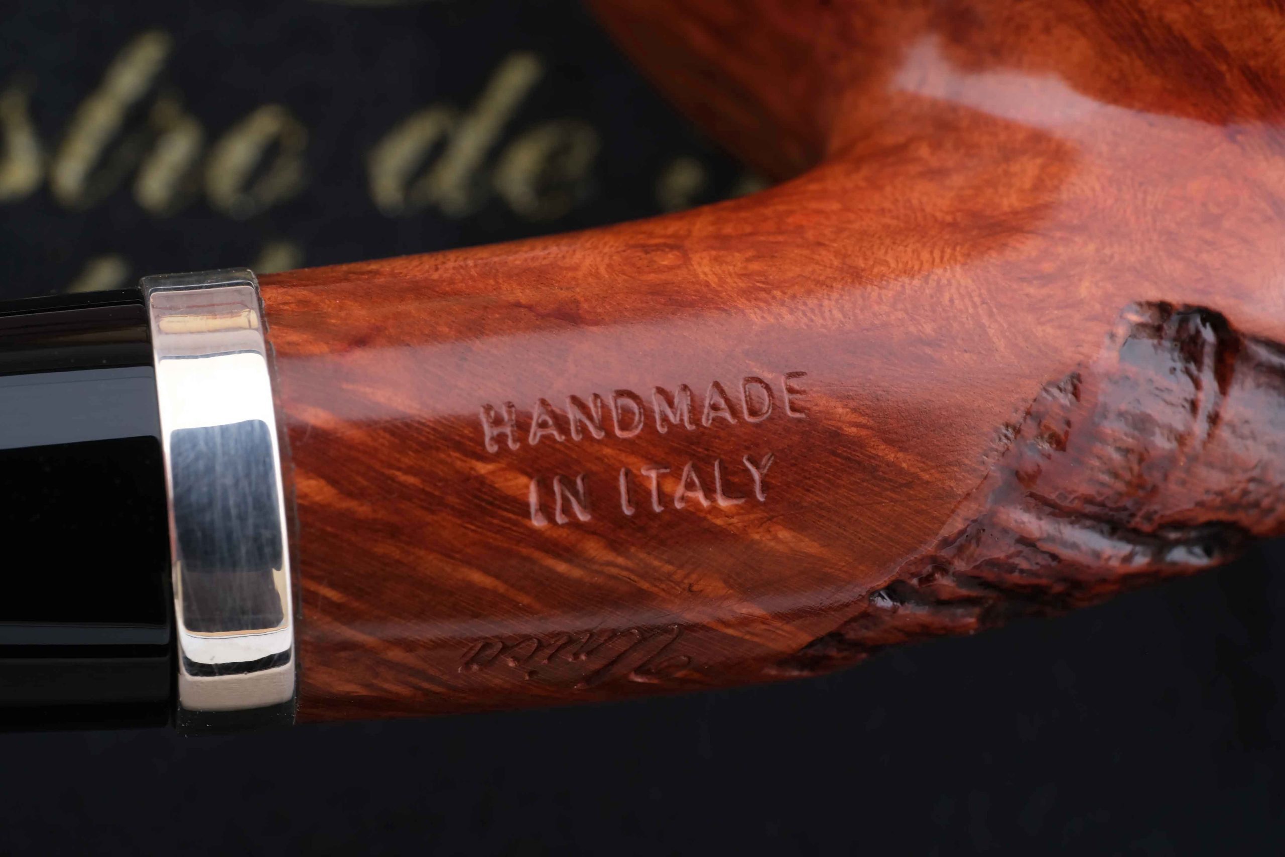 Легкая и изящная трубка из мастерской Мастро де Пайа. Принадлежит к лимитированной серии Unica, где каждый экземпляр неповторим, имея свой индивидуальный дизайн.