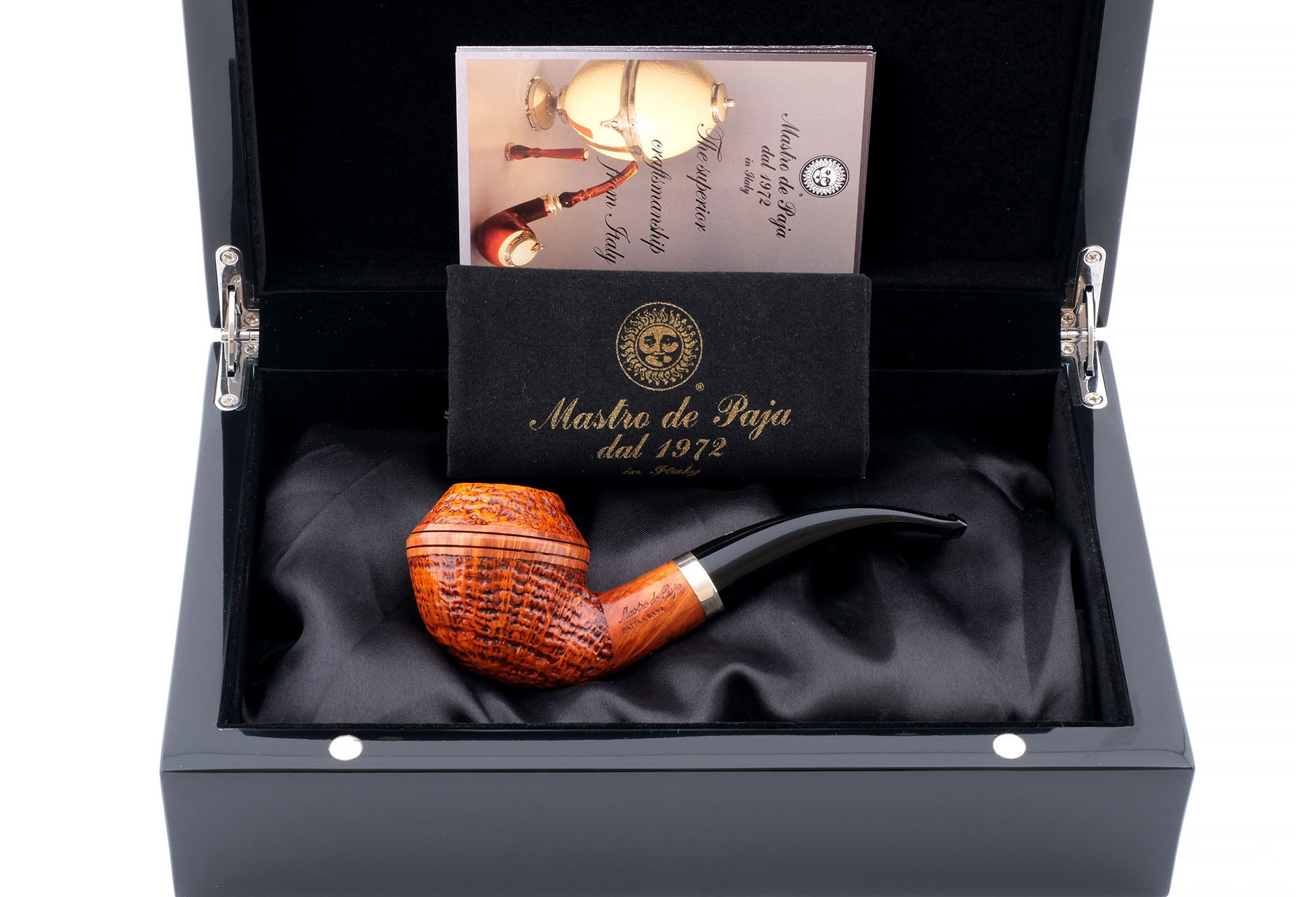 В комплекте итальянская подарочная шкатулка в черном глянцевом лаке, кисет для трубки и буклеты компании. Ручная работа, единственный экземпляр.