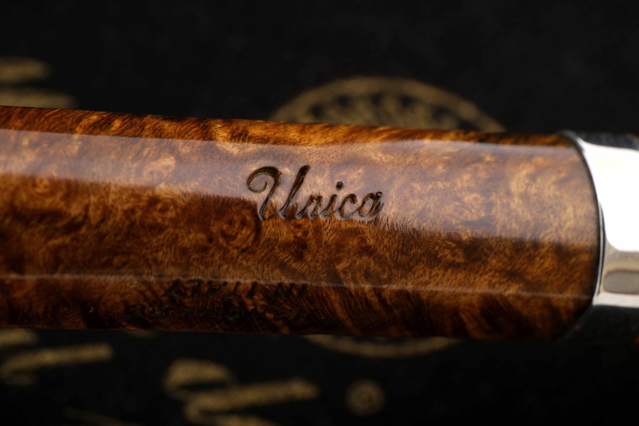 Мундштук — цветной акрил. Кольцо на чубуке выполнено из серебра 925 пробы. В комплекте фирменный кисет и подарочная коробка. Ручная работа, единственный экземпляр.