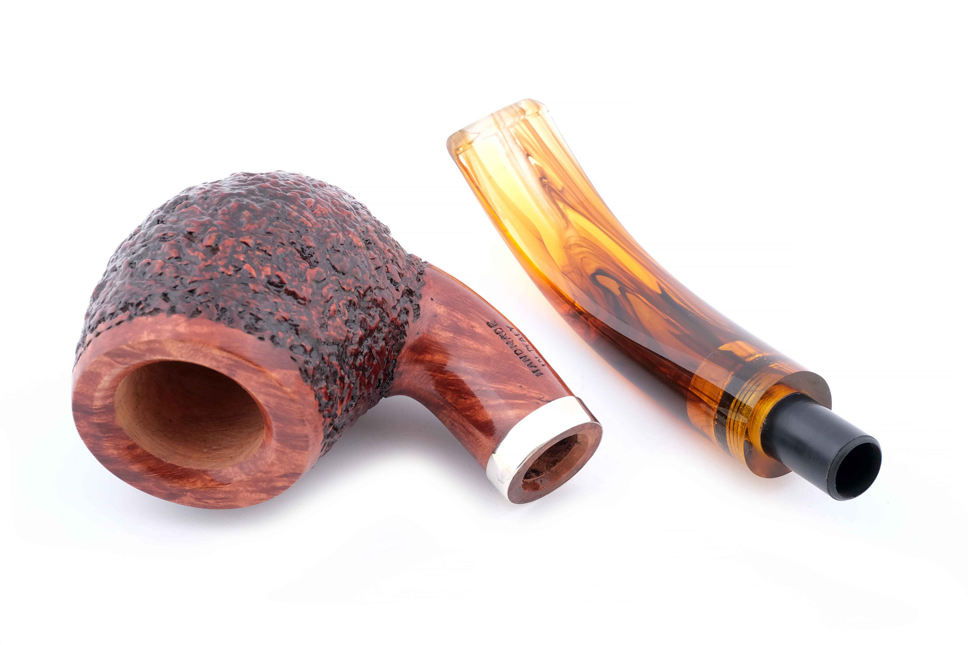 Мундштук — янтарный акрил. Кольцо на чубуке и фирменная эмблема на мундштуке- серебро 925 пробы.
