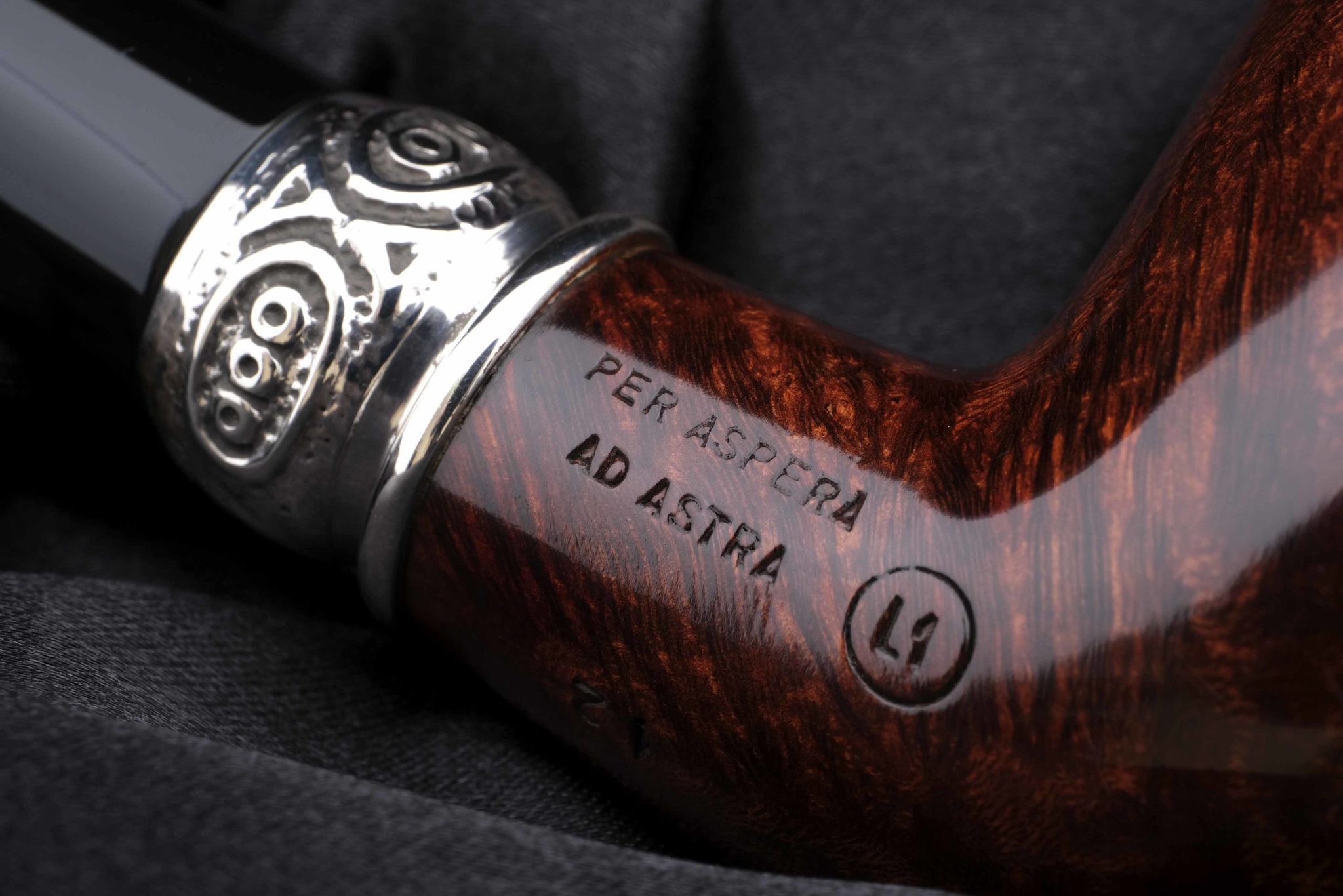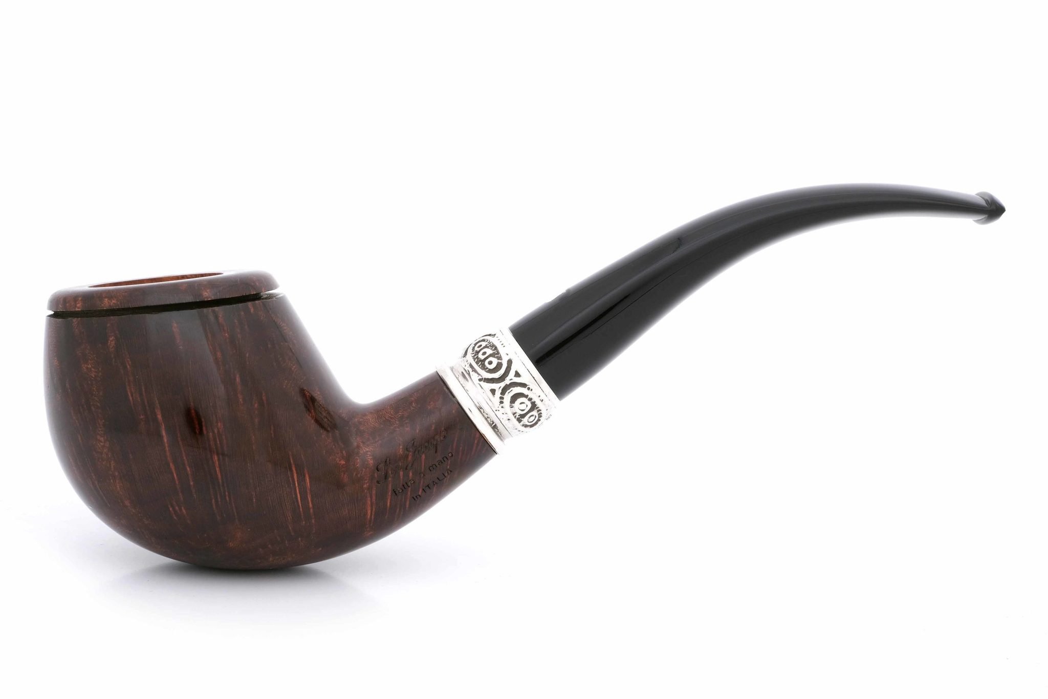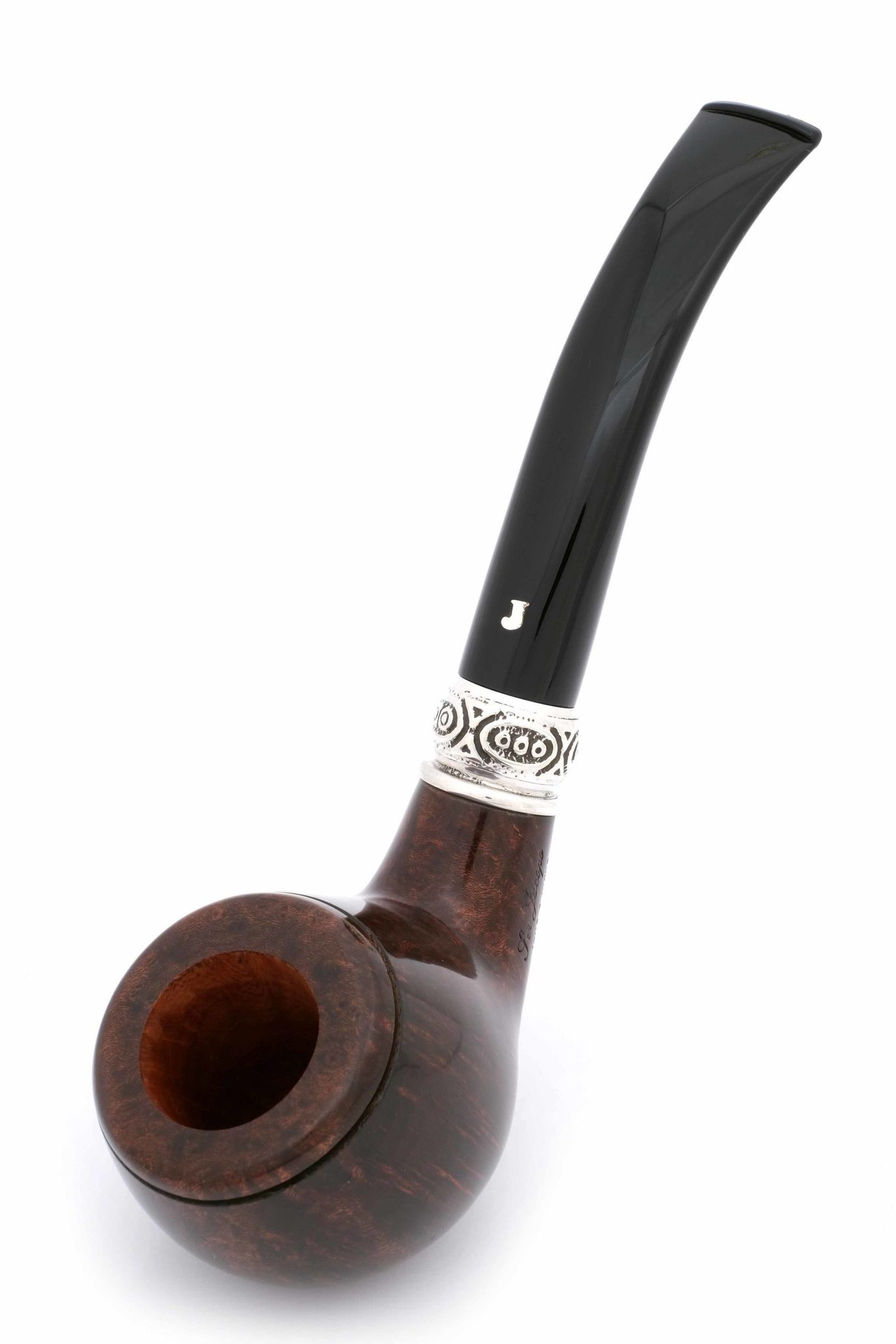 Кольцо на чубуке модели Lacus выполнено из серебра 925. Серия изготовлена ограниченной партией в 100 шт. Данная трубка имеет № 12. В комплекте итальянская подарочная шкатулка в черном глянцевом лаке, кисет для трубки и буклеты компании Ser Jacopo.