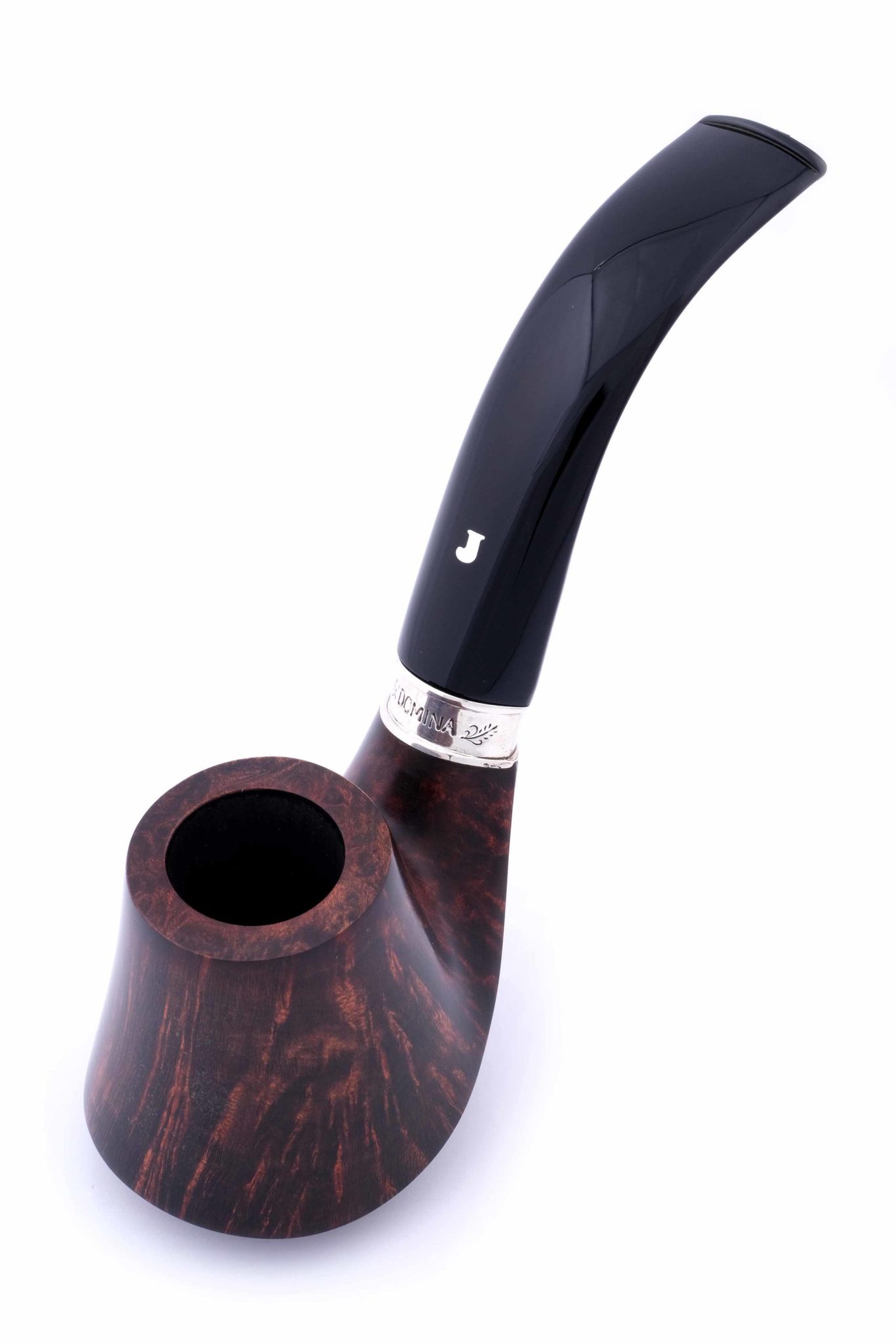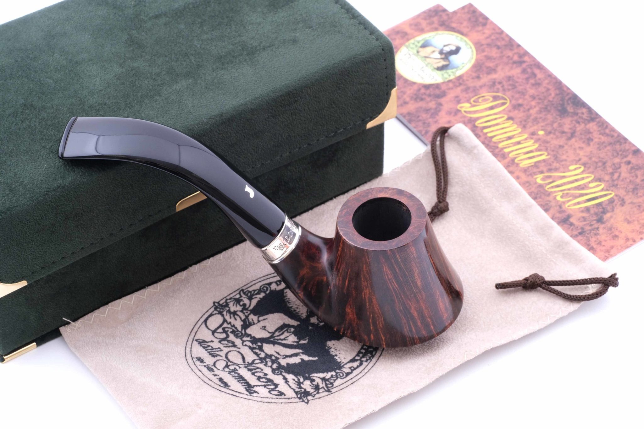 Кольцо на чубуке из серебра 925 пробы с гравировкой DOMINA 2020 и Ser Jacopo. На трубке снизу выбит девиз мастерской PER ASPERA AD ASTRA («Через тернии к звездам», лат.), маркировки: Ser Jacopo, Hand made in Italy, градация — R1 D, серия Domina 2020 и порядковый номер 28. Мундштук из акрила. В комплекте подарочная коробка, кисет для трубки и буклет компании Ser Jacopo.