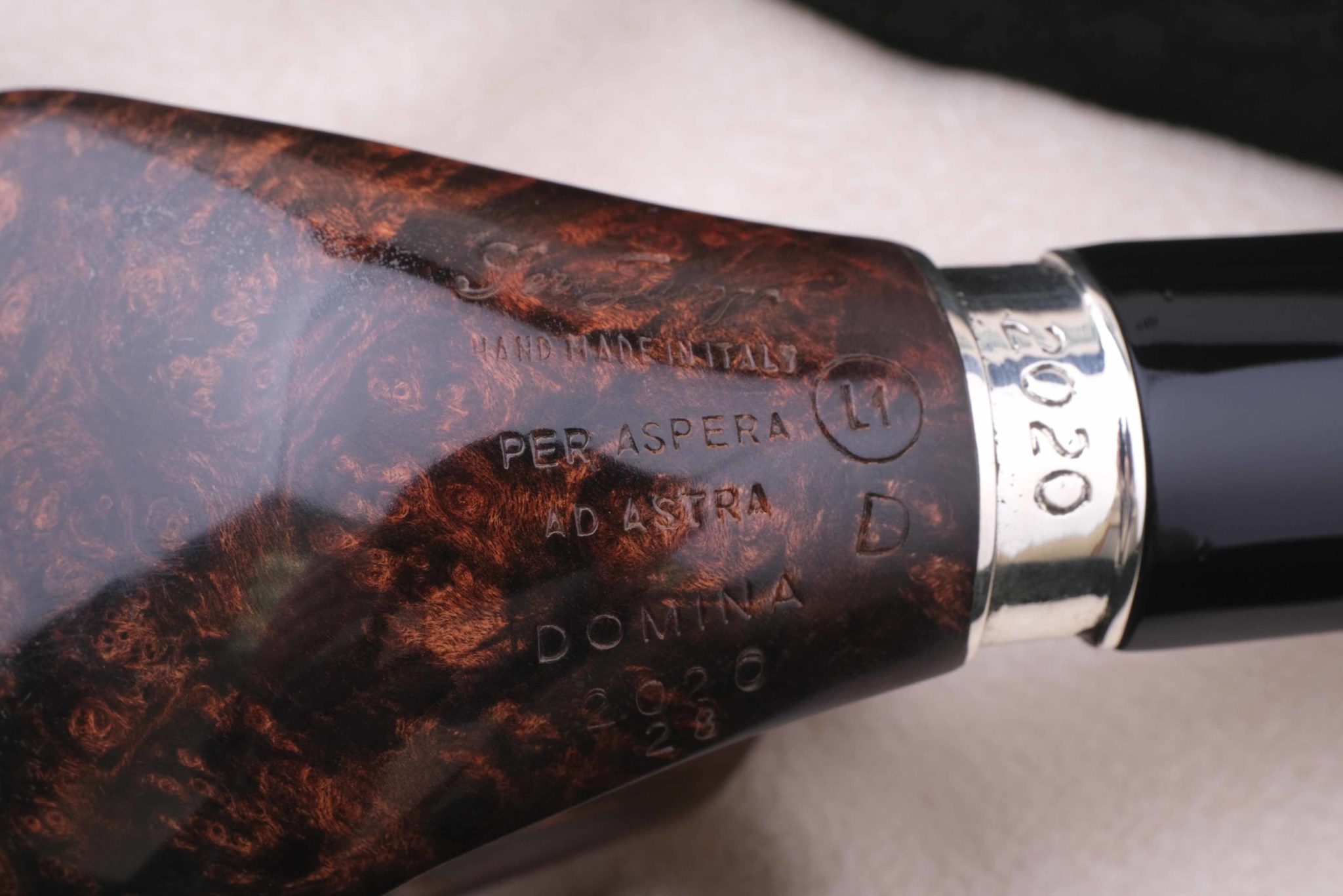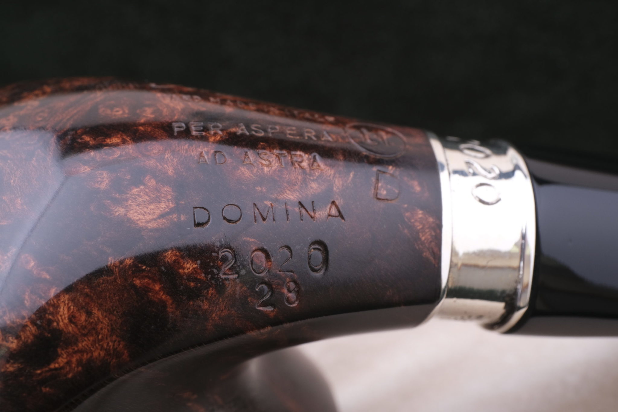 Трубка лимитированной серии 2020 года DOMINA («доминирующая», «царящая», ит.). Выпущено всего 330 штук в разных вариантах отделки, каждая с уникальным порядковым номером. Данная трубка имеет номер 28.