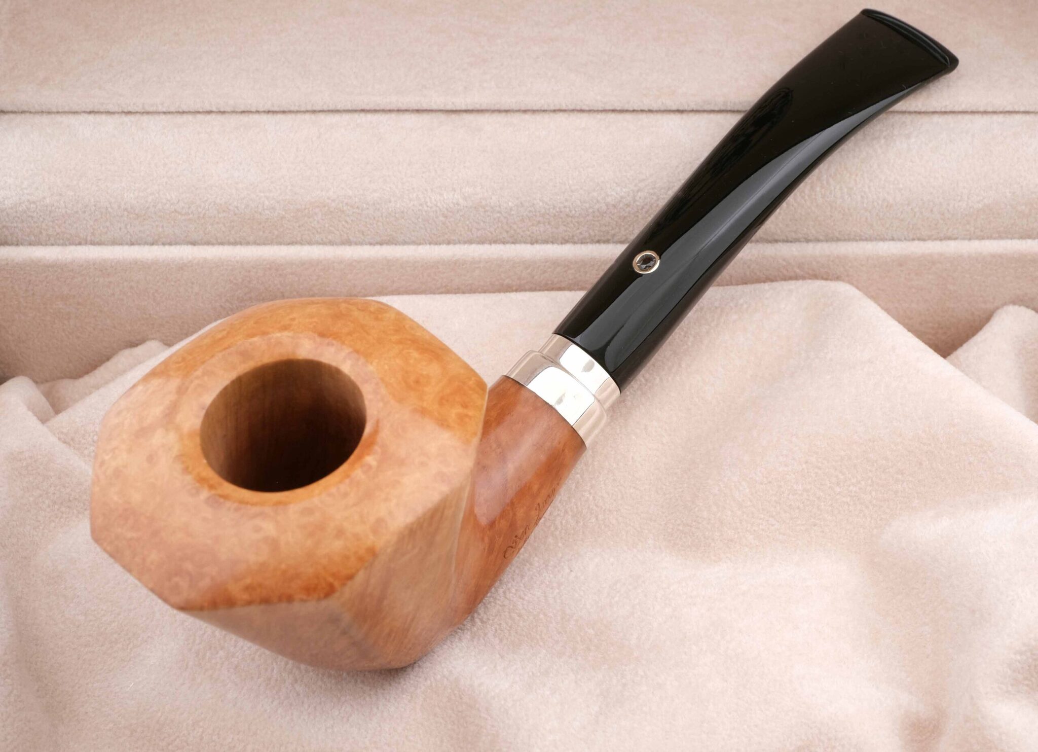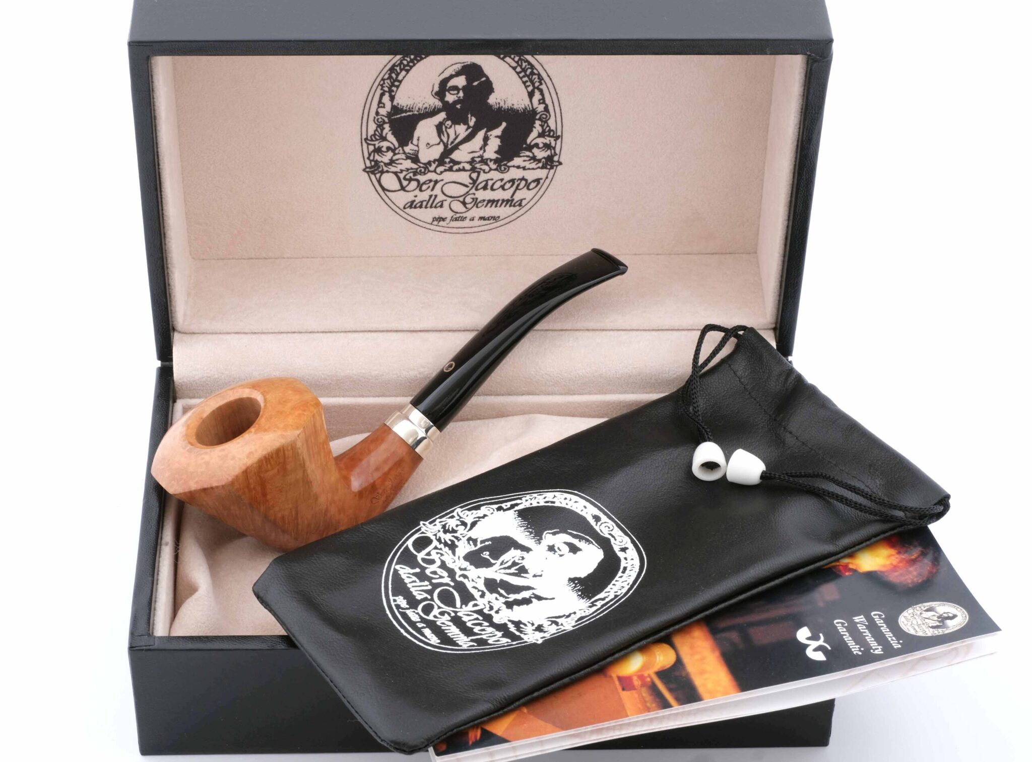 Авторская курительная трубка оригинальной формы Freehand высшего уровня Fiammata в классификации Ser Jacopo. Fiammata означает плотный равномерный рисунок "венатуры" бриара по всей чашке, похожий на пламя (la fiamma), что встречается довольно редко и ценится очень высоко. Экстраординарность трубки подчеркивается украшением мундштука драгоценным камнем (гранатом) в серебряной оправе вместо обычной буквы J. Двойное кольцо на чубуке и мундштуке выполнено из массива серебра 925 пробы. Трубка выполнена в единственном экземпляре. Фильтр 3 мм. Вес 60 гр. Длина трубки 15 см. Высота чашки 54 мм. Диаметр табачной камеры 20 мм., глубина 44 мм. В комплекте подарочная шкатулка, кисет для трубки и буклеты компании Ser Jacopo.