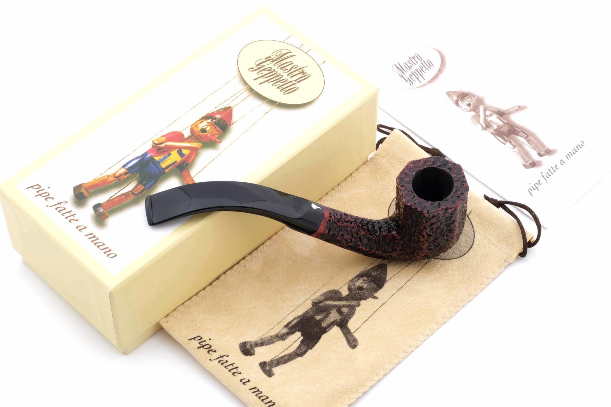 Авторская курительная трубка мастерской Ser Jacopo из серии Mastro Geppetto (Мастер Джузеппе, ит.). Серия посвящена всем итальянским резчикам по дереву в лице, пожалуй, самого известного из них - Мастера Джузеппе, создателя и отца Пиноккио из одноименной сказки Карло Коллоди. Серия оформлена в бело-желтых цветах парика, который носил Джузеппе, а вместо значка J (Jacopo) на мундштуке используется профиль Пиноккио из серебра 925 пробы. Также изображение самой известной итальянской куклы присутствует на серебряных кольцах и упаковке. Большинство трубок этой серии выполнено в технике рустирования (Rusticato), которая до сих пор выполняется ручными резцами, требует времени, силы и, конечно, мастерства резчика. Мундштук из акрила. Фильтр 3 мм. Вес 54 грамма. Длина трубки 16 см. Высота чашки 55 мм. Диаметр табачной камеры 20 мм., глубина 45 мм. В комплекте подарочная коробка, кисет для трубки и буклет компании Ser Jacopo. Ручная работа, единственный экземпляр.