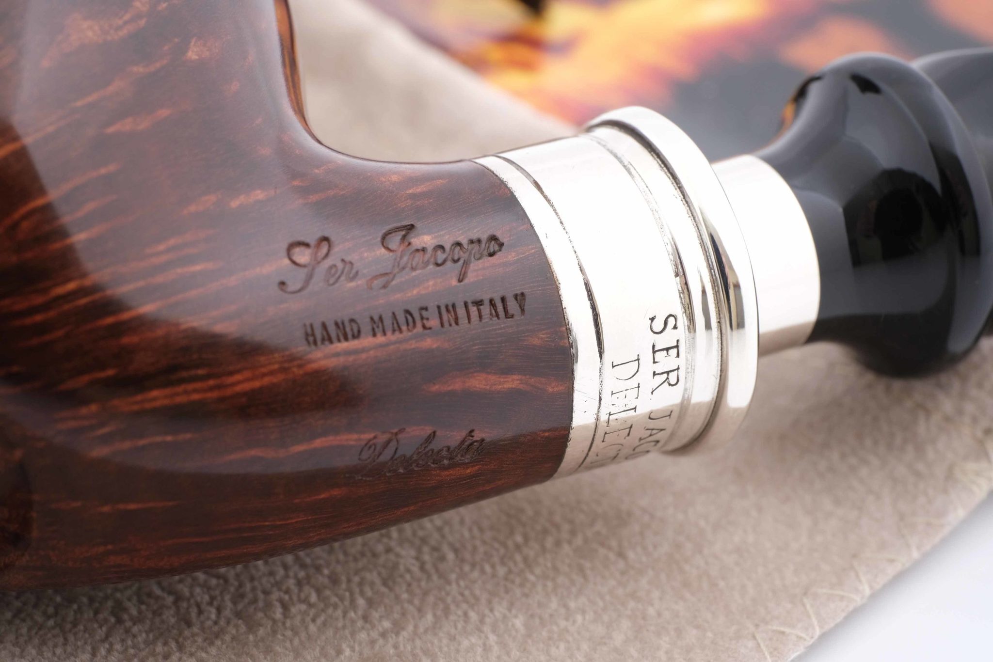 Классическая трубка Ser Jacopo серии Delecta. Двойное кольцо типа Delecta на чубуке и мундштуке выполнено из серебра 925 пробы. На трубке выбит девиз мастерской Ser Jacopo PER ASPERA AD ASTRA («Через тернии к звездам», лат.), маркировки: Ser Jacopo, Hand made in Italy, грэйд L1.