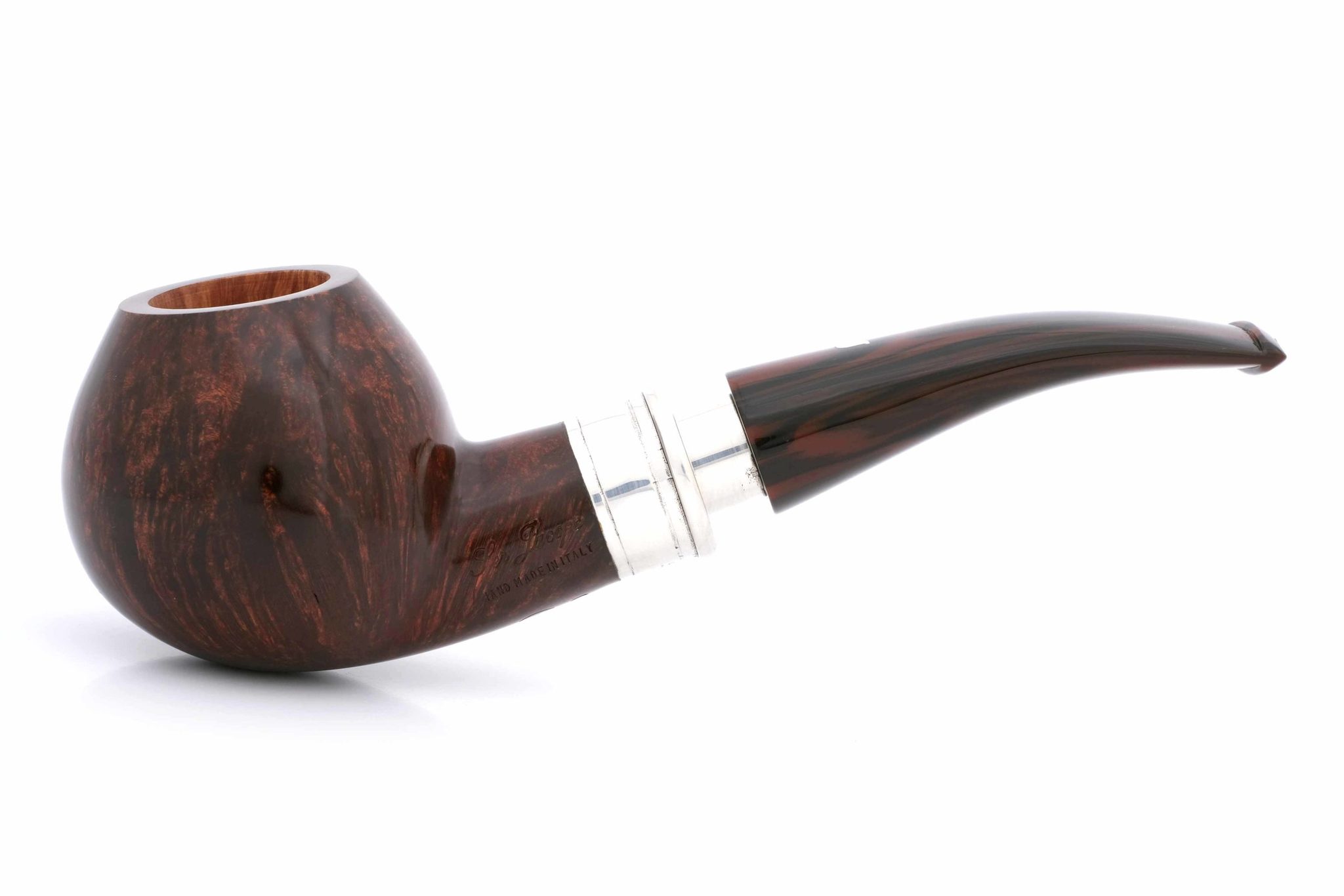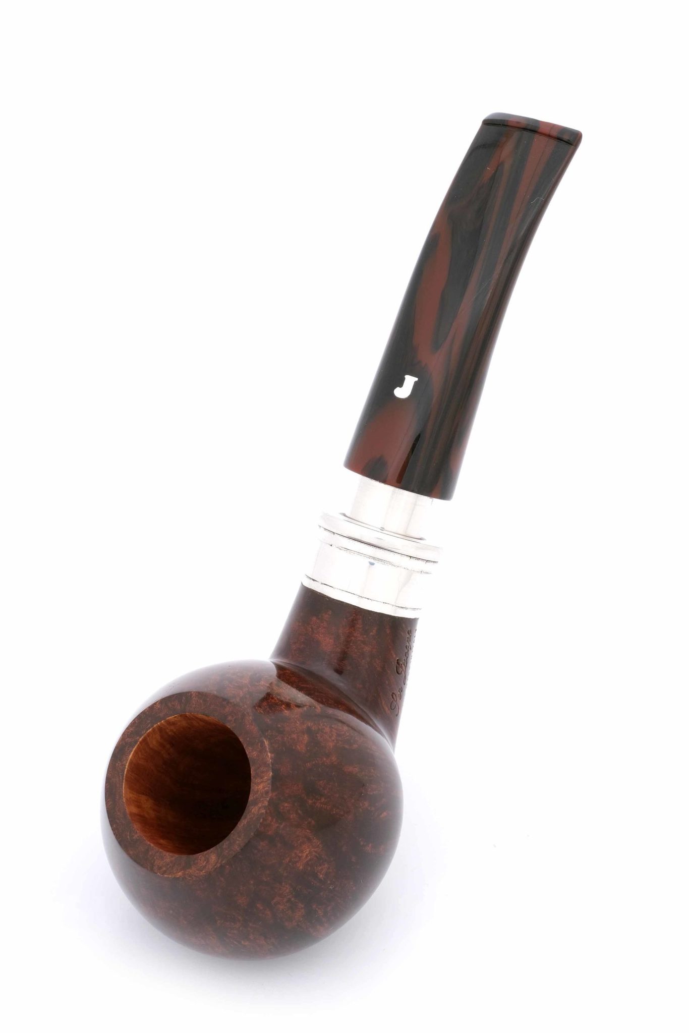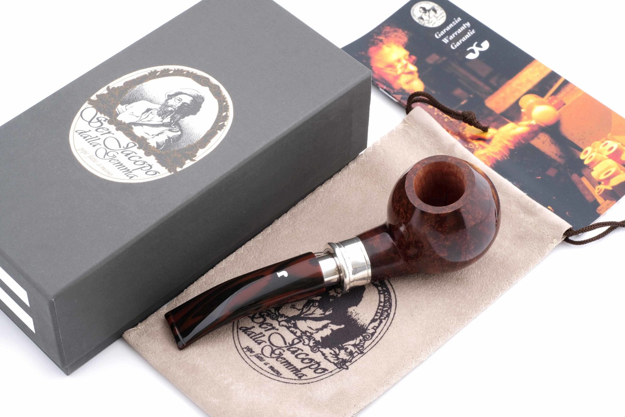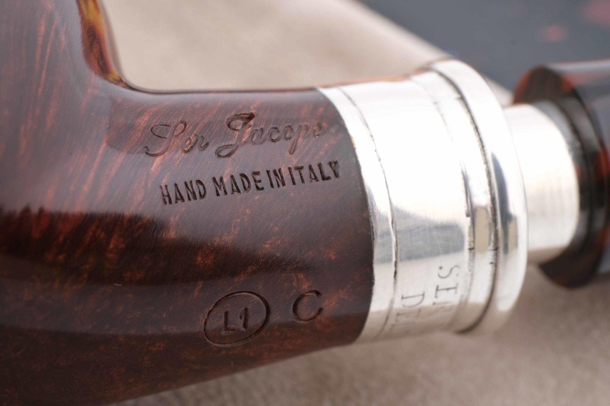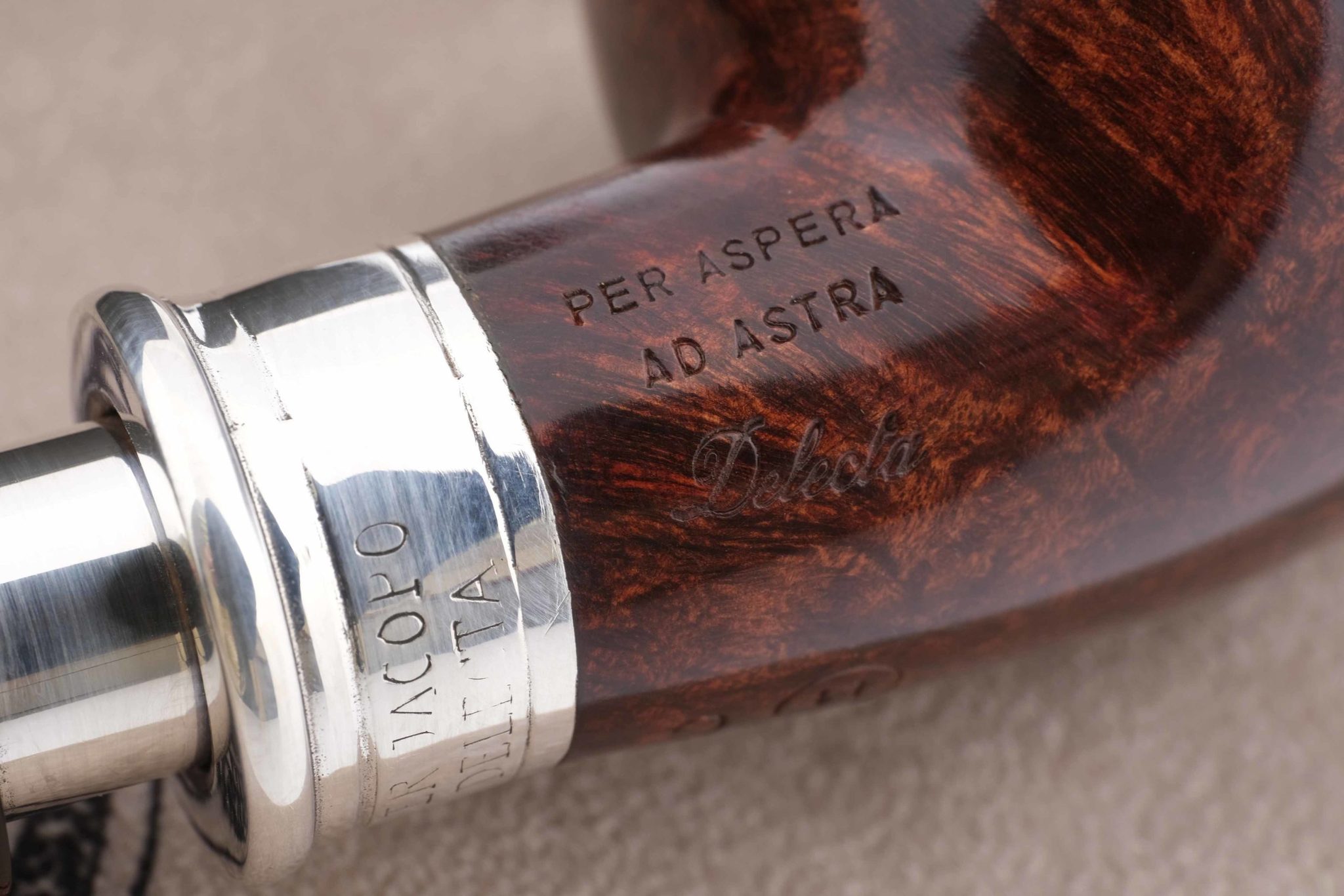 Классическая трубка Ser Jacopo серии Delecta. Двойное кольцо типа Delecta на чубуке и мундштуке выполнено из серебра 925 пробы. На трубке выбит девиз мастерской Ser Jacopo PER ASPERA AD ASTRA («Через тернии к звездам», лат.), маркировки: Ser Jacopo, Hand made in Italy, грэйд L1.