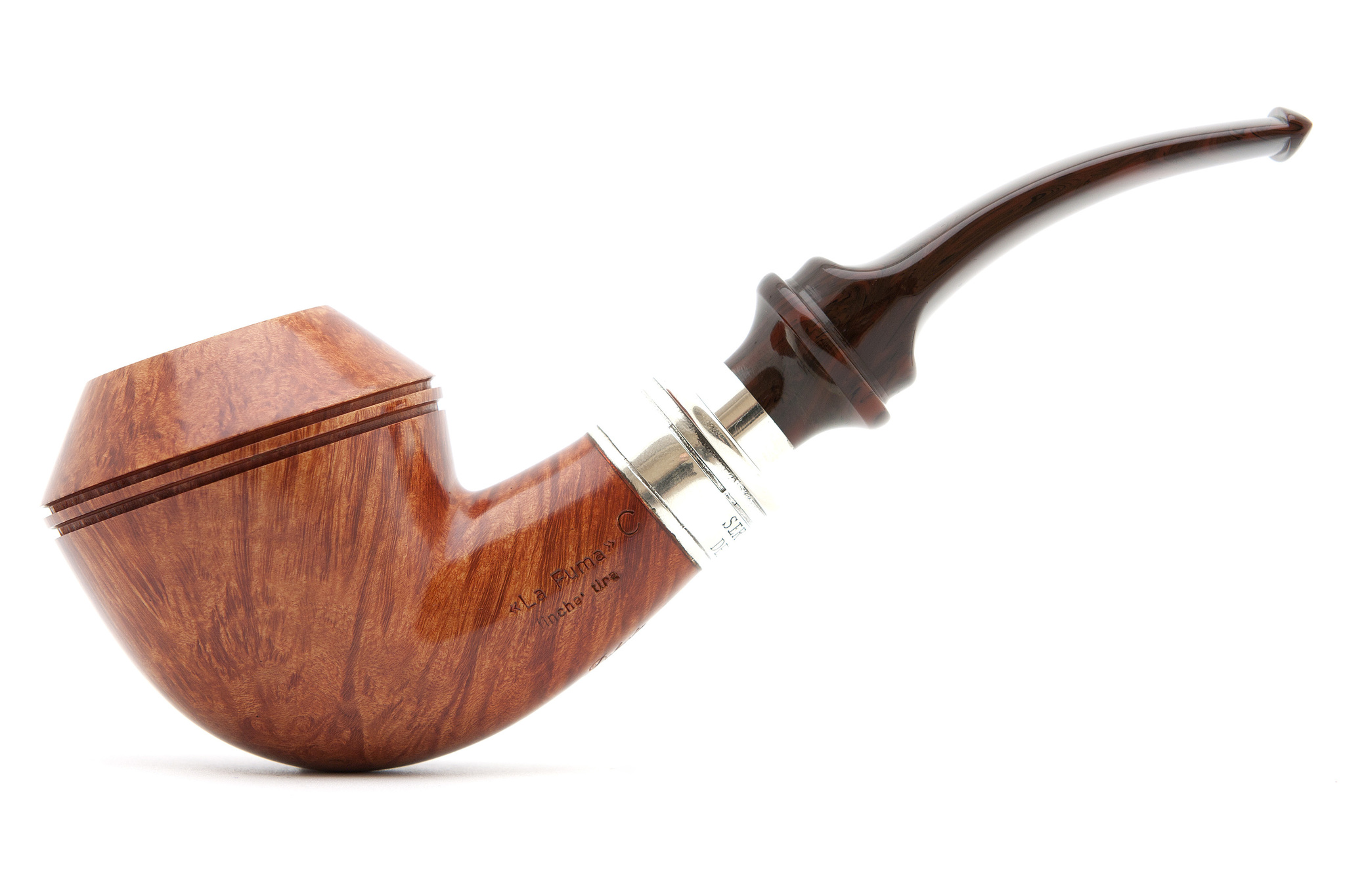 Итальянская трубка премиум класса модели La Fuma Delecta Bulldog. Мундштук с кольцом типа «спигот» из серебра 925 пробы. Кольцо на чубуке модели Delecta из серебра 925 пробы.