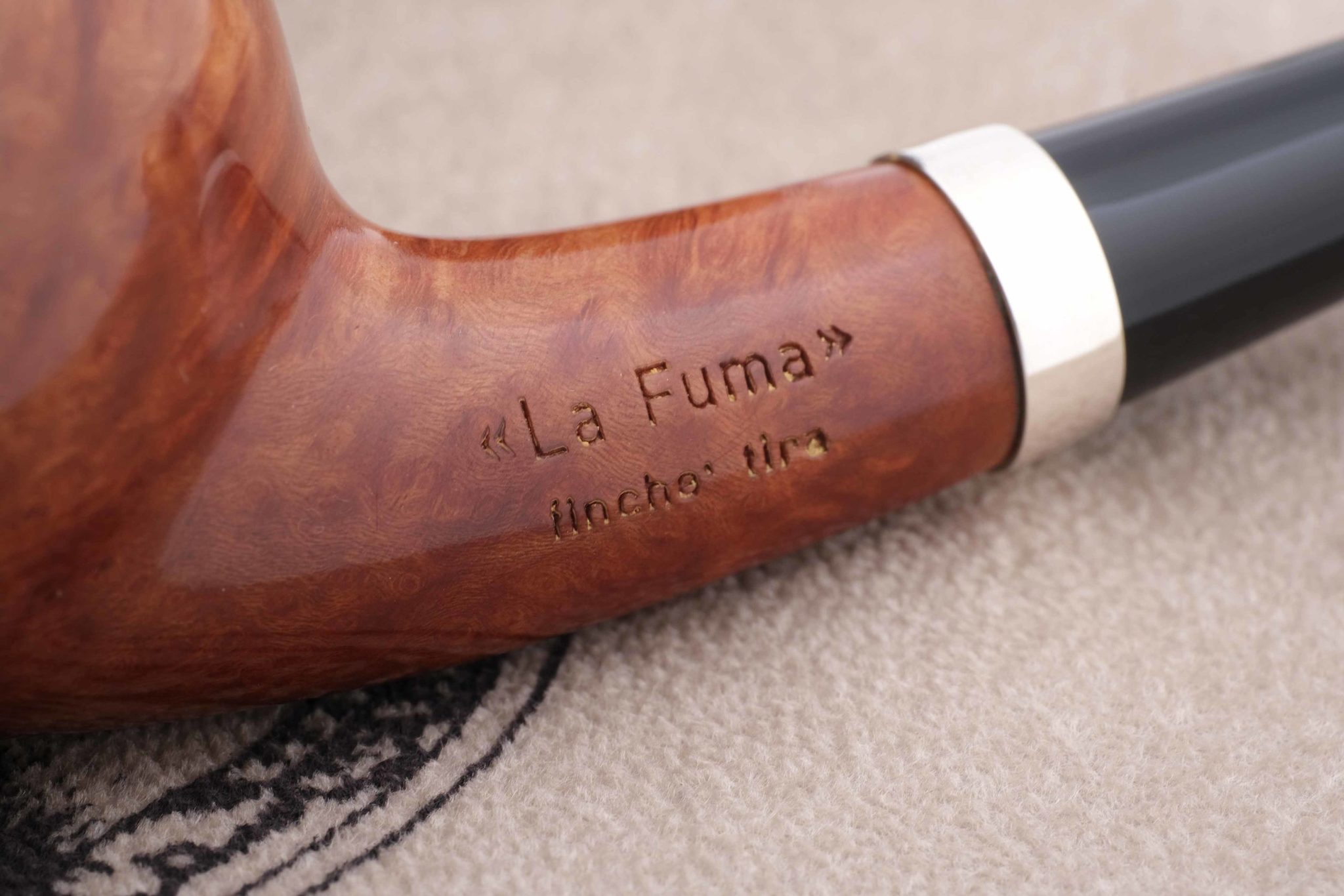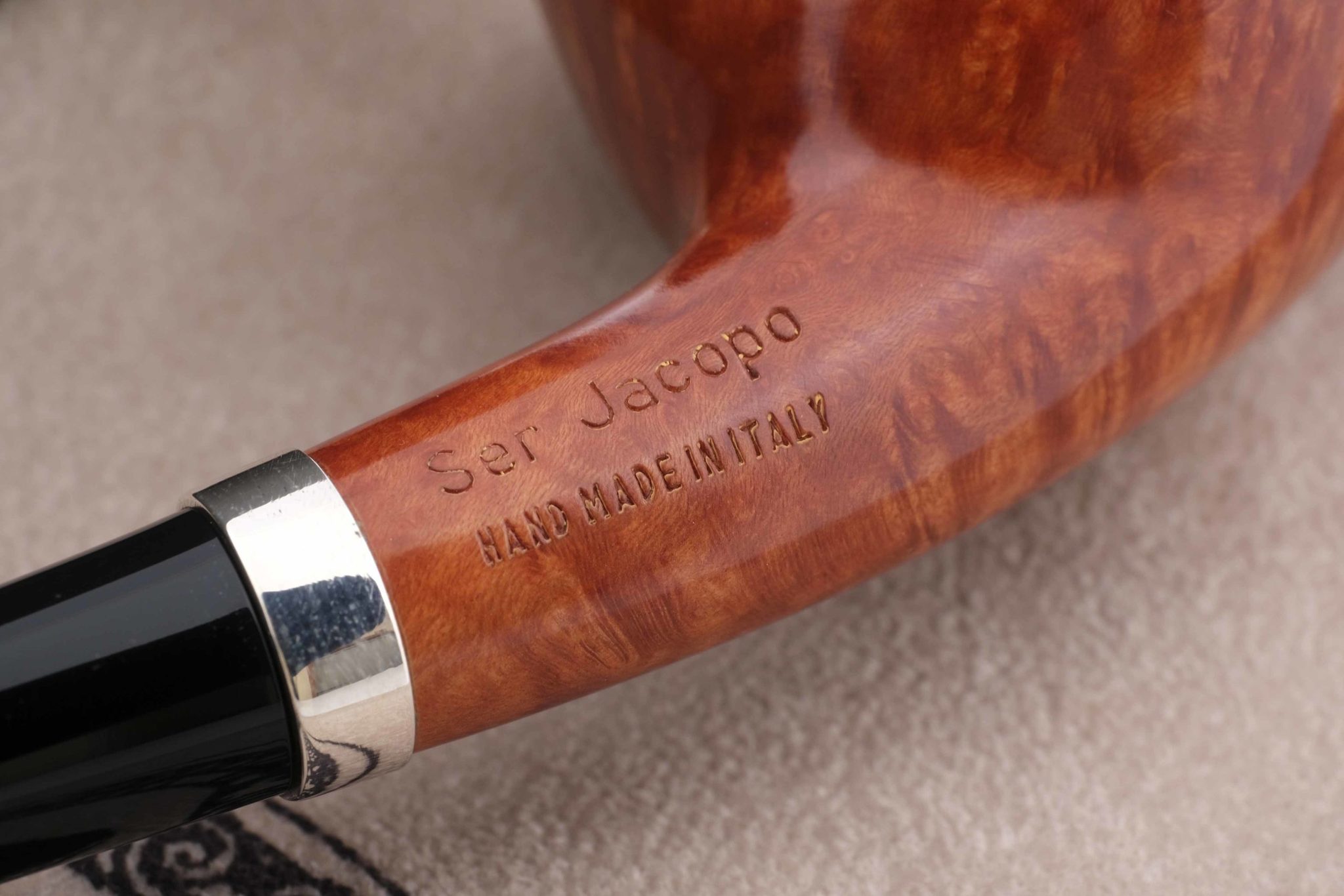 Очень легкая и изящная трубка Ser Jacopo серии La Fuma Кольцо на чубуке выполнено из серебра 925 пробы. На трубке выбит девиз La Fuma fiche tira («Дымится пока курится», ит.), маркировки: Ser Jacopo, Hand made in Italy.