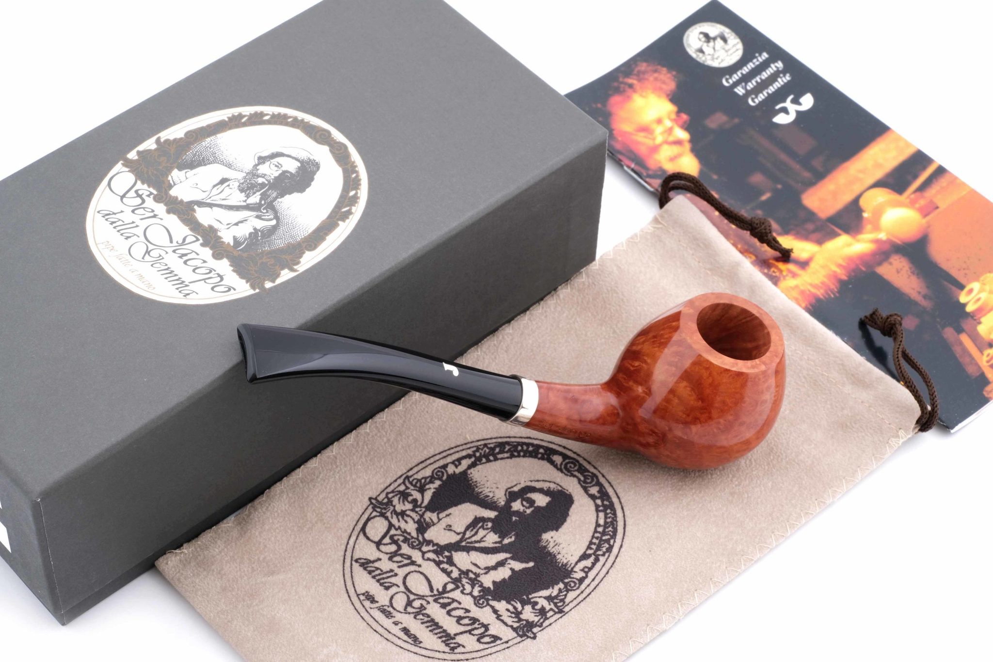 Очень легкая и изящная авторская курительная трубка Ser Jacopo серии La Fuma Кольцо на чубуке выполнено из серебра 925 пробы. На трубке выбит девиз La Fuma fiche tira ("Дымится пока курится", ит.), маркировки: Ser Jacopo, Hand made in Italy. Фильтр 3 мм. Вес всего 47 грамм. Длина трубки 15 см. Высота чашки 4 см. Диаметр табачной камеры 20 мм., глубина 32 мм. В комплекте подарочная коробка, кисет для трубки и буклет компании Ser Jacopo. Ручная работа, единственный экземпляр.