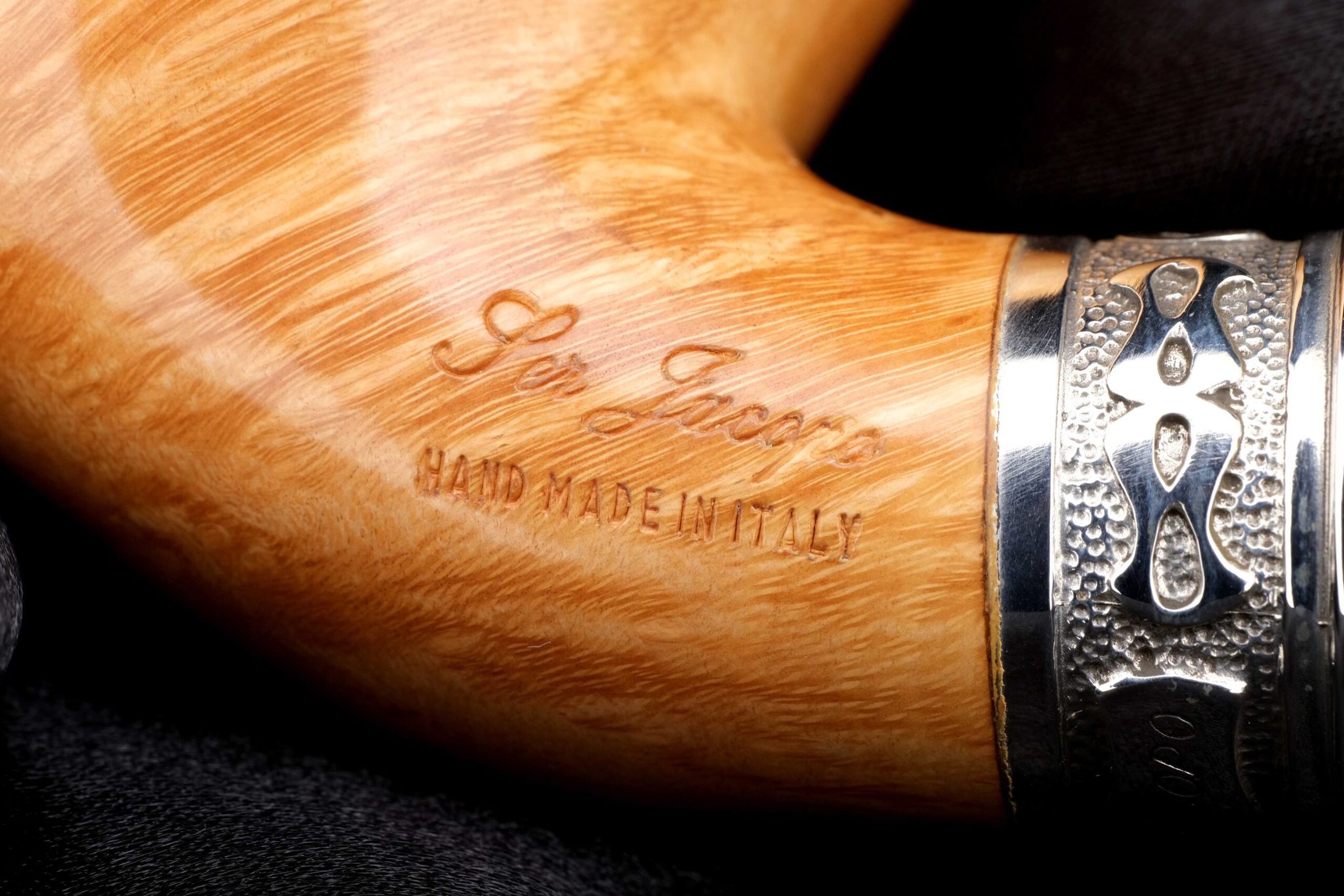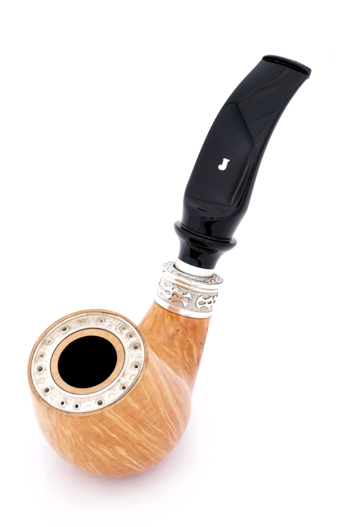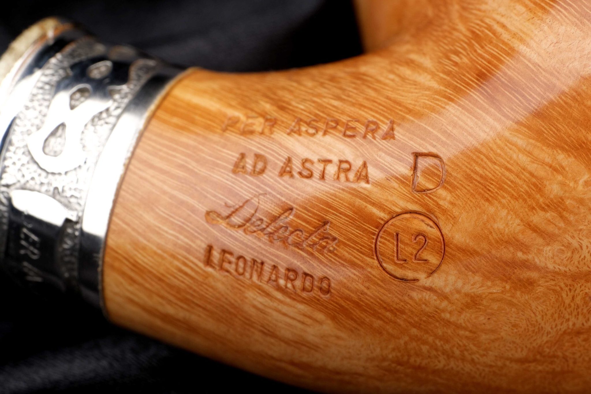 Известно, что Леонардо сделал для Тосканского герцога керамическую трубку с двойными стенками для прохладного курения. Джанкарло разработал аналогичную, но уже из бриара: в стенках чашки сделана кольцевая проточка, закрытая сверху серебряной крышкой с отверстиями для отвода тепла. Таким образом, двойные стенки с воздушной прослойкой сохраняют поверхность трубки комфортной для руки. Кольцо на чубуке модели Delecta из серебра с гравировкой Ser Jacopo и выбитой пробой 925. На чубуке снизу и по бокам выбит девиз мастерской PER ASPERA AD ASTRA («Через тернии к звездам», лат.), маркировки: Ser Jacopo, Hand made in Italy, градация L2D, серия Delecta Leonardo. В комплекте итальянская подарочная шкатулка в черном глянцевом лаке, кисет для трубки и буклеты компании Ser Jacopo.