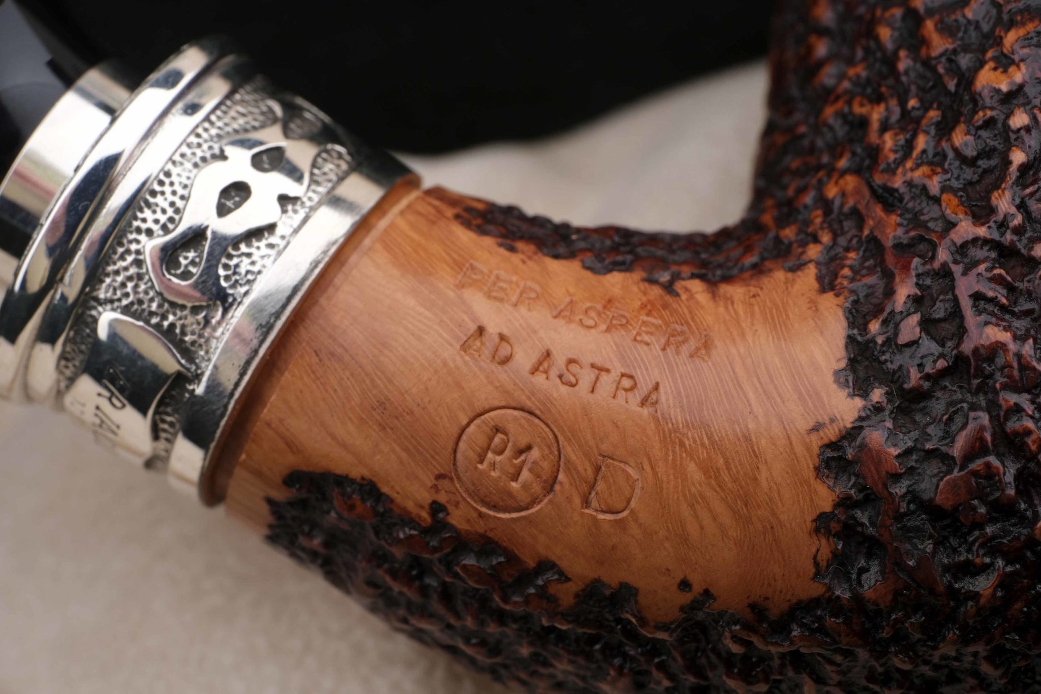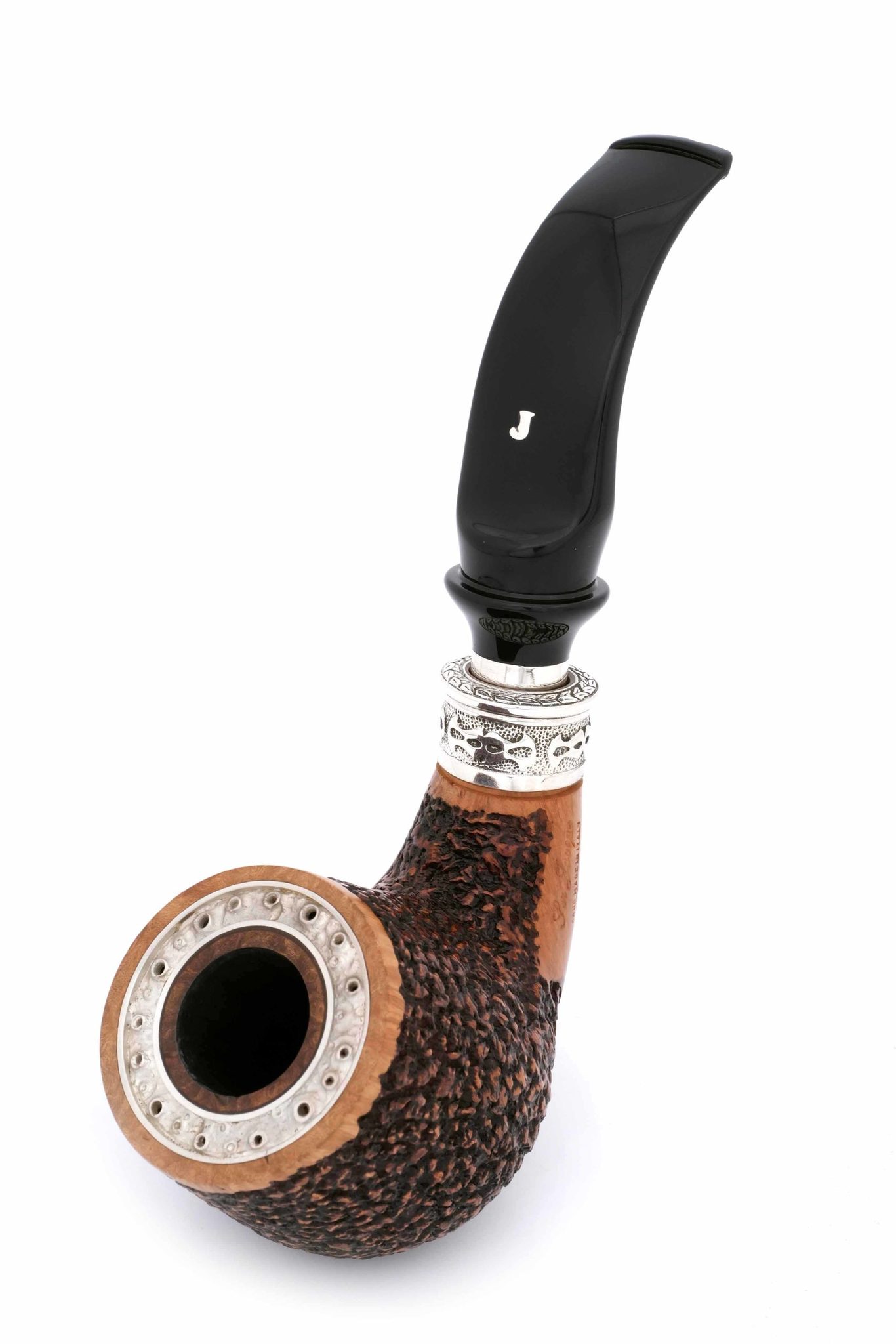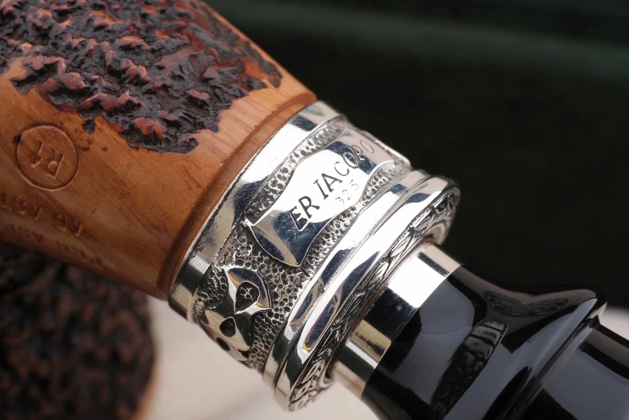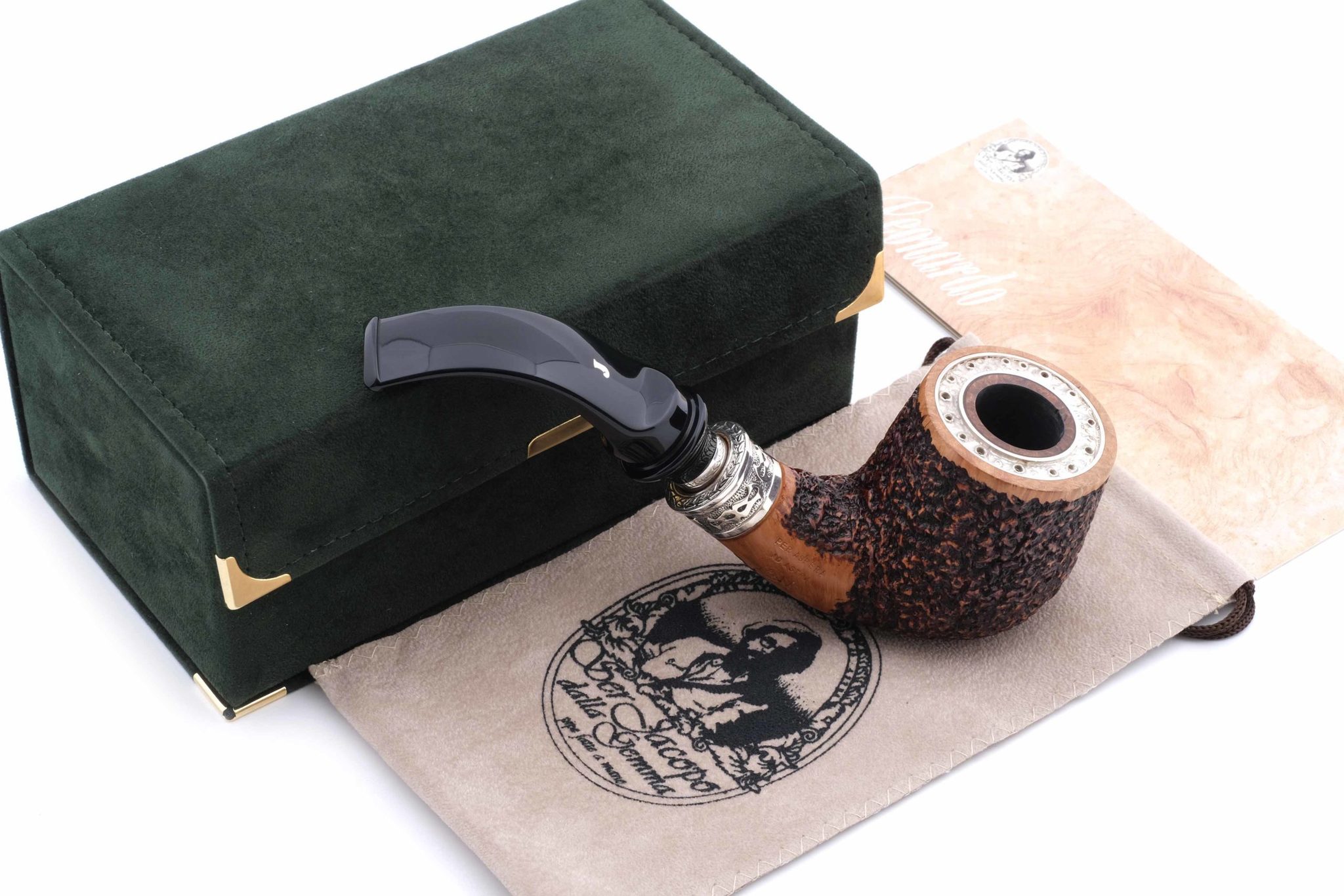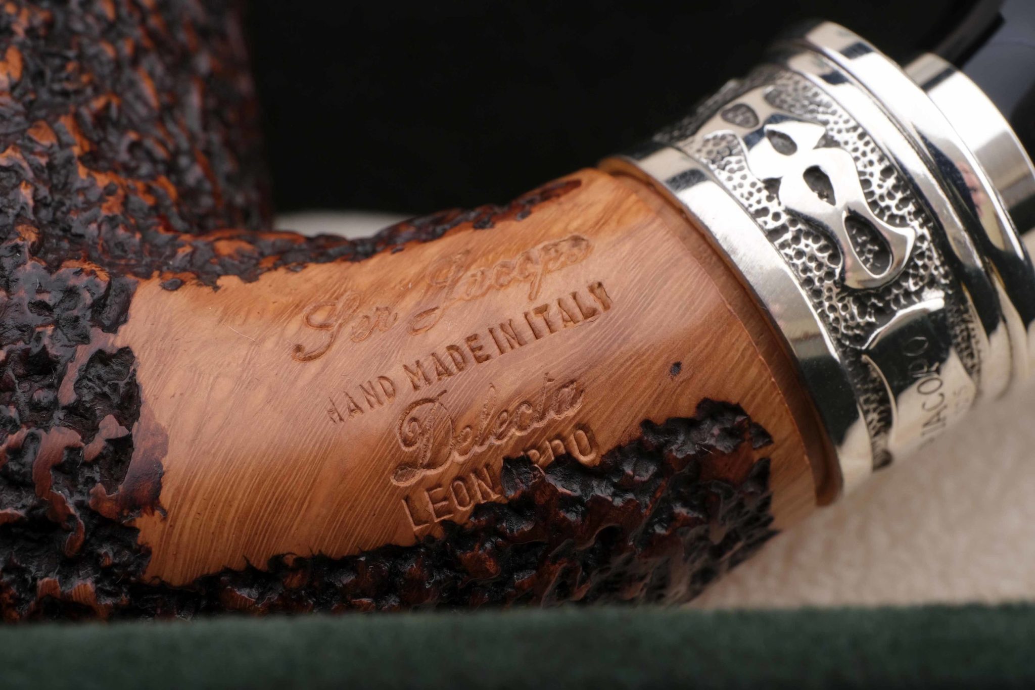 Известно, что Леонардо сделал для Тосканского герцога керамическую трубку с двойными стенками для прохладного курения. Джанкарло разработал аналогичную, но уже из бриара: в стенках чашки сделана кольцевая проточка, закрытая сверху серебряной крышкой с отверстиями для отвода тепла. Таким образом, двойные стенки с воздушной прослойкой сохраняют поверхность трубки комфортной для руки. Кольцо на чубуке модели Delecta из серебра с гравировкой Ser Jacopo и выбитой пробой 925. На чубуке снизу и по бокам выбит девиз мастерской PER ASPERA AD ASTRA («Через тернии к звездам», лат.), маркировки: Ser Jacopo, Hand made in Italy, градация R1, серия Delecta Leonardo. В комплекте подарочная шкатулка, кисет для трубки и буклеты компании Ser Jacopo.