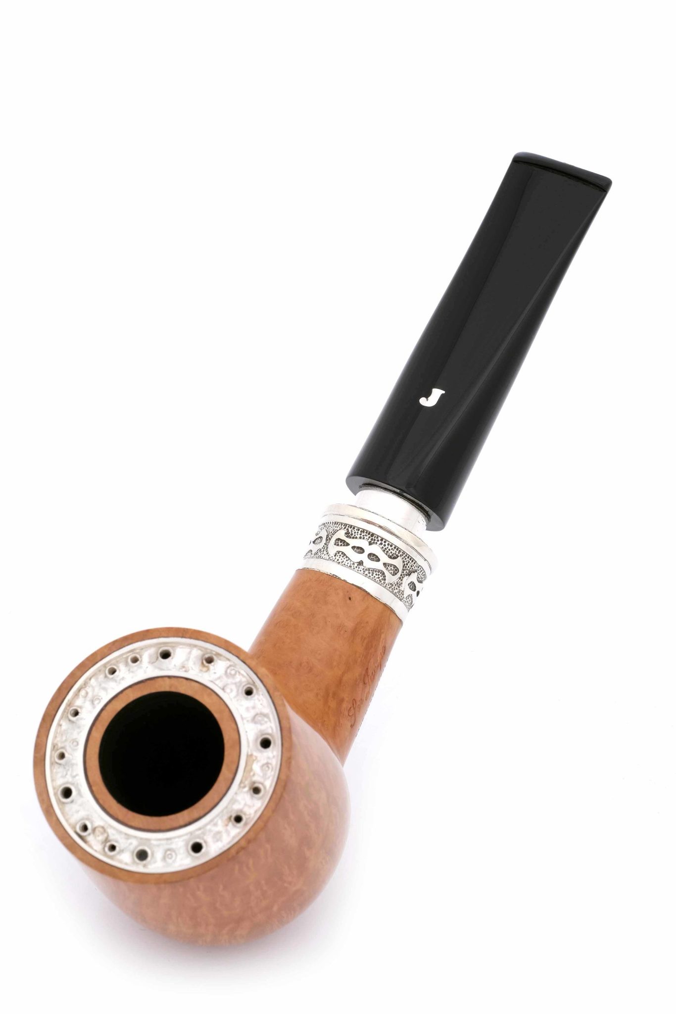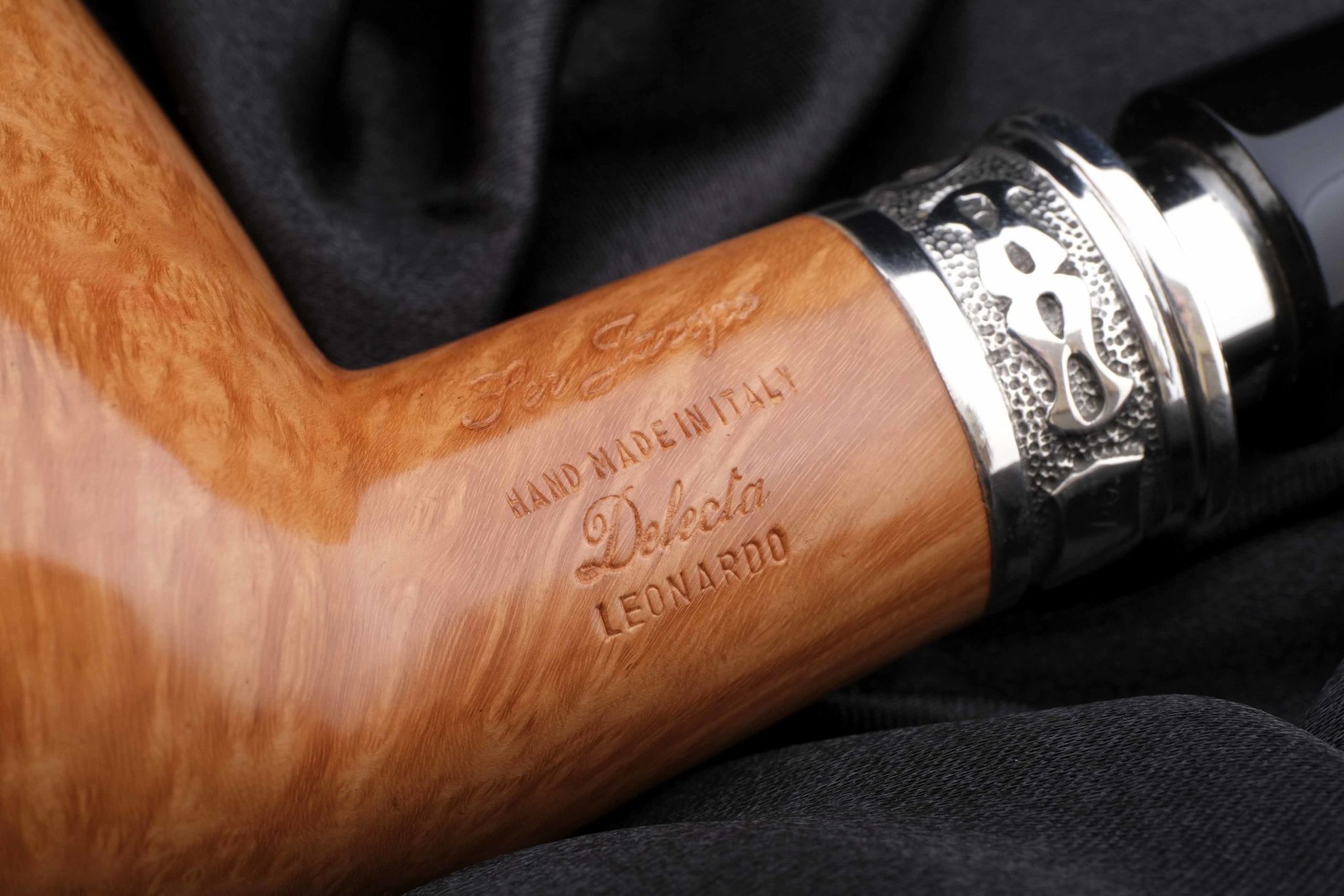Авторская курительная трубка Ser Jacopo Leonardo оригинальной конструкции была создана Джанкарло Гуиди (Giancarlo Guidi) по мотивам работ Леонардо да Винчи. Известно, что Леонардо сделал для Тосканского герцога керамическую трубку с двойными стенками для прохладного курения. Джанкарло разработал аналогичную, но уже из бриара: в стенках чашки сделана кольцевая проточка, закрытая сверху серебряной крышкой с отверстиями для отвода тепла. Таким образом, двойные стенки с воздушной прослойкой сохраняют поверхность трубки комфортной для руки. Кольцо на чубуке модели Delecta из серебра с гравировкой Ser Jacopo и выбитой пробой 925. На чубуке снизу и по бокам выбит девиз мастерской PER ASPERA AD ASTRA ("Через тернии к звездам", лат.), маркировки: Ser Jacopo, Hand made in Italy, градация L2D, серия Delecta Leonardo. Фильтр 9 мм. Вес 95 грамм. Длина трубки 16 см. Диаметр табачной камеры 20 мм., глубина 45 мм. В комплекте итальянская подарочная шкатулка в черном глянцевом лаке, кисет для трубки и буклеты компании Ser Jacopo. Ручная работа.