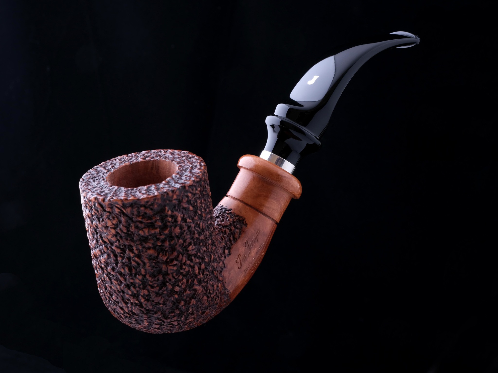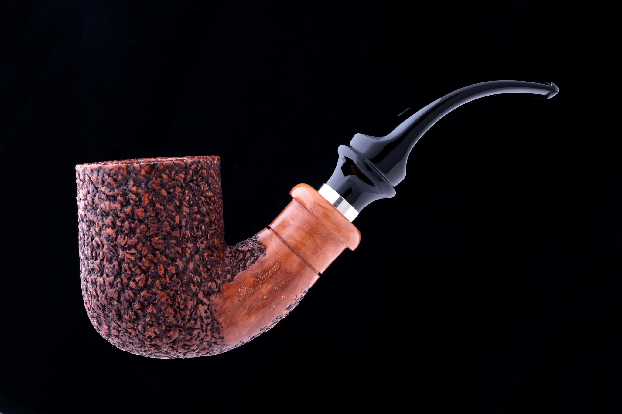 На трубке выбит девиз мастерской Ser Jacopo PER ASPERA AD ASTRA («Через тернии к звездам», лат.), маркировки: Ser Jacopo, Hand made in Italy, грэйд R1 В.