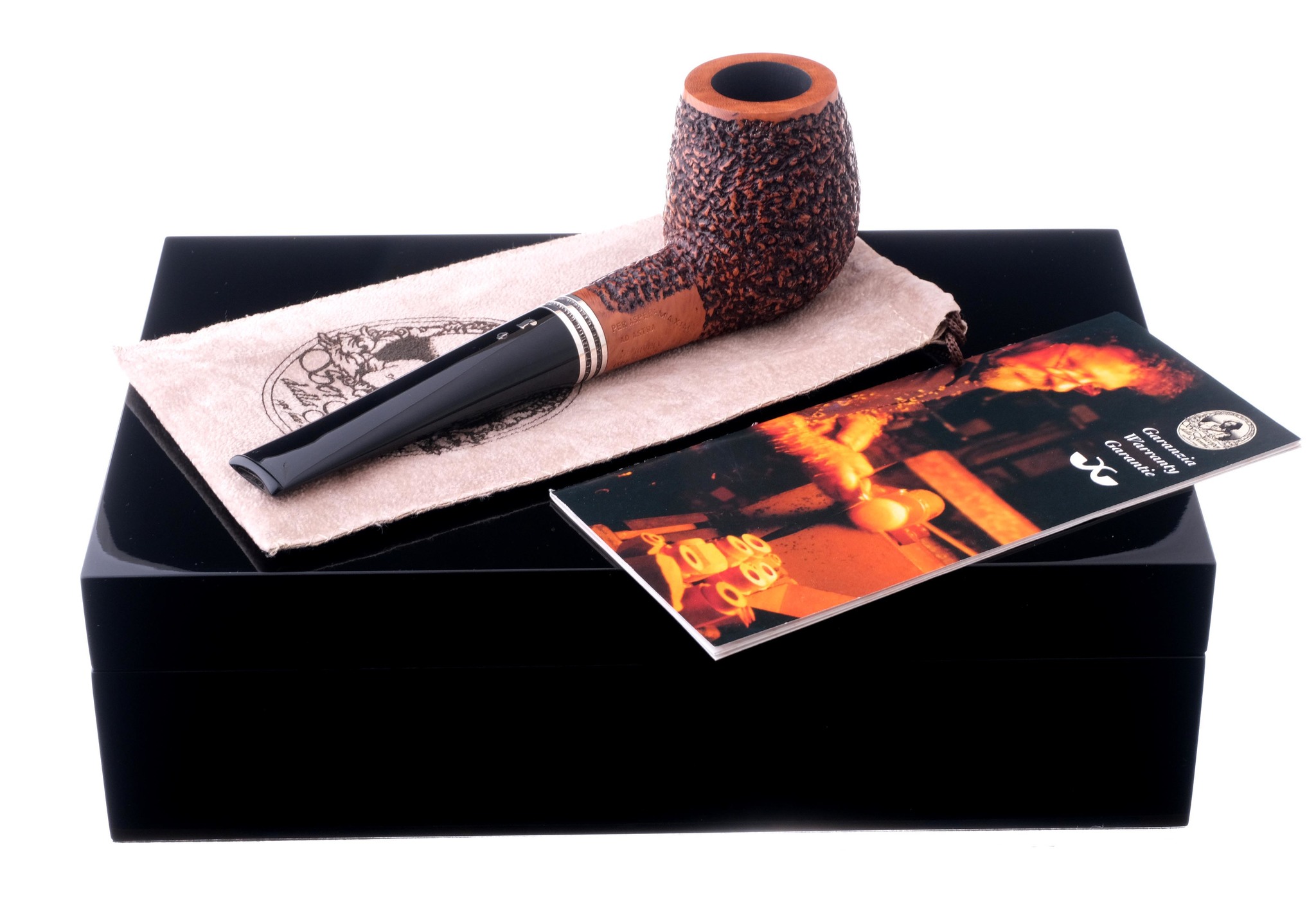 Золотое сечение легло в основу композиционного построения многих произведений мирового искусства (главным образом в архитектуре античности и Возрождения). Уникальность трубки в том, что мастер обязан выдержать строгие математические пропорции всех элементов изделия, несмотря на то, что бриар — природный материал с непредсказуемым результатом в процессе обработки. Найти подходящую «идеальную» заготовку и сделать из нее «идеальную» трубку — редкая удача даже для большого мастера. Мундштук из акрила, кольцо на чубуке выполнено из серебра 925 пробы. В мундштук вставлен значок Золотого сечения, выполненный также из серебра. На трубке выбит девиз мастерской Ser Jacopo PER ASPERA AD ASTRA («Через тернии к звездам», лат.), маркировки: Ser Jacopo, Fatta a mano in Italia (Cделано в ручную в Италии), серия DE DIVINA PROPORZIONE, грэйд R1 D MAXIMA (трубка крупного размера). В комплекте итальянская подарочная шкатулка в черном глянцевом лаке, кисет для трубки и буклеты компании Ser Jacopo.