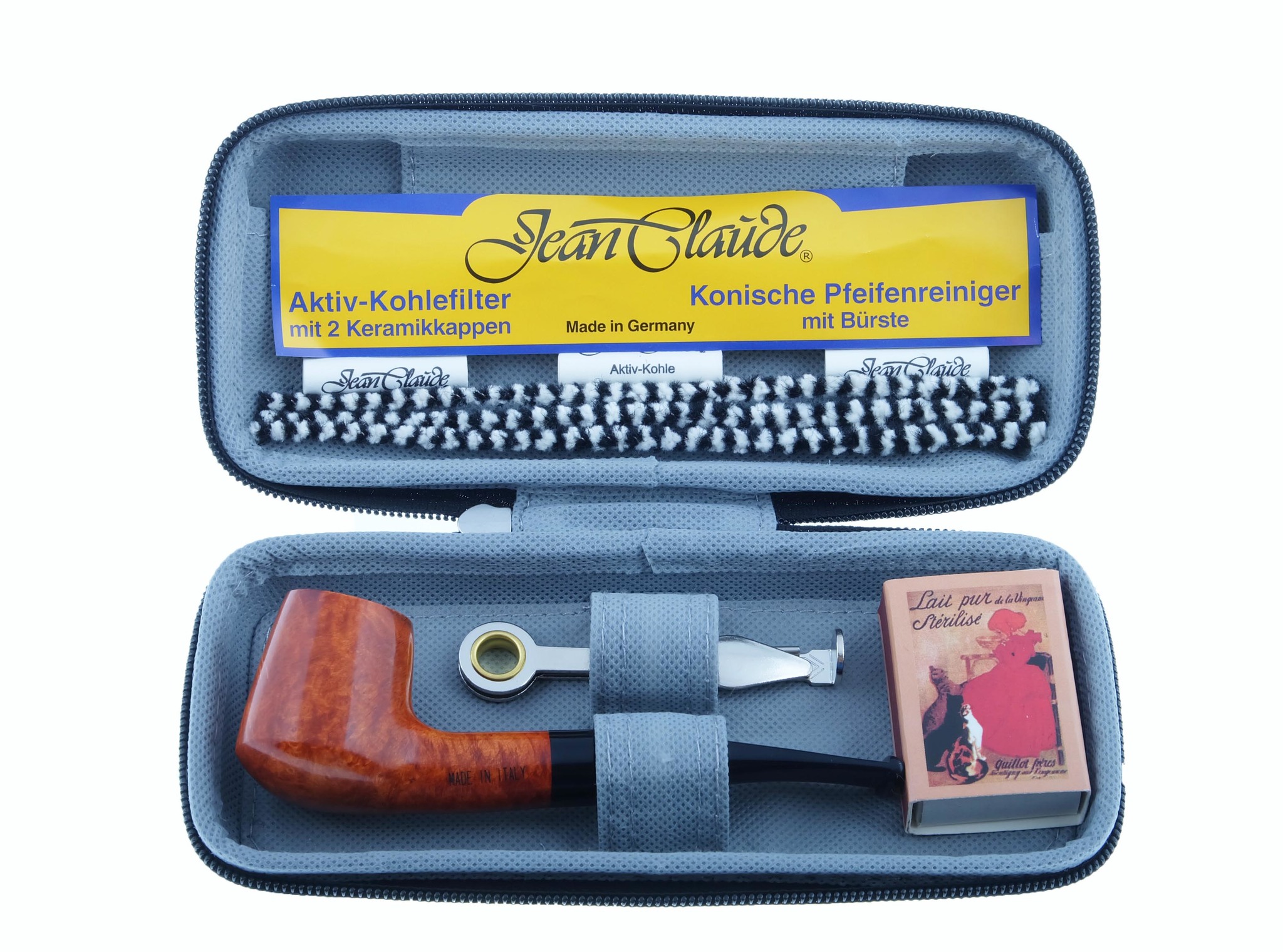 Набор начинающего трубокура Jean Claude в жестком футляре. В составе набора: Итальянская трубка из бриара с акриловым мундштуком под фильтр 9 мм, инструмент для ухода за трубкой (тройник), коробок спичек, 3 конических ершика, 3 угольных фильтра, брошюра-инструкция по курению трубки на английском и немецком языках.