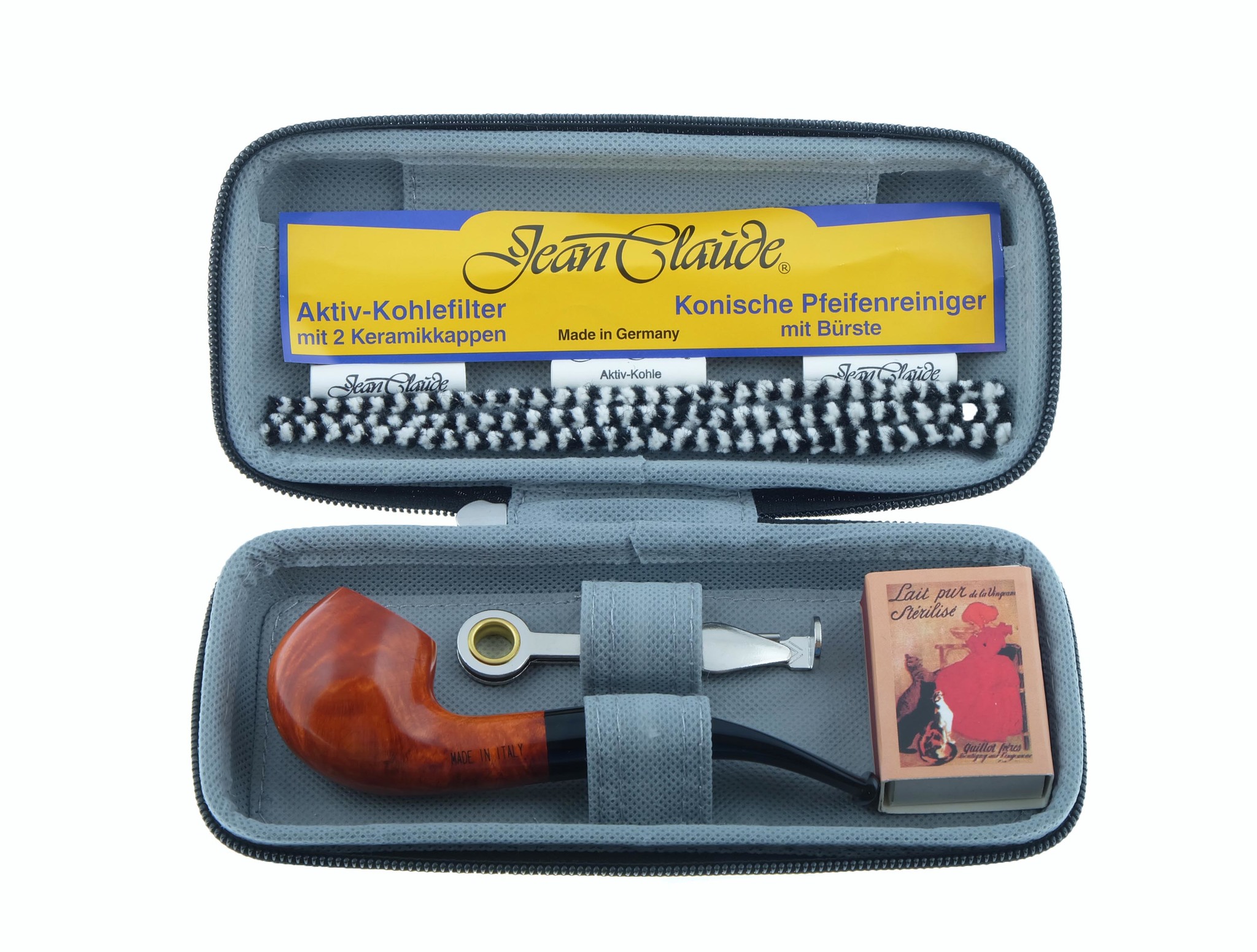 Набор начинающего трубокура Jean Claude в жестком футляре. В составе набора: Итальянская трубка из бриара с акриловым мундштуком под фильтр 9 мм, инструмент для ухода за трубкой (тройник), коробок спичек, 3 конических ершика, 3 угольных фильтра, брошюра-инструкция по курению трубки на английском и немецком языках.