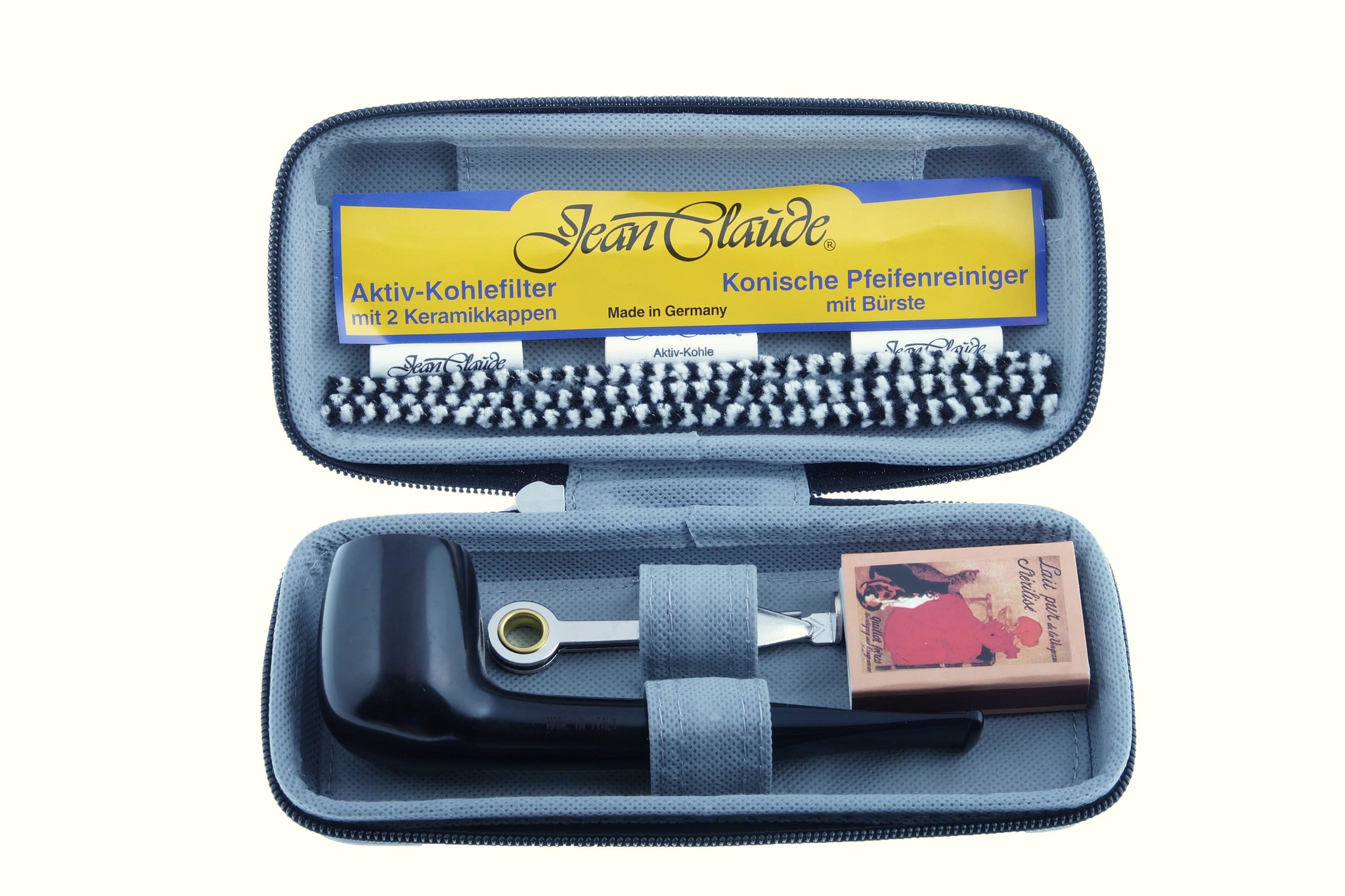 Набор начинающего трубокура Jean Claude в жестком футляре. В составе набора: Итальянская трубка из бриара с акриловым мундштуком под фильтр 9 мм, инструмент для ухода за трубкой (тройник), коробок спичек, 3 конических ершика, 3 угольных фильтра, брошюра-инструкция по курению трубки на английском и немецком языках.