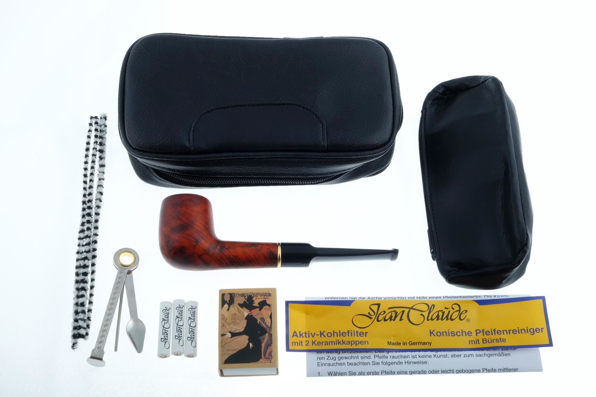 Набор начинающего трубокура Jean Claude в сумке. В составе набора: Сумка на две трубки со съемным кисетом на магните для табакааксессуаров, Итальянская трубка «Stromboli» из бриара с эбонитовым мундштуком под фильтр 9 мм, инструмент для ухода за трубкой (тройник), коробок спичек, 3 конических ершика, 3 угольных фильтра, брошюра-инструкция по курению трубки на английском и немецком языках.