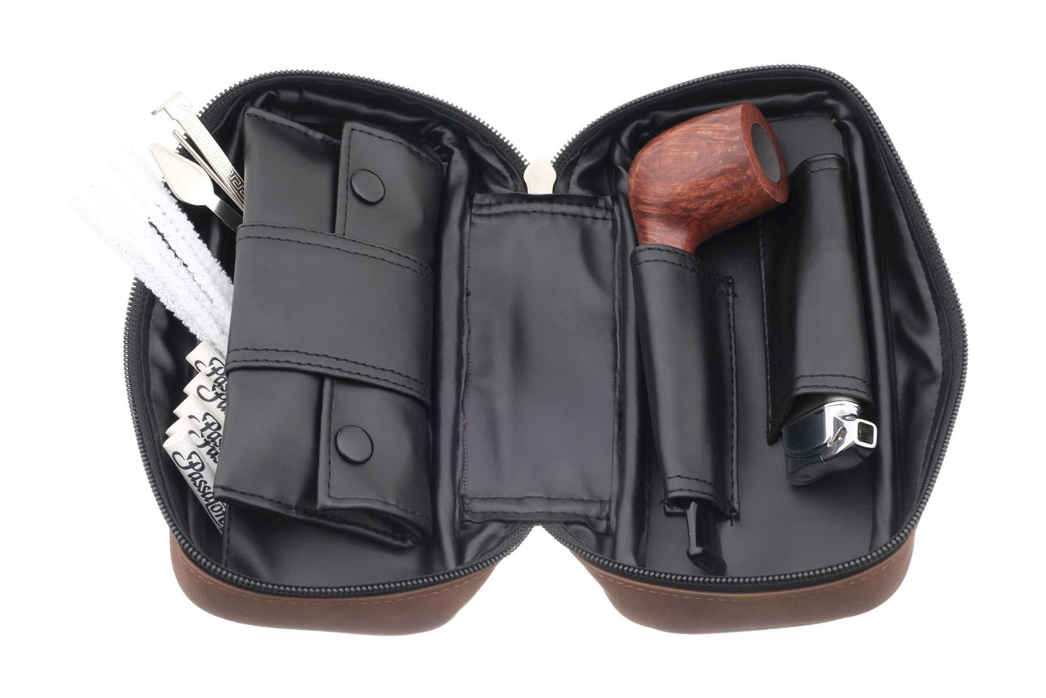 Качественный подарочный набор для трубокура немецкой марки Passatore. В состав набора входят: 1. Кожаная сумка на 2 трубки с отделениями для аксессуаров. Размер сумки: 20 х 10 х 6,5 см. 2. Съемный кисет для табака с внутренним отделом из хирургической резины для сохранения влажности. 3. Итальянская трубка от фабрики Cesare Barontini из Ливорно. Материал трубки - тосканский бриар, мундштук - акрил. Фильтр 9 мм. 4. Тампер-тройник. 5. Трубочная газовая зажигалка с боковым пламенем в металлическом корпусе. 6. Набор фирменных угольных фильтров и ершей для ухода за трубкой.
