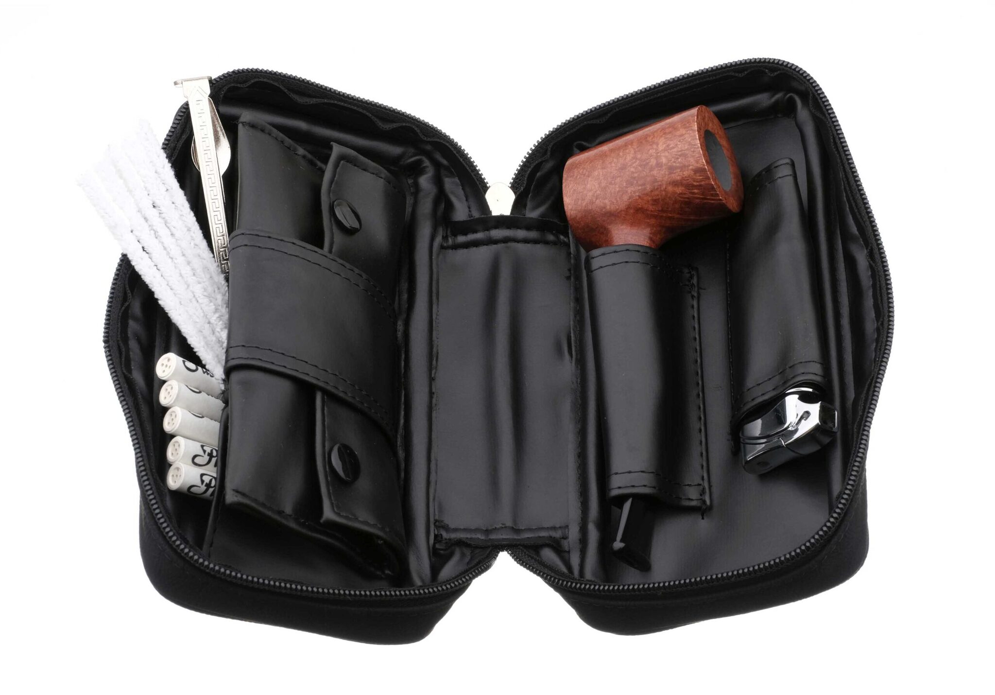 Качественный подарочный набор для трубокура немецкой марки Passatore. В состав набора входят: 1. Кожаная сумка на 2 трубки с отделениями для аксессуаров. Размер сумки: 20 х 10 х 6,5 см. 2. Съемный кисет для табака с внутренним отделом из хирургической резины для сохранения влажности. 3. Итальянская трубка от фабрики Cesare Barontini из Ливорно. Материал трубки - тосканский бриар, мундштук - акрил. Фильтр 9 мм. 4. Тампер-тройник. 5. Трубочная газовая зажигалка с боковым пламенем в металлическом корпусе. 6. Набор фирменных угольных фильтров и ершей для ухода за трубкой.