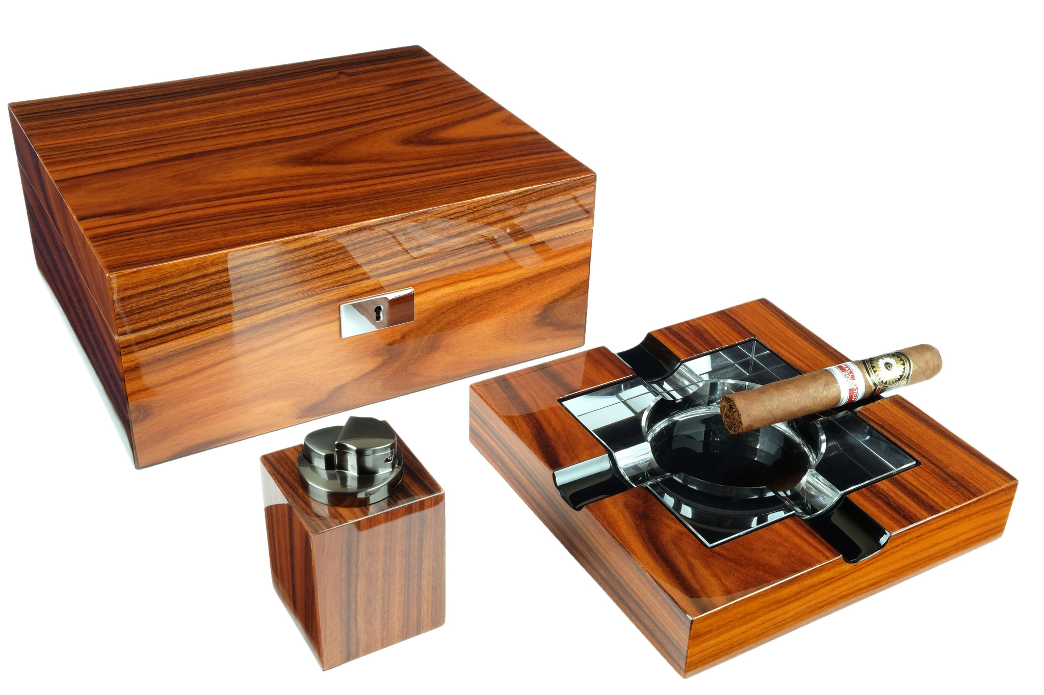 Настольный набор сигарных аксессуаров производства американской компании Howard Miller, состоящий из хьюмидора для хранения сигар, элегантной пепельницы и зажигалки. Идеальный подарок для любого ценителя сигар.