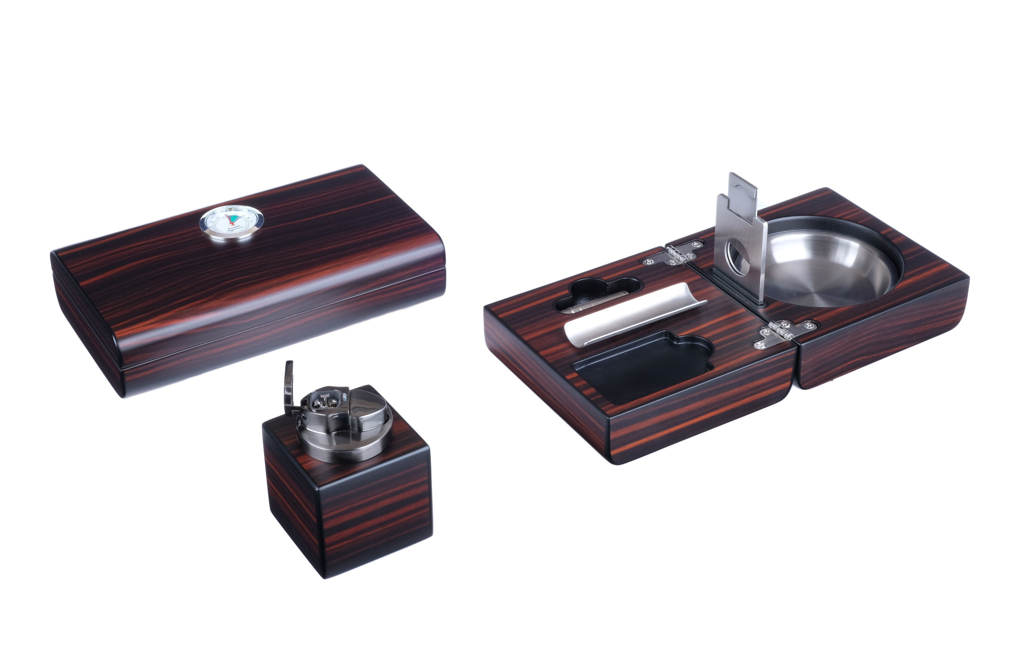 Настольный набор сигарных аксессуаров от итальянской компании Lubinski SRL, состоящий из хьюмидора для хранения сигар, элегантной пепельницы и зажигалки.