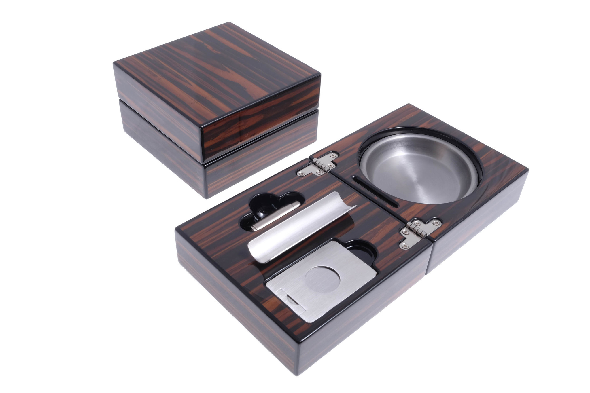 В закрытом виде — настольный предмет интерьера, хорошо сочетающийся с хьюмидором и настольной зажигалкой от Lubinski в едином стиле. При открывании превращается в пепельницу на 1 сигару со встроенными гильотиной и пробойником. Гильотина ставится вертикально в гнездо и работает как настольная. Отделка Макассар с глянцевым лаковым покрытием.