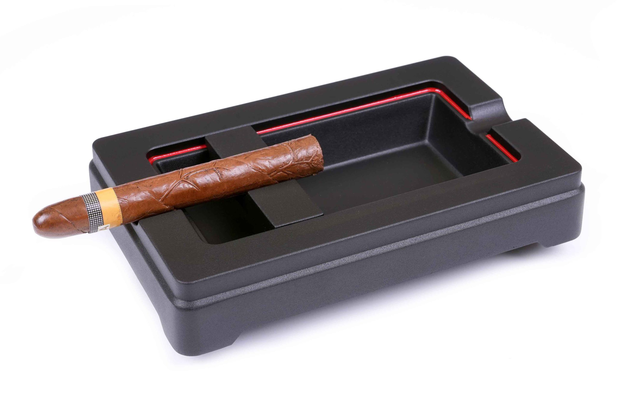 Алюминиевый корпус с напылением долговечен и легко моется. Съемный регулируемый ложемент в центре для удобного расположения сигары любого размера. Подарочная упаковка.