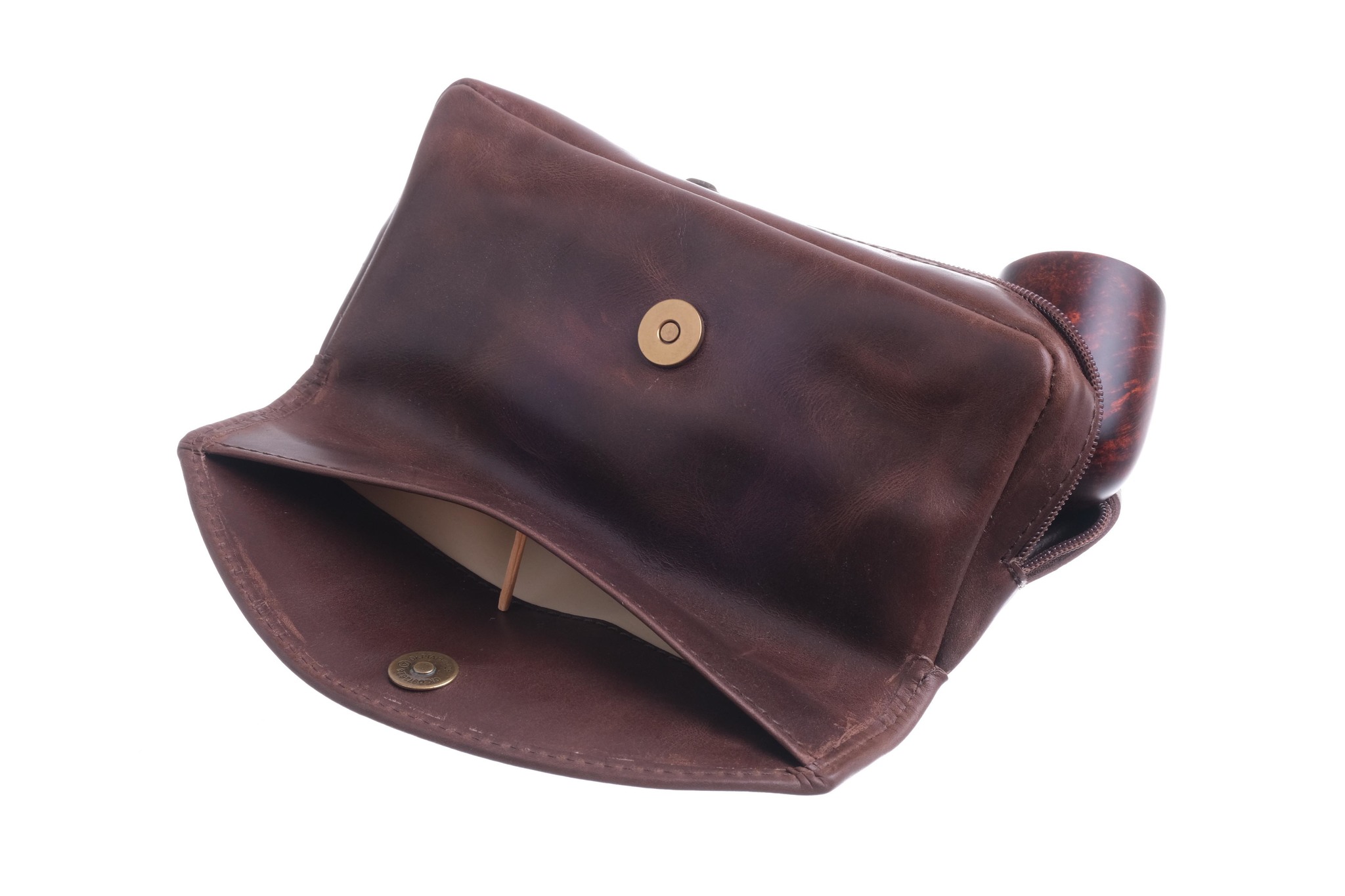 Это вид кожи повышенной прочности, получаемый с помощью оригинальной финишной обработки «крейзи хорс»: нанесения тугоплавких восков на шлифованную поверхность. Отличительная внешняя особенность этой кожи – мягкость, эластичность и стильная винтажность. На коже могут оставаться царапины, следы, придающие шарм «старины», но при желании их легко удалить, потерев место чем-то мягким (пальцем, тканью). Сумка состоит из отделения на 1 трубку из материала, который не впитывает запах табака и куренной трубки, отделения для табака из хирургической резины для сохранения влажности табачной смеси и отделения для мелких аксессуаров.