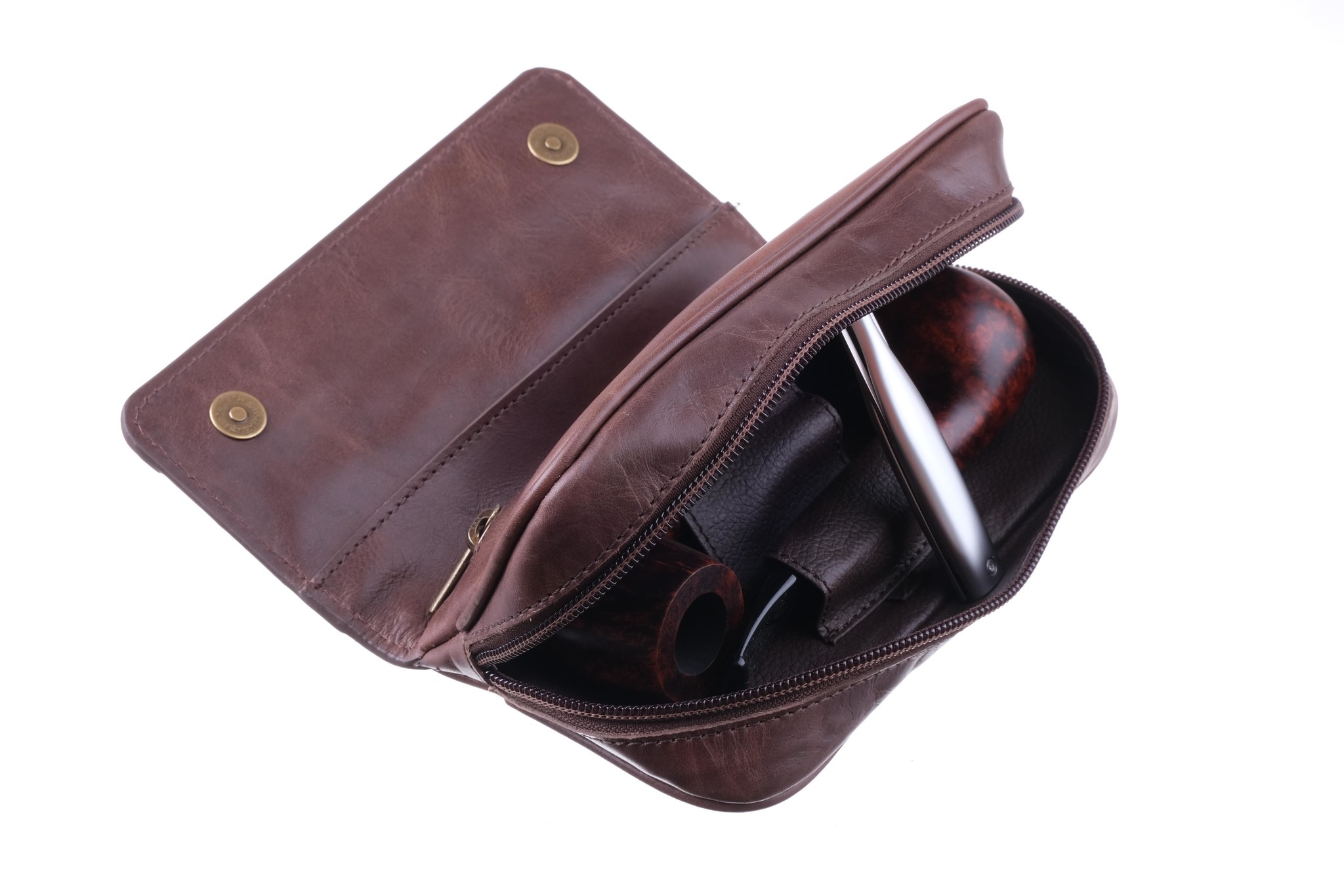 Это вид кожи повышенной прочности, получаемый с помощью оригинальной финишной обработки «крейзи хорс»: нанесения тугоплавких восков на шлифованную поверхность. Отличительная внешняя особенность этой кожи – мягкость, эластичность и стильная винтажность. На коже могут оставаться царапины, следы, придающие шарм «старины», но при желании их легко удалить, потерев место чем-то мягким (пальцем, тканью). Состоит из отделения на 2 трубки из материала, который не впитывает запах табака и куренной трубки, отделения для табака из хирургической резины для сохранения влажности табачной смеси и отделения для мелких аксессуаров. Поставляется в подарочной коробке