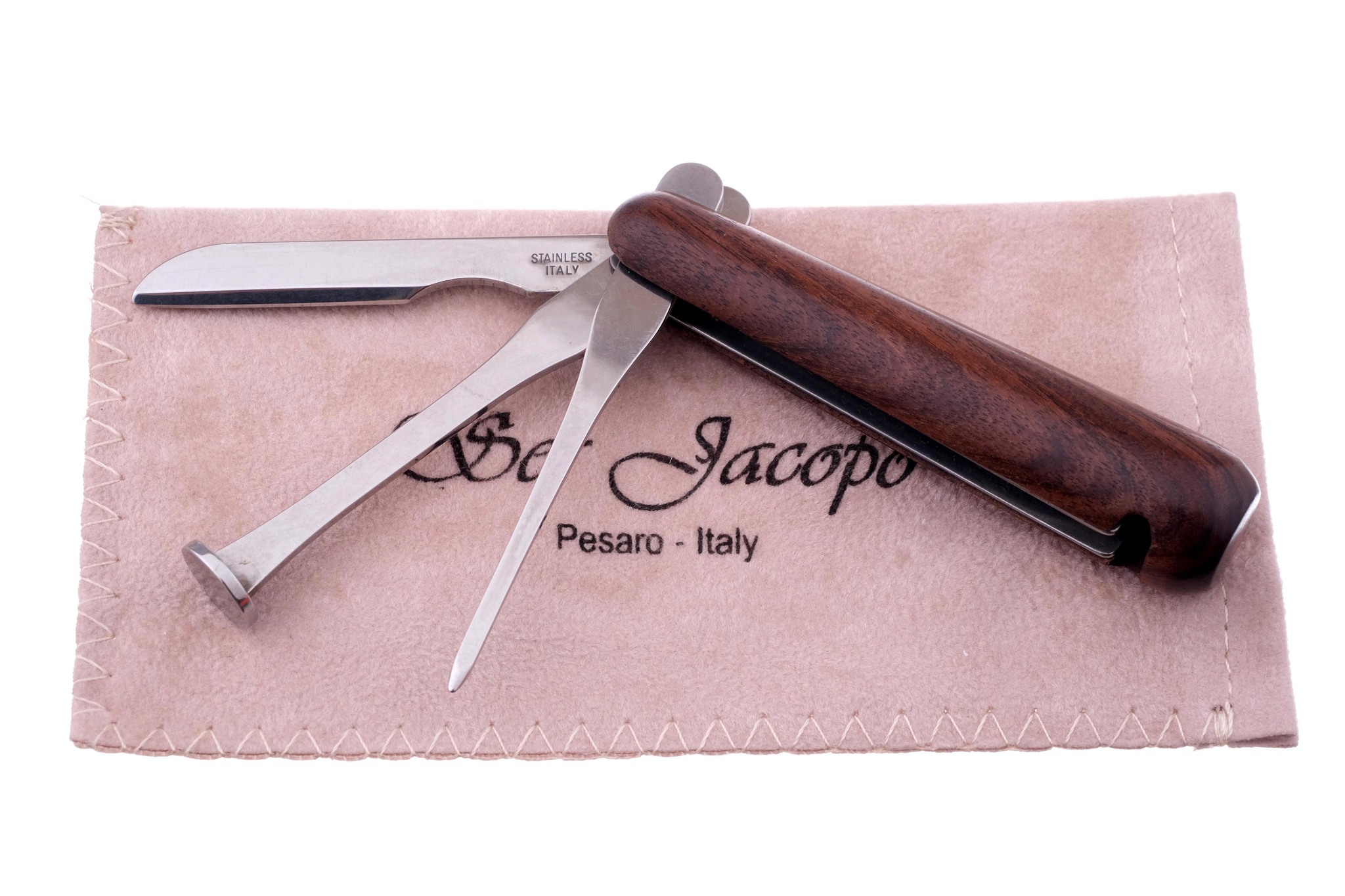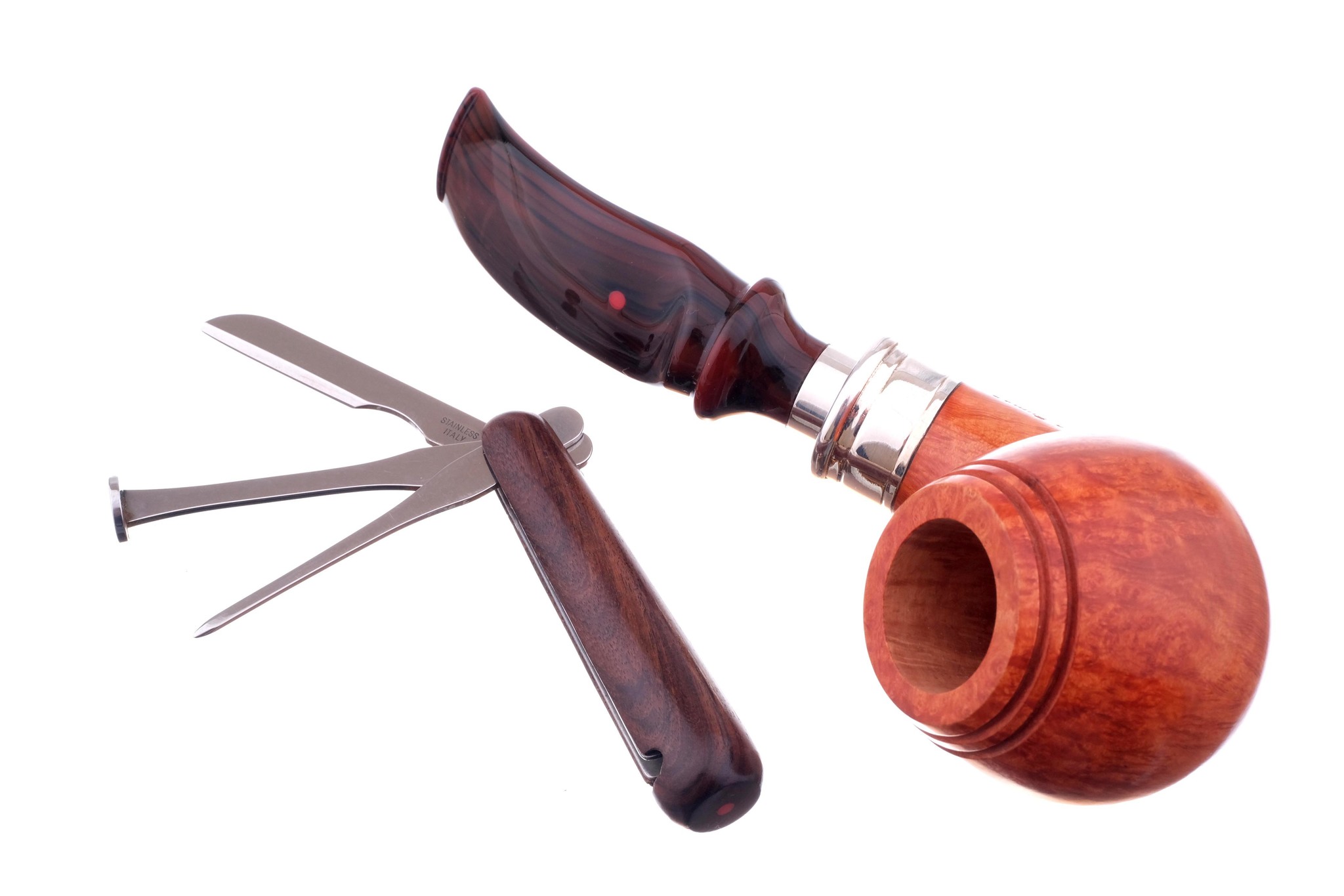 Штучная работа итальянских трубочников из мастерской Ser Jacopo (www.serjacopo.it) совместно с флорентийской мастерской ножей и холодного оружия Saladini (www.coltelleriasaladini.it). Модель M8 c закрытым тампером для трамбовки (чтобы не пачкать карман), шильцем для чистки и перемешивания табака и ножом для выравнивания нагара. Поставляется в фирменном кисете.