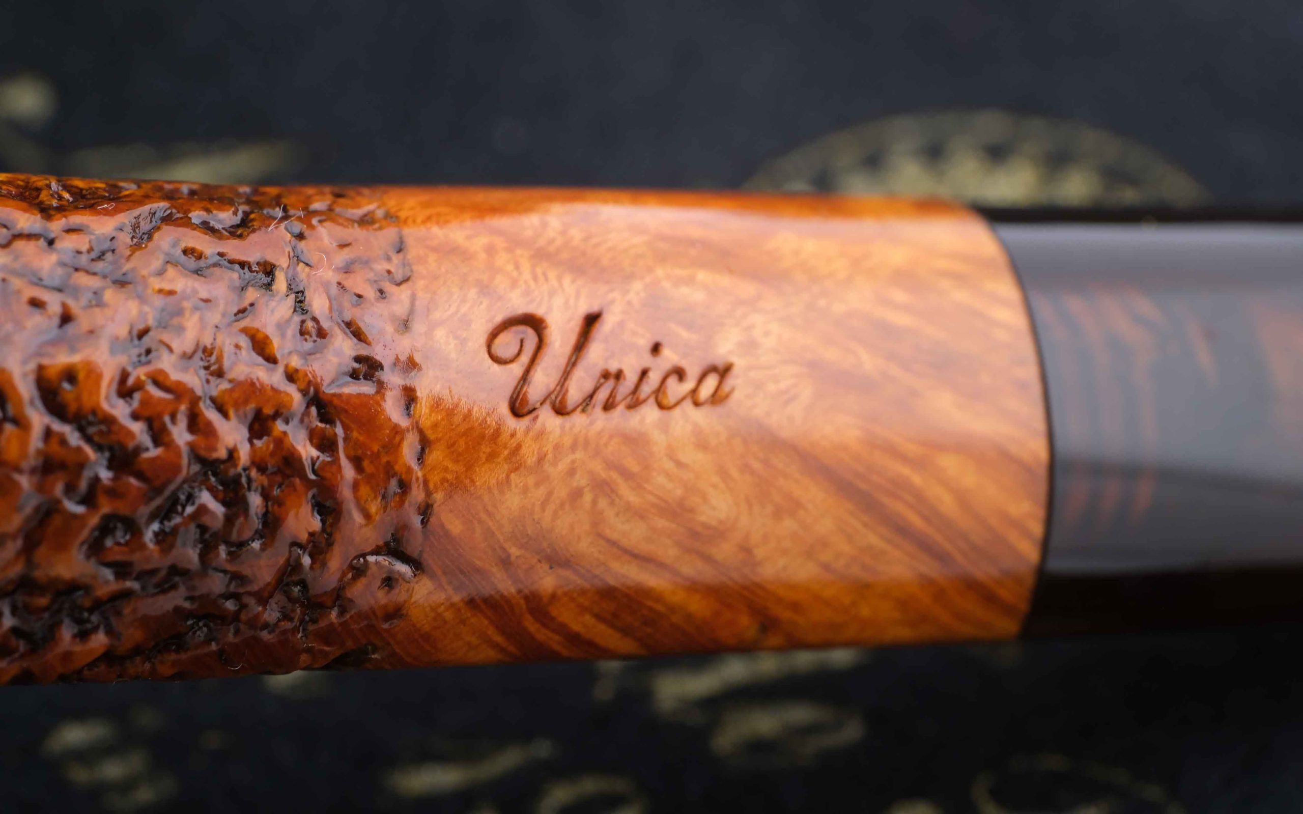 Принадлежит к лимитированной серии Unica, где каждый экземпляр неповторим, имея свой индивидуальный дизайн. Рустировка придает объем и увеличение поверхности охлаждения в дополнение к натуральному рисунку бриара на чаше.
