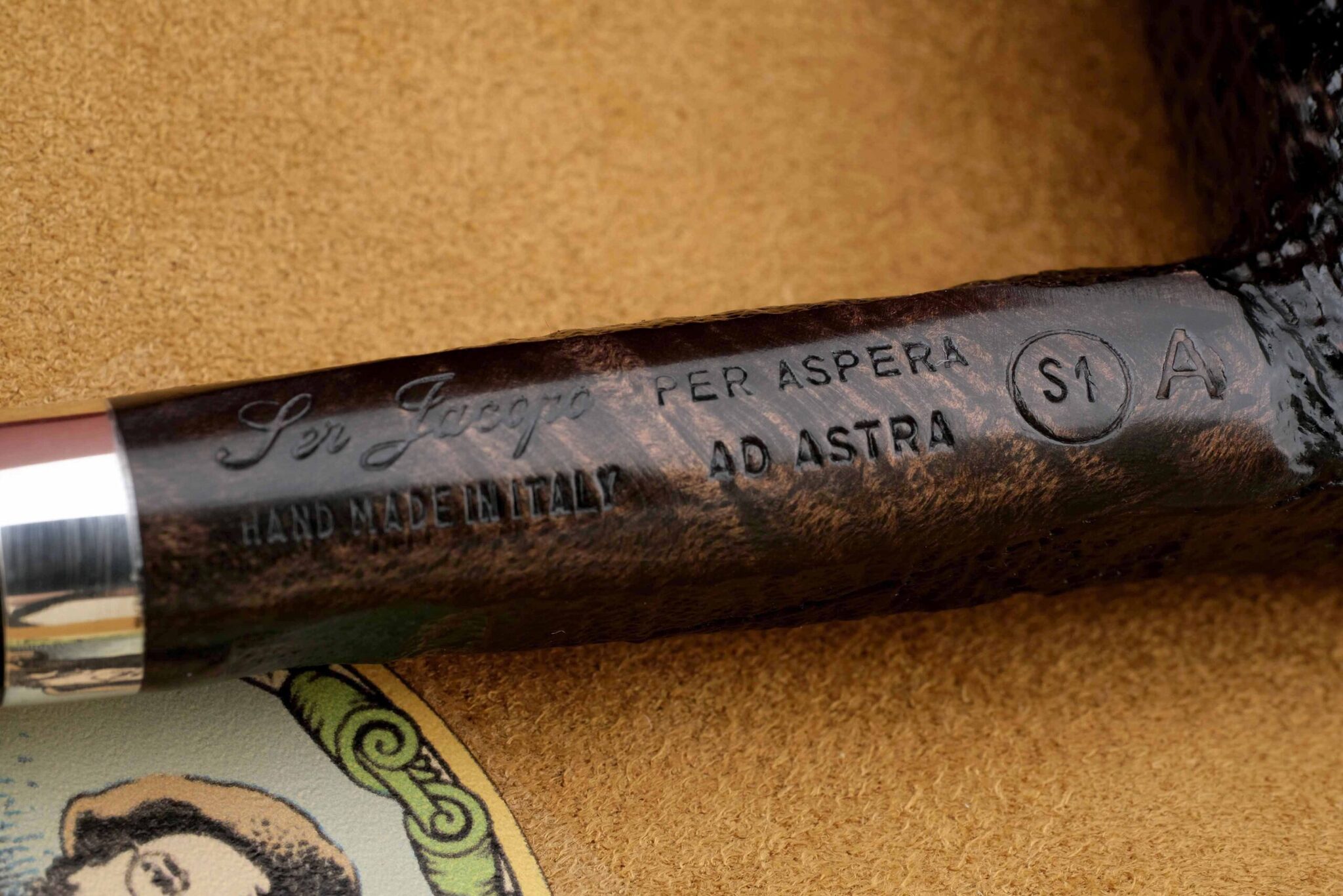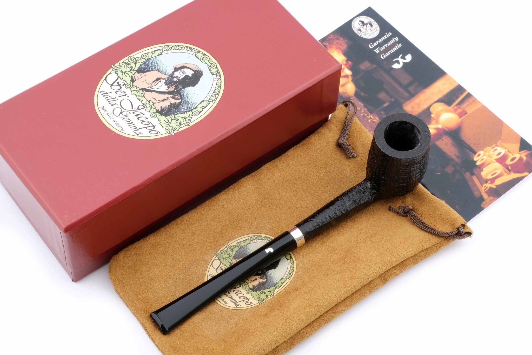 Мундштук из акрила. Кольцо на чубуке из серебра 925 пробы. На трубке выбит девиз мастерской Ser Jacopo PER ASPERA AD ASTRA («Через тернии к звездам», лат.), маркировки: Ser Jacopo, Hand made in Italy, грэйд S1 A. Фильтр 3 мм. Вес 37 грамм. Длина трубки 17 см. Диаметр чашки 33 мм, Высота чашки 48 мм. Диаметр табачной камеры 20 мм., глубина 43 мм. В комплекте подарочная коробка, кисет для трубки и буклет компании Ser Jacopo. Ручная работа, единственный экземпляр.