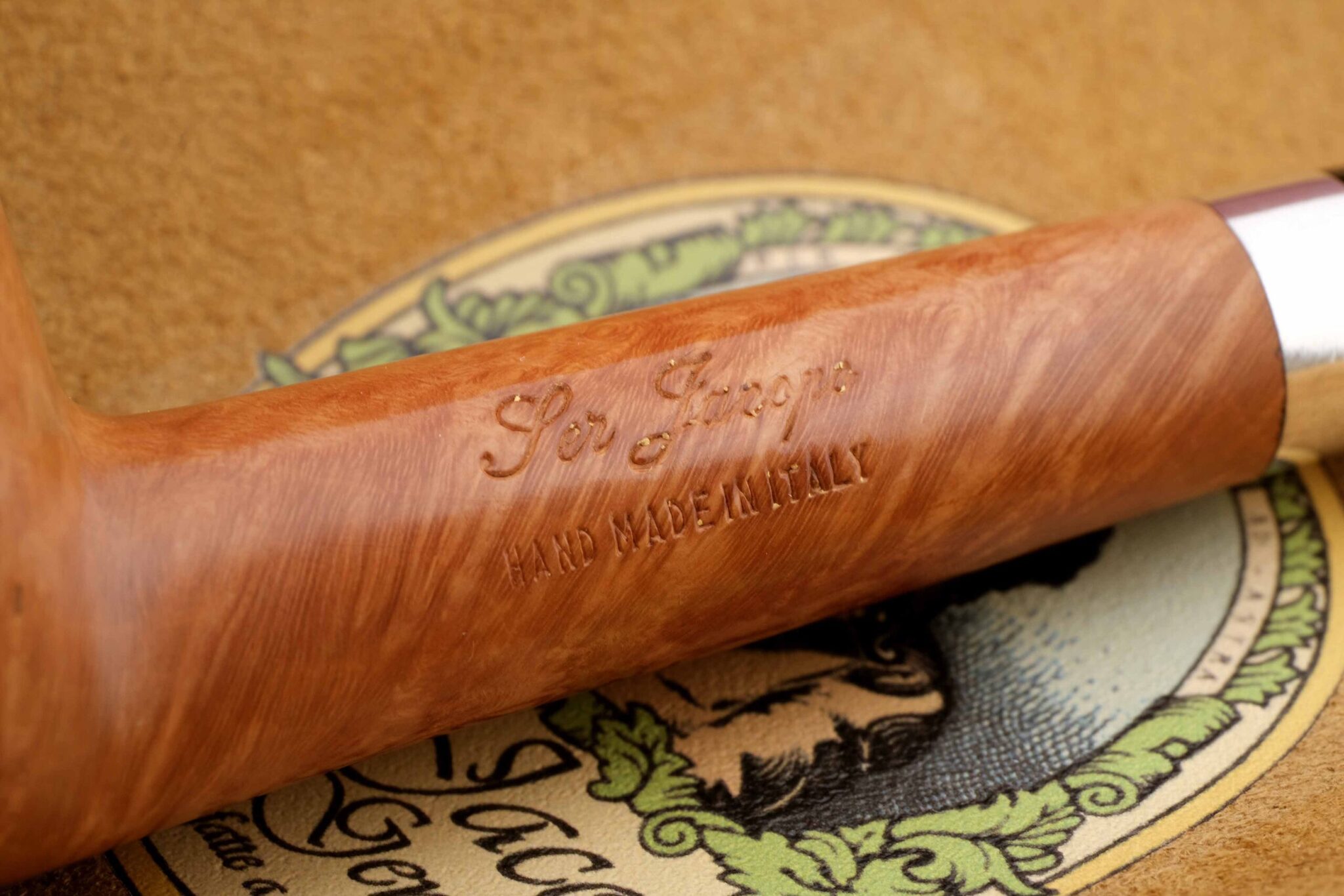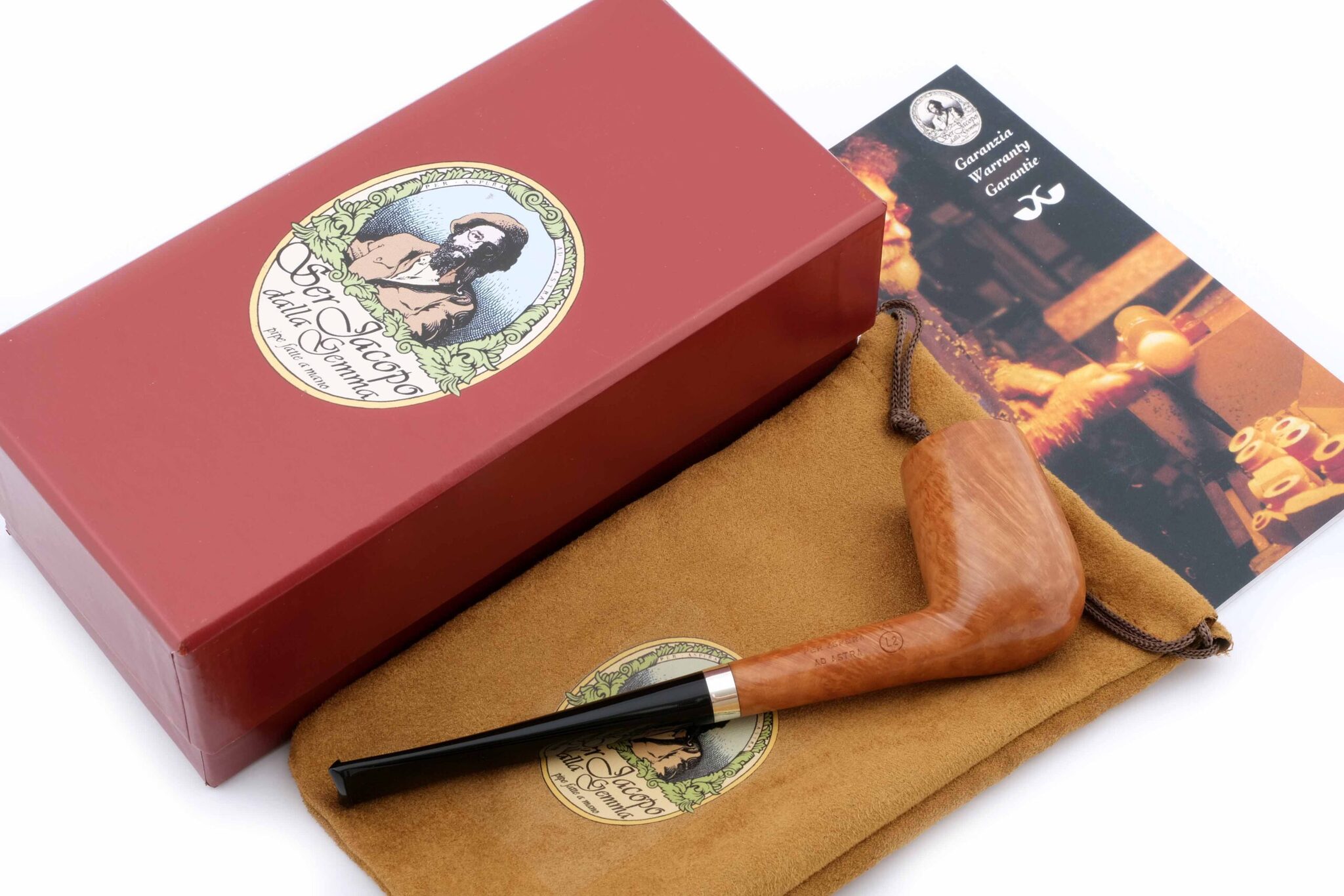 Мундштук из акрила. Кольцо на чубуке из серебра 925 пробы. На трубке выбит девиз мастерской Ser Jacopo PER ASPERA AD ASTRA («Через тернии к звездам», лат.), маркировки: Ser Jacopo, Hand made in Italy, грэйд L2 A. Фильтр 3 мм. Вес 36 грамм. Длина трубки 16 см. Диаметр чашки 34 мм, Высота чашки 53 мм. Диаметр табачной камеры 20 мм., глубина 40 мм. В комплекте подарочная коробка, кисет для трубки и буклет компании Ser Jacopo. Ручная работа, единственный экземпляр.
