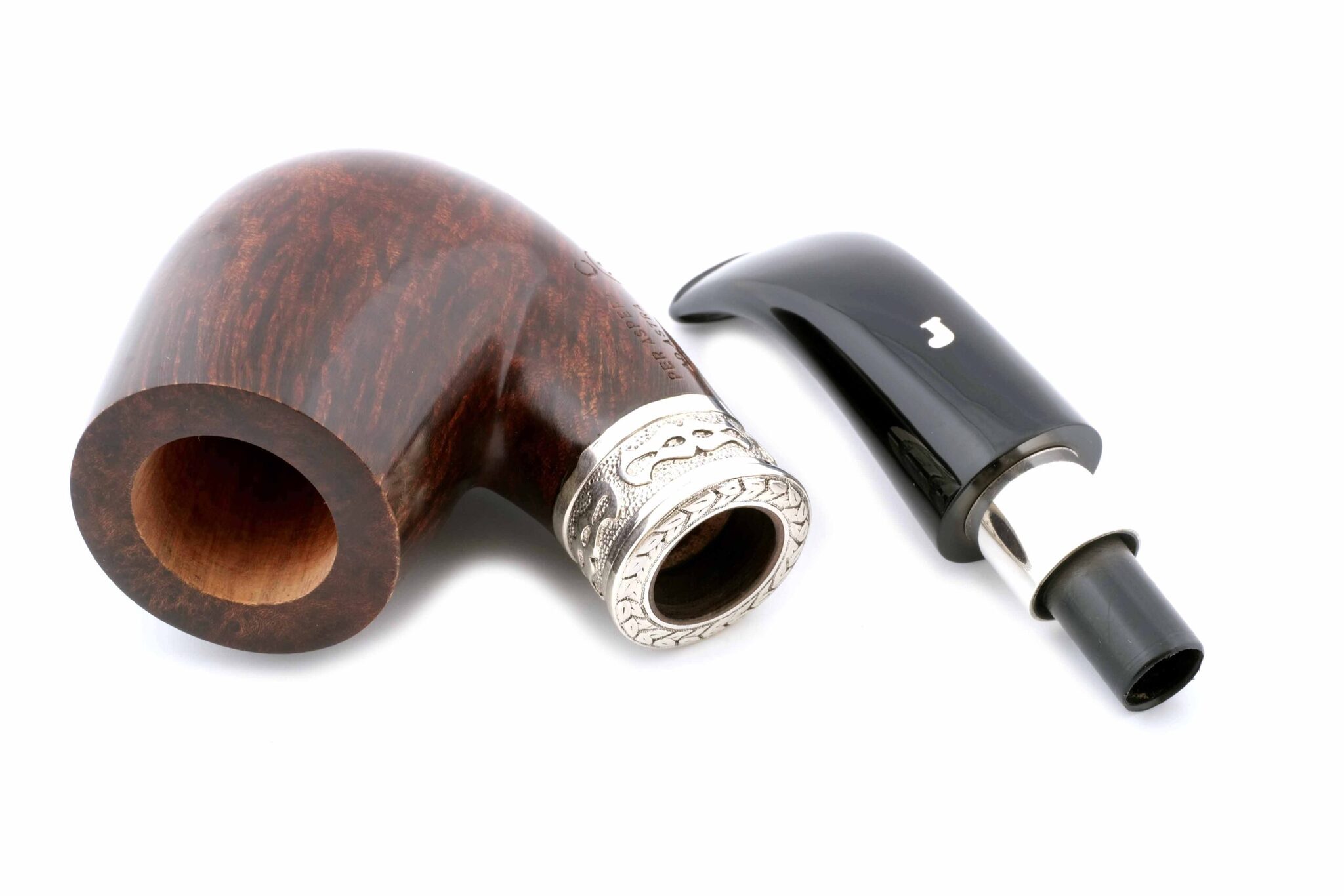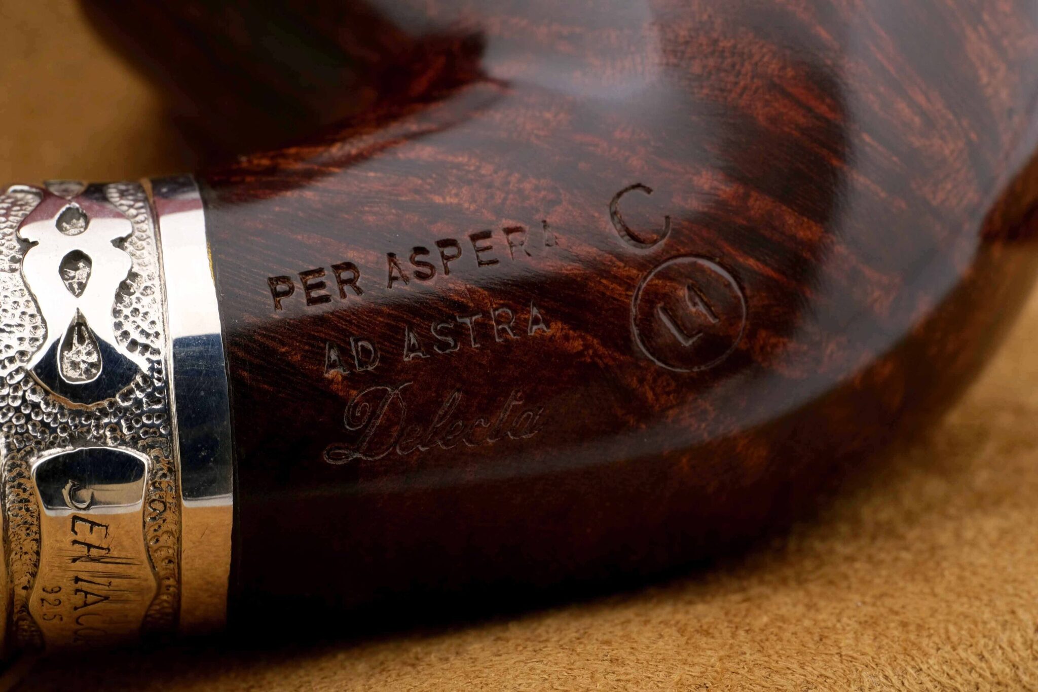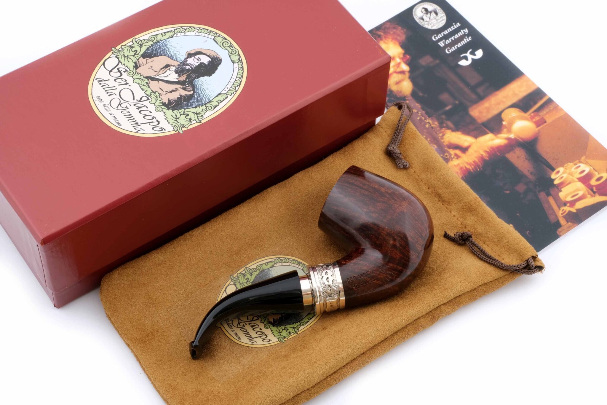 Двойное кольцо на чубуке и мундштуке модели Delecta из серебра 925 пробы. На трубке выбит девиз мастерской Ser Jacopo PER ASPERA AD ASTRA («Через тернии к звездам», лат.), маркировки: Ser Jacopo, Hand made in Italy, грэйд L1 C. В комплекте подарочная коробка, кисет для трубки и буклет компании Ser Jacopo. Ручная работа, единственный экземпляр.
