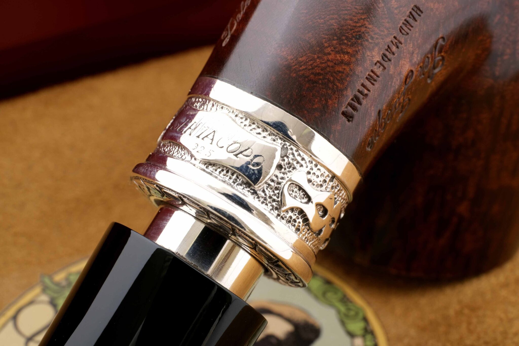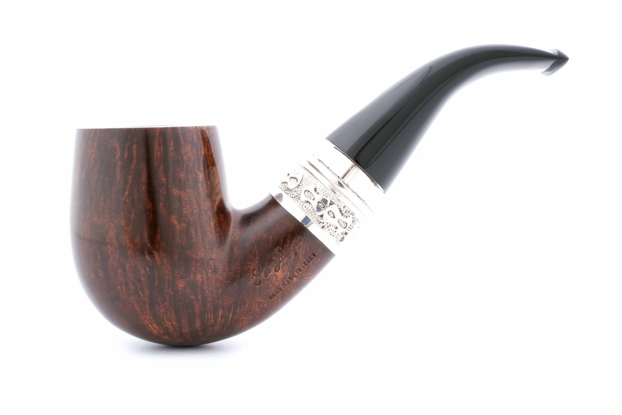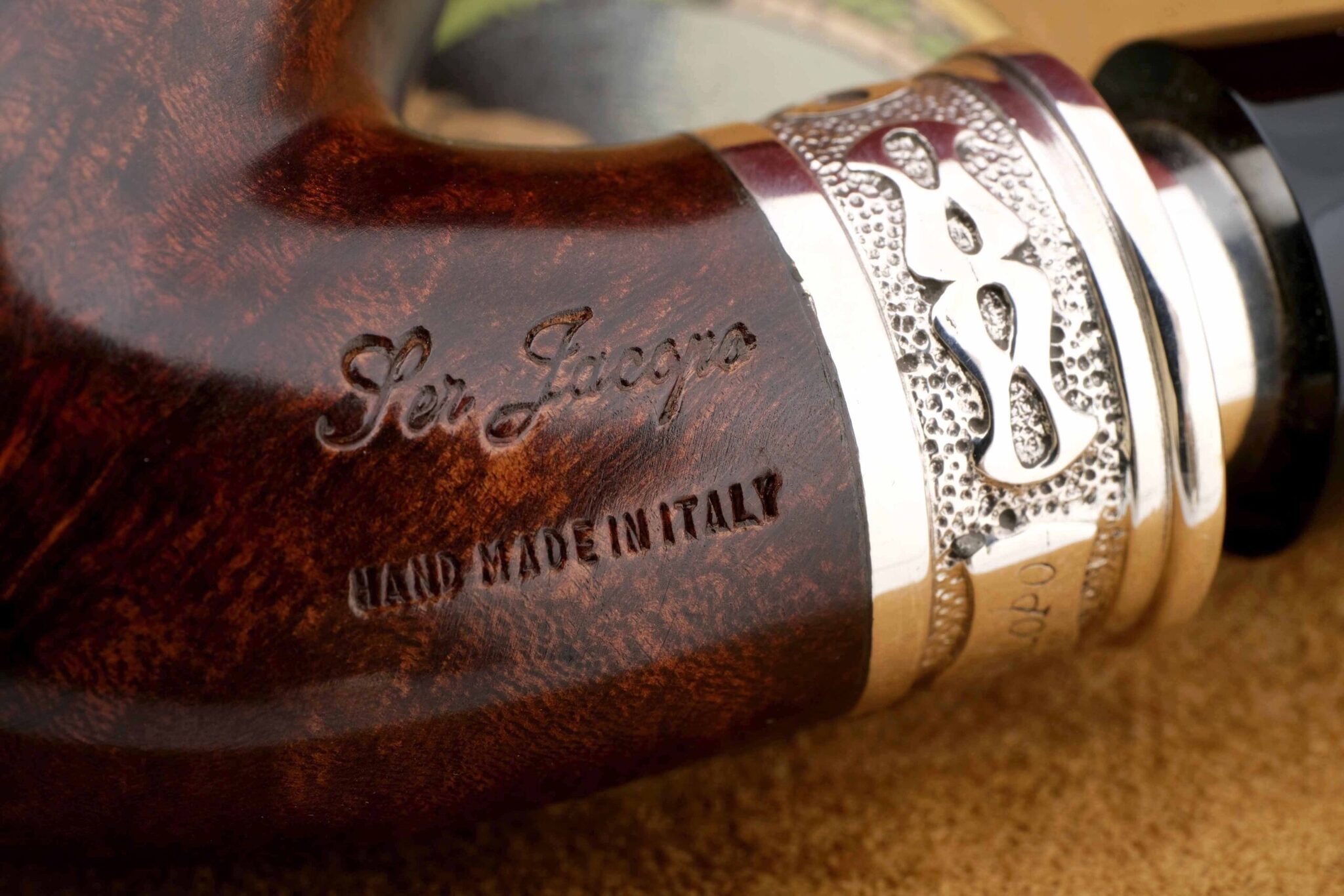 Двойное кольцо на чубуке и мундштуке модели Delecta из серебра 925 пробы. На трубке выбит девиз мастерской Ser Jacopo PER ASPERA AD ASTRA («Через тернии к звездам», лат.), маркировки: Ser Jacopo, Hand made in Italy, грэйд L1 C. В комплекте подарочная коробка, кисет для трубки и буклет компании Ser Jacopo. Ручная работа, единственный экземпляр.