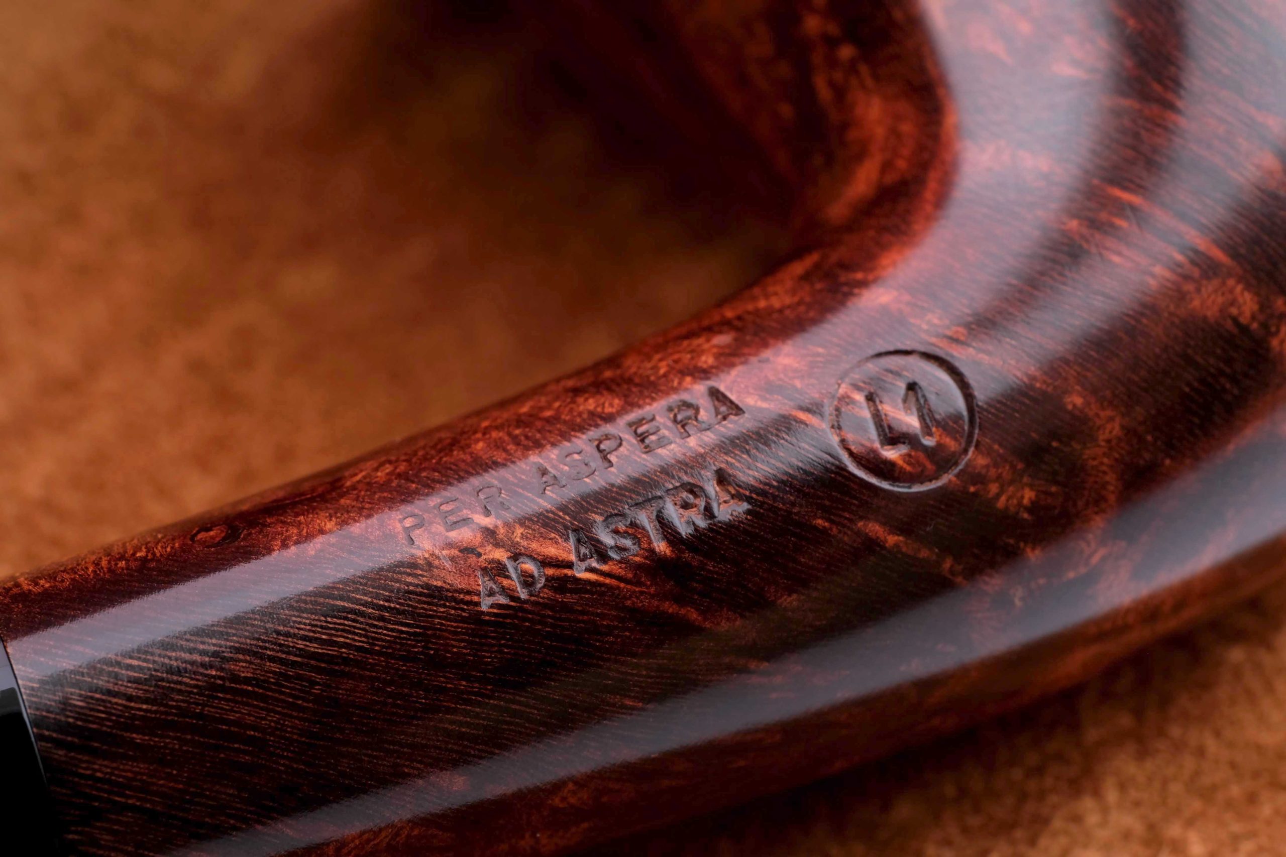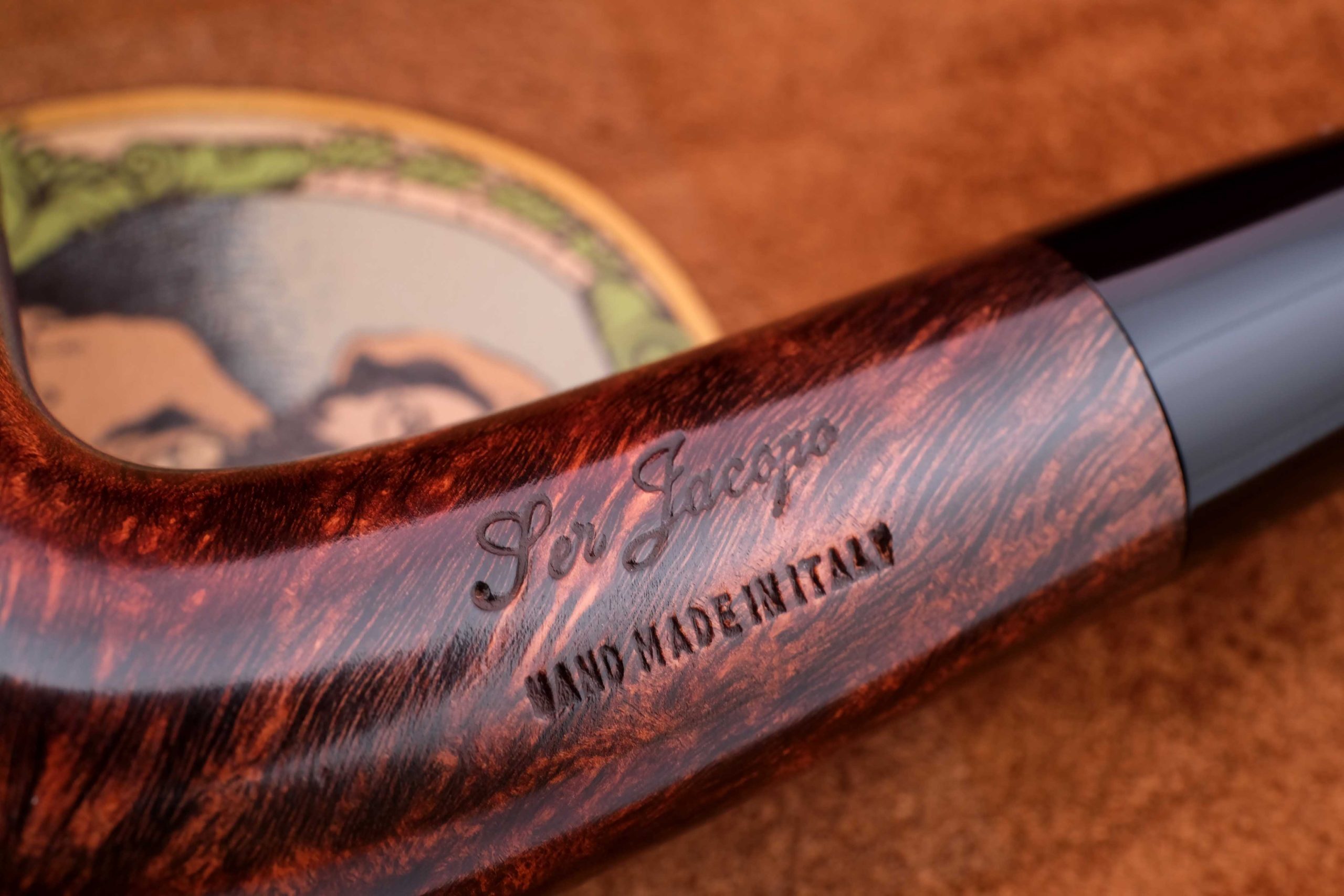 На трубке выбит девиз мастерской Ser Jacopo PER ASPERA AD ASTRA («Через тернии к звездам», лат.), маркировки: Ser Jacopo, Hand made in Italy, грэйд L1.