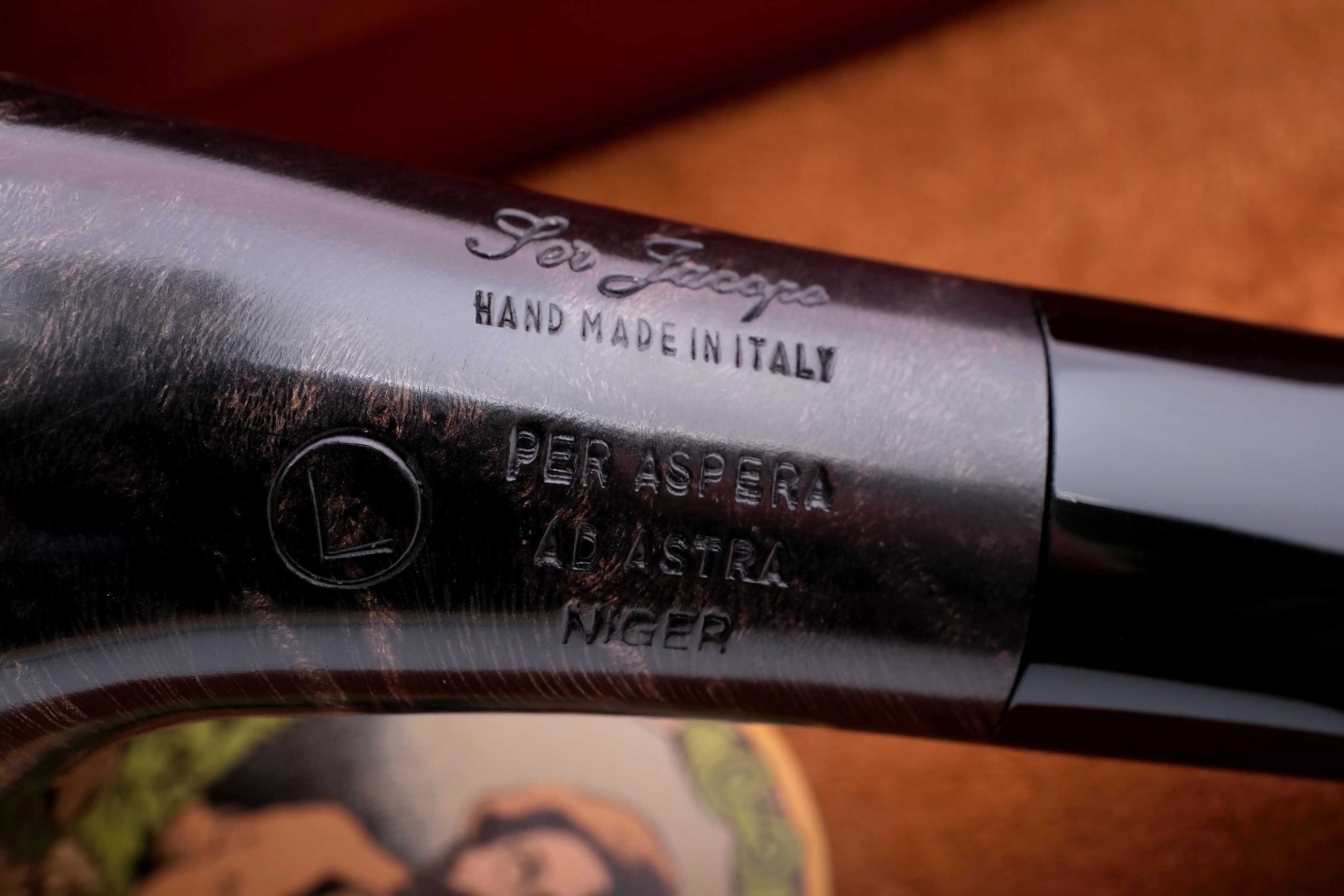 На трубке выбит девиз мастерской Ser Jacopo PER ASPERA AD ASTRA («Через тернии к звездам», лат.), маркировки: Ser Jacopo, Hand made in Italy, грэйд L Niger.