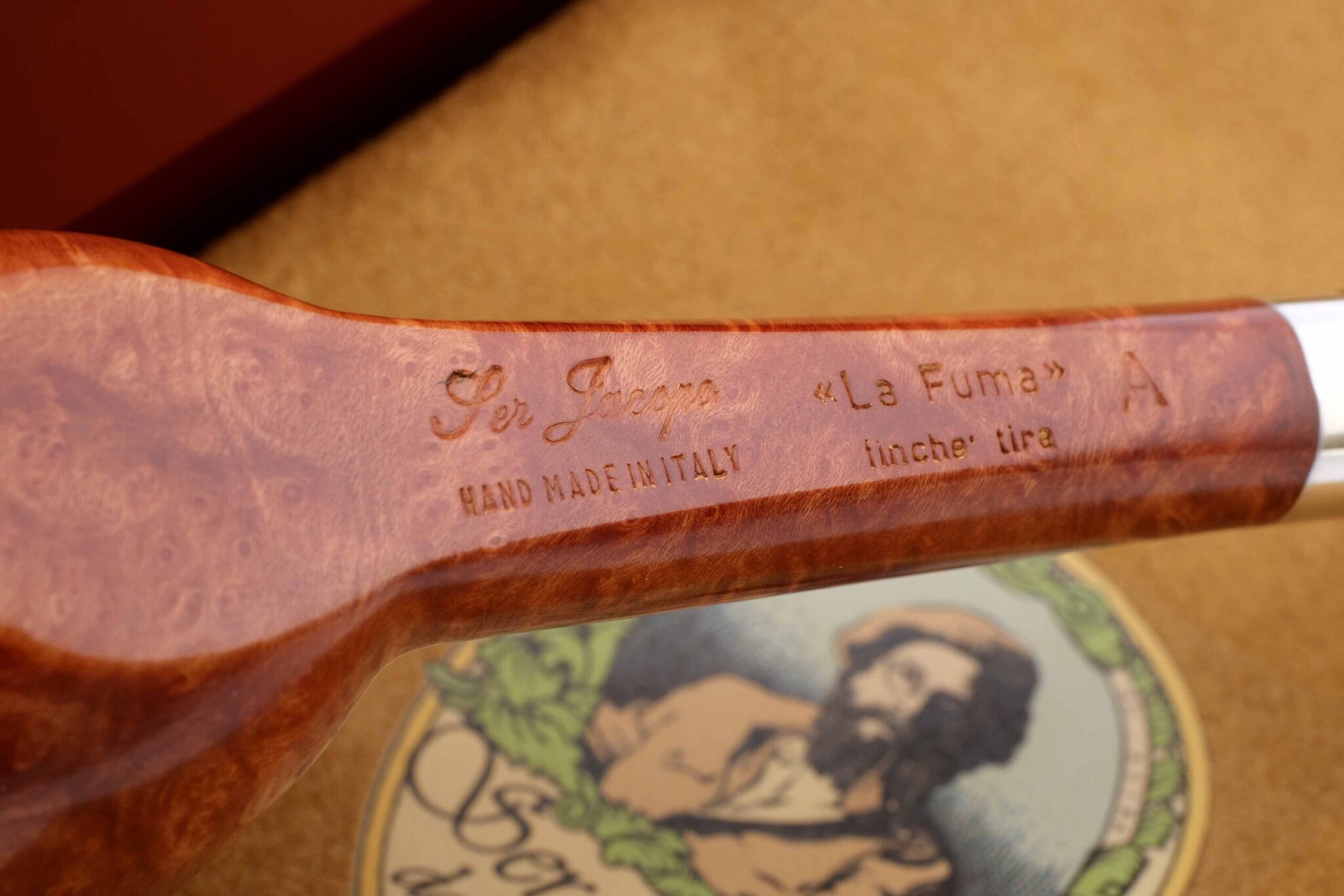 Мундштук из акрила. Кольцо на чубуке из серебра 925 пробы. На трубке выбит девиз La Fuma fiche tira («Дымится пока курится», ит.), маркировки: Ser Jacopo, Hand made in Italy, грэйд La Fuma А. В комплекте подарочная коробка, кисет для трубки и буклет компании Ser Jacopo. Ручная работа, единственный экземпляр.