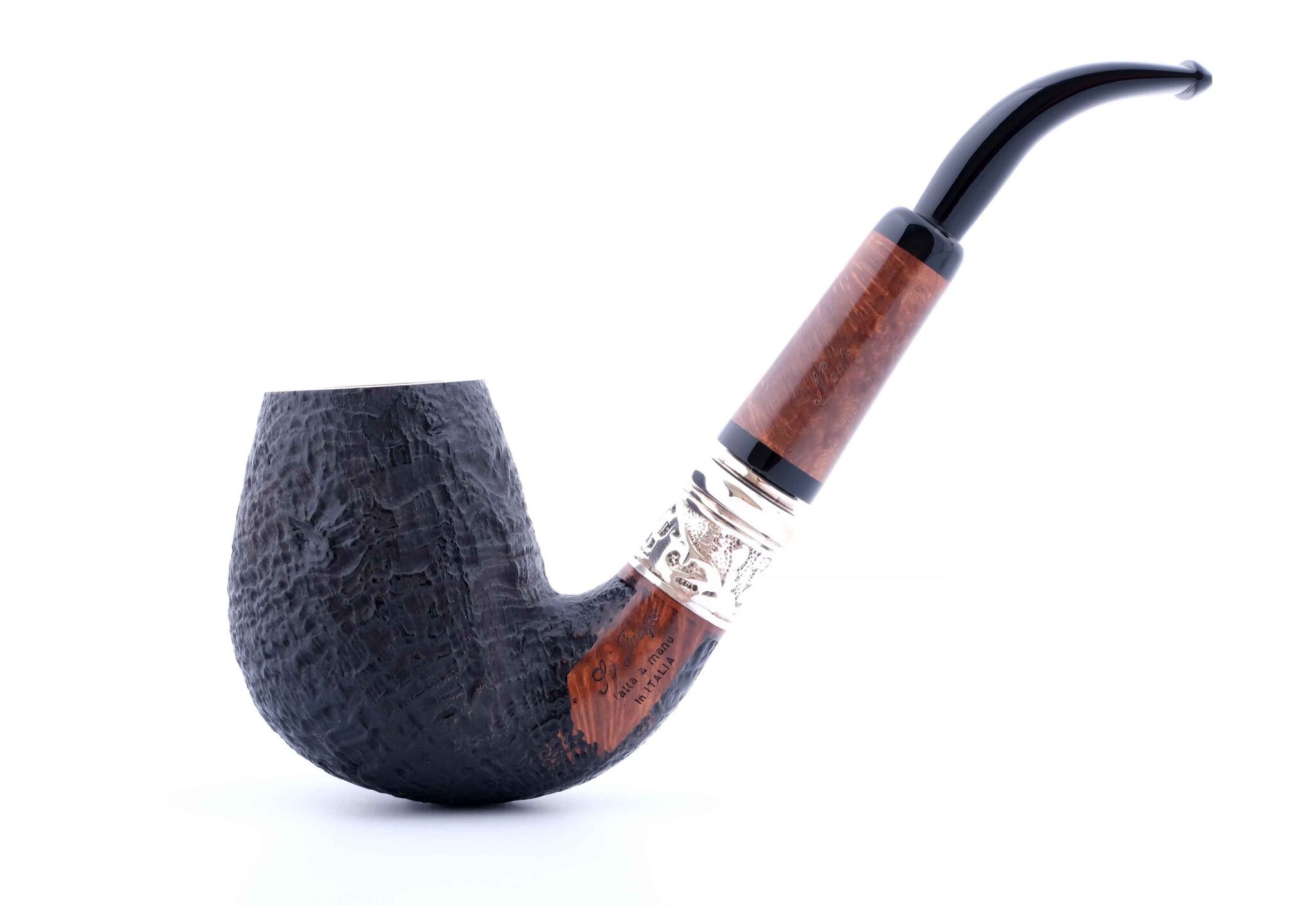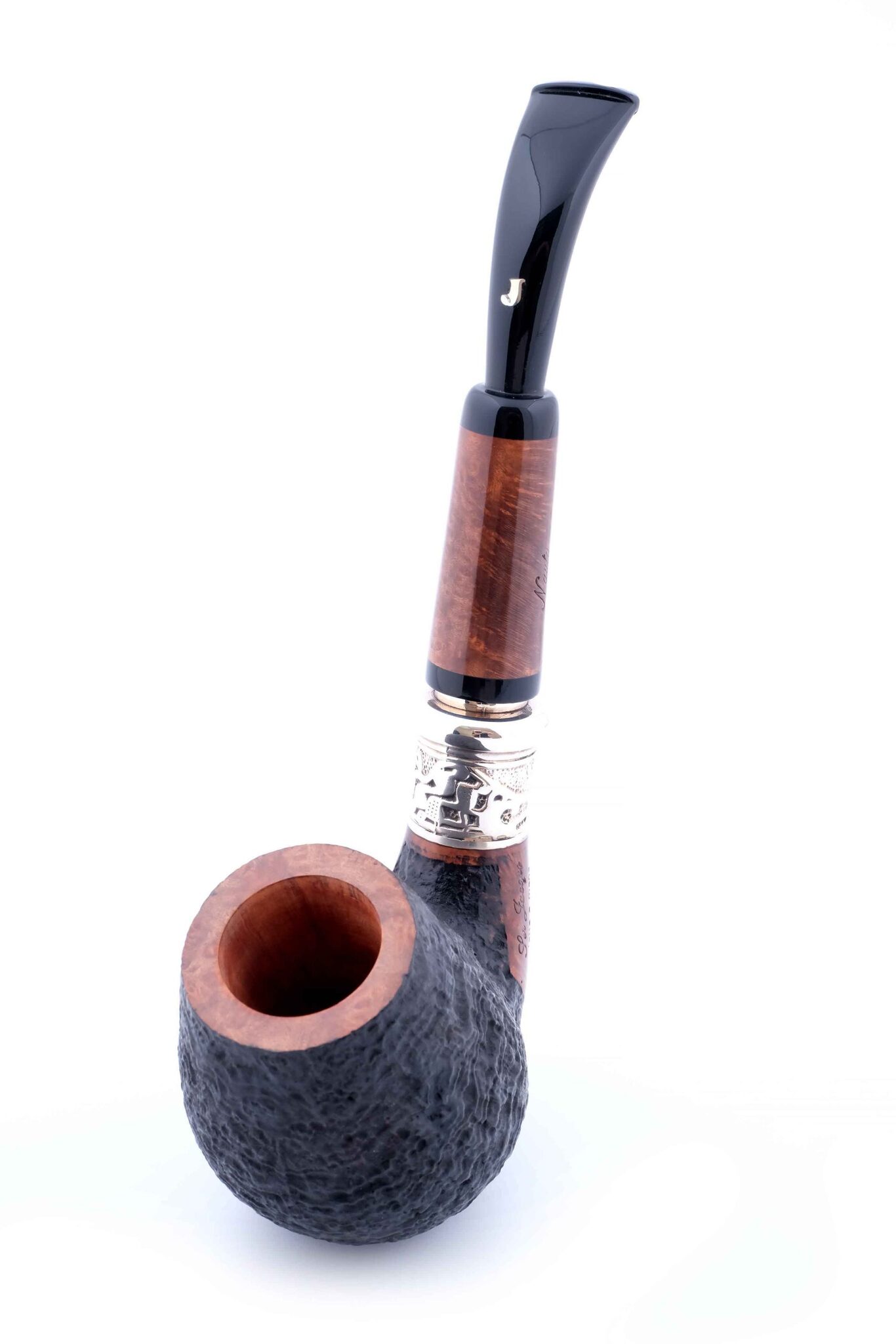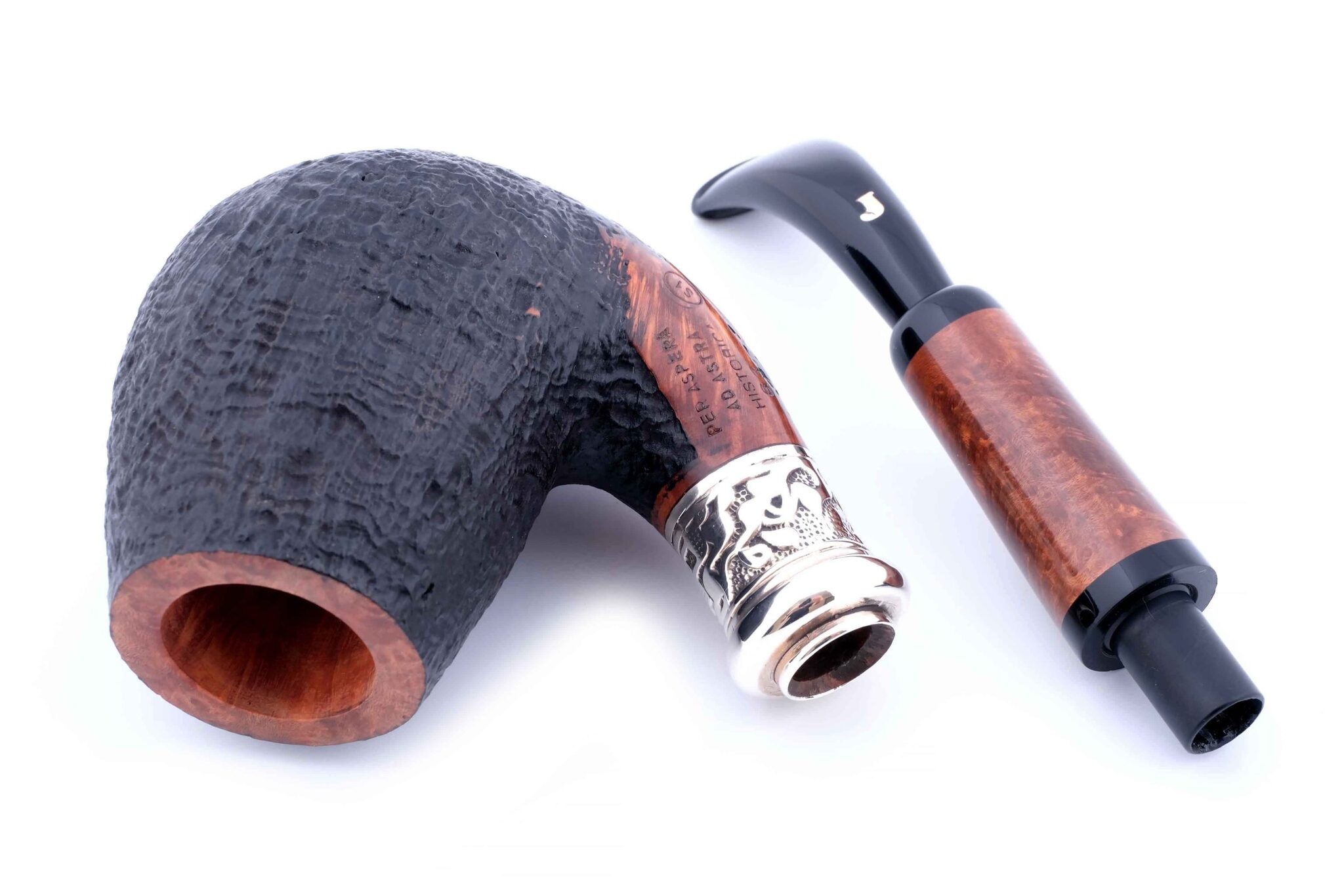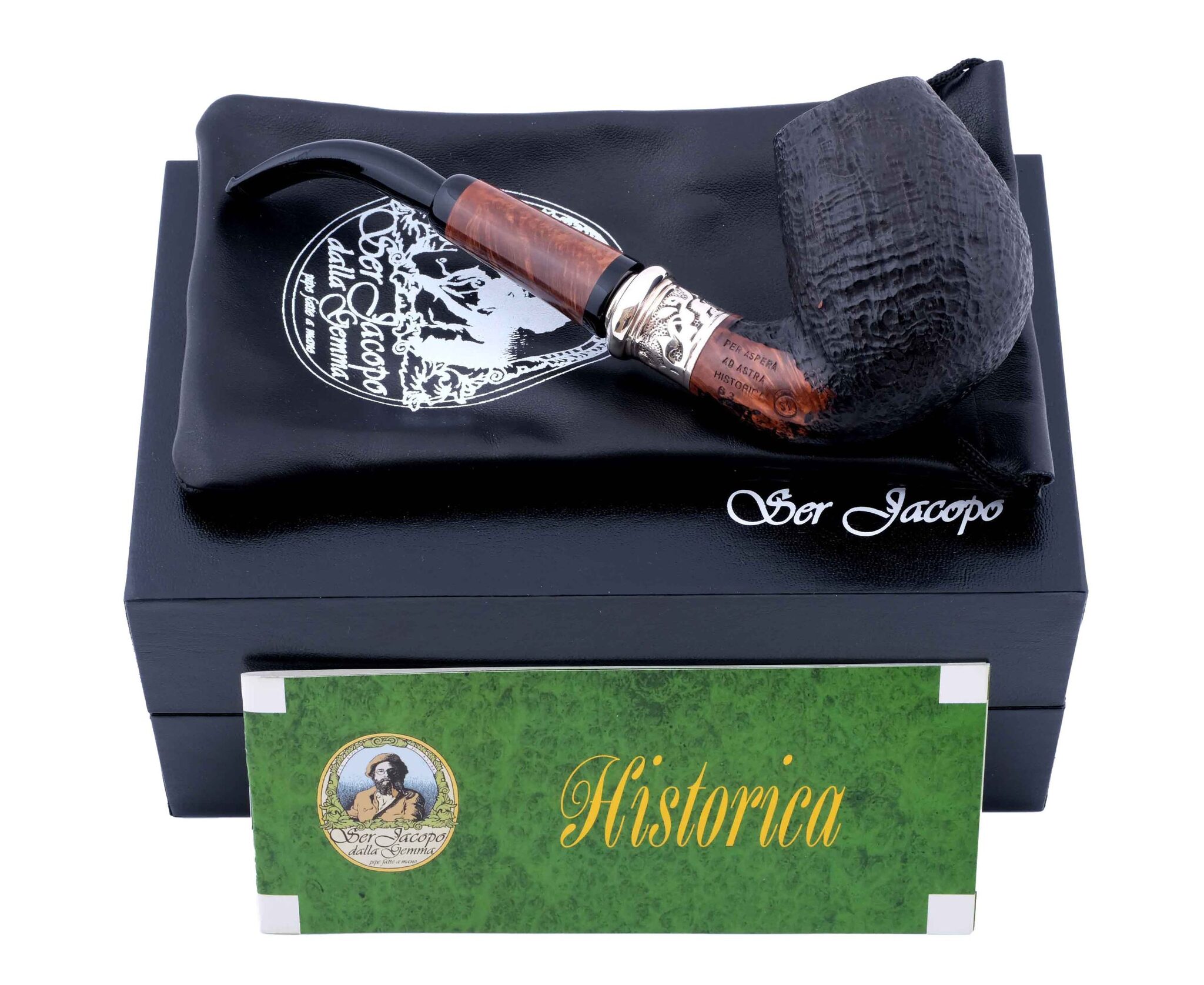 На трубке выбит девиз мастерской Ser Jacopo «PER ASPERA AD ASTRA» ( Через тернии к звездам, лат.), маркировки: Ser Jacopo, Historica, Nauta, Hand made in Italy, грэйд L2 и уникальный номер.
