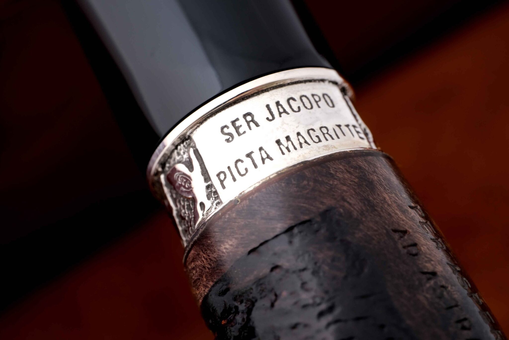 На чубуке снизу и по бокам выбит девиз мастерской PER ASPERA AD ASTRA («Через тернии к звездам», лат.), маркировки: Ser Jacopo, Hand made in Italy, градация S1, серия «Picta Magritte» и номер трубки.