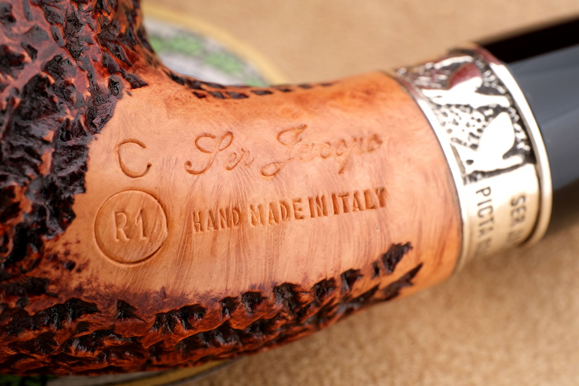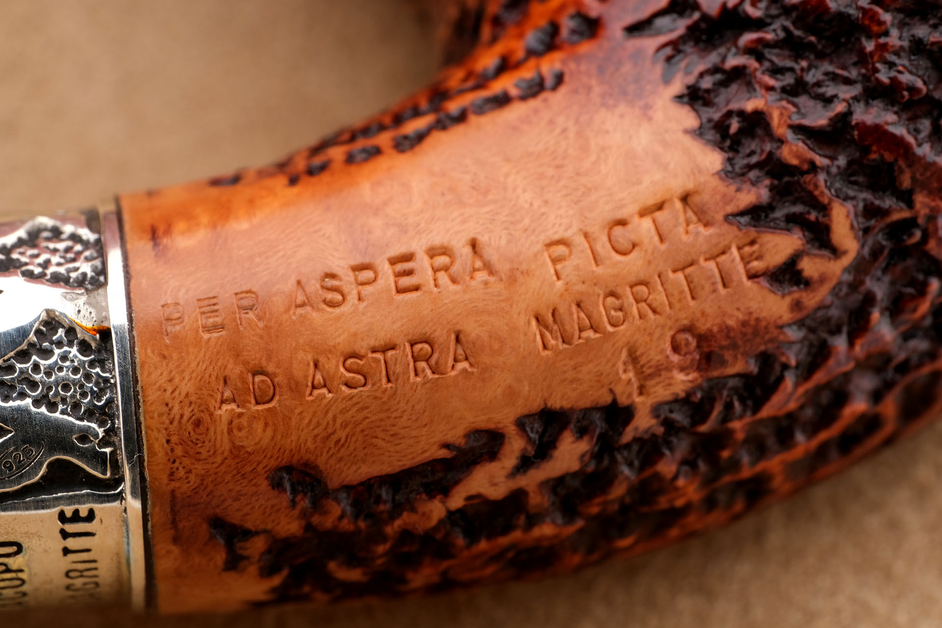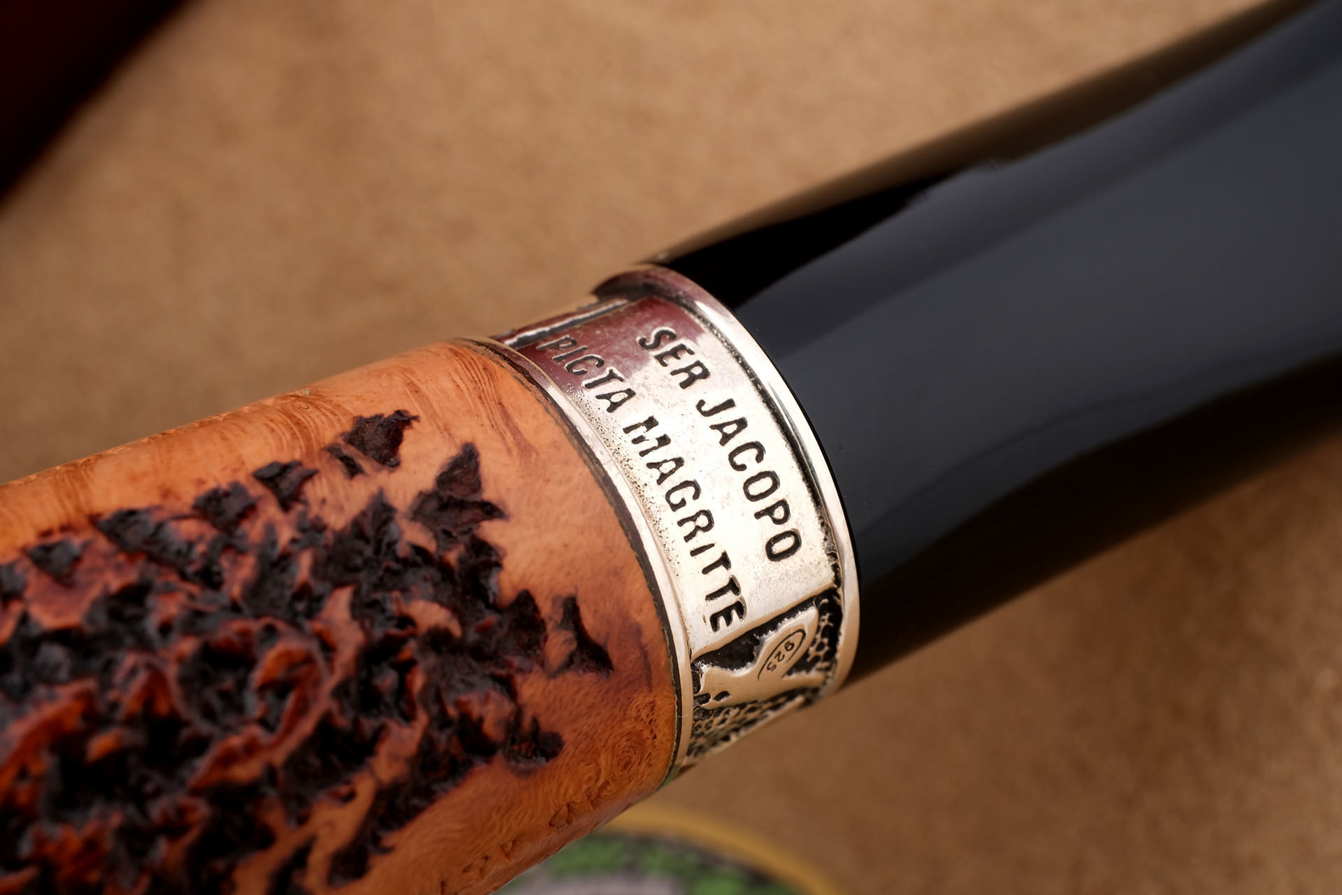 На чубуке снизу и по бокам выбит девиз мастерской PER ASPERA AD ASTRA («Через тернии к звездам», лат.), маркировки: Ser Jacopo, Hand made in Italy, градация R1 C, серия «Picta Magritte» и номер трубки.