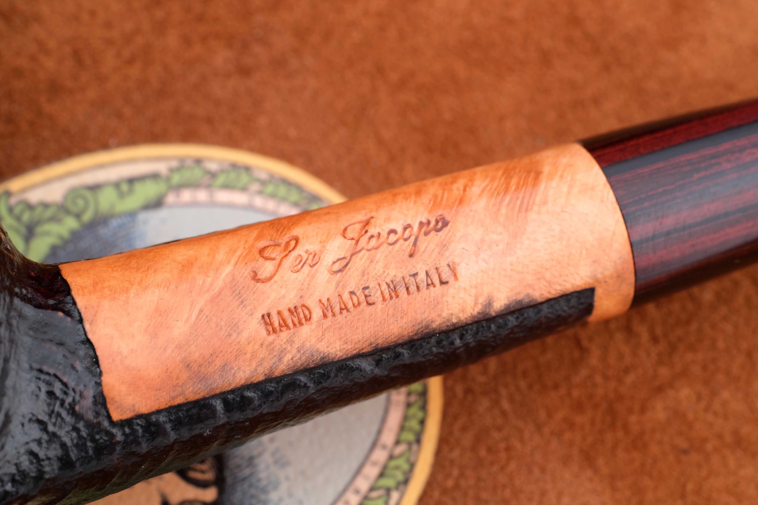 На трубке выбит девиз мастерской Ser Jacopo PER ASPERA AD ASTRA («Через тернии к звездам», лат.), маркировки: Ser Jacopo, Hand made in Italy, грэйд S1 A.