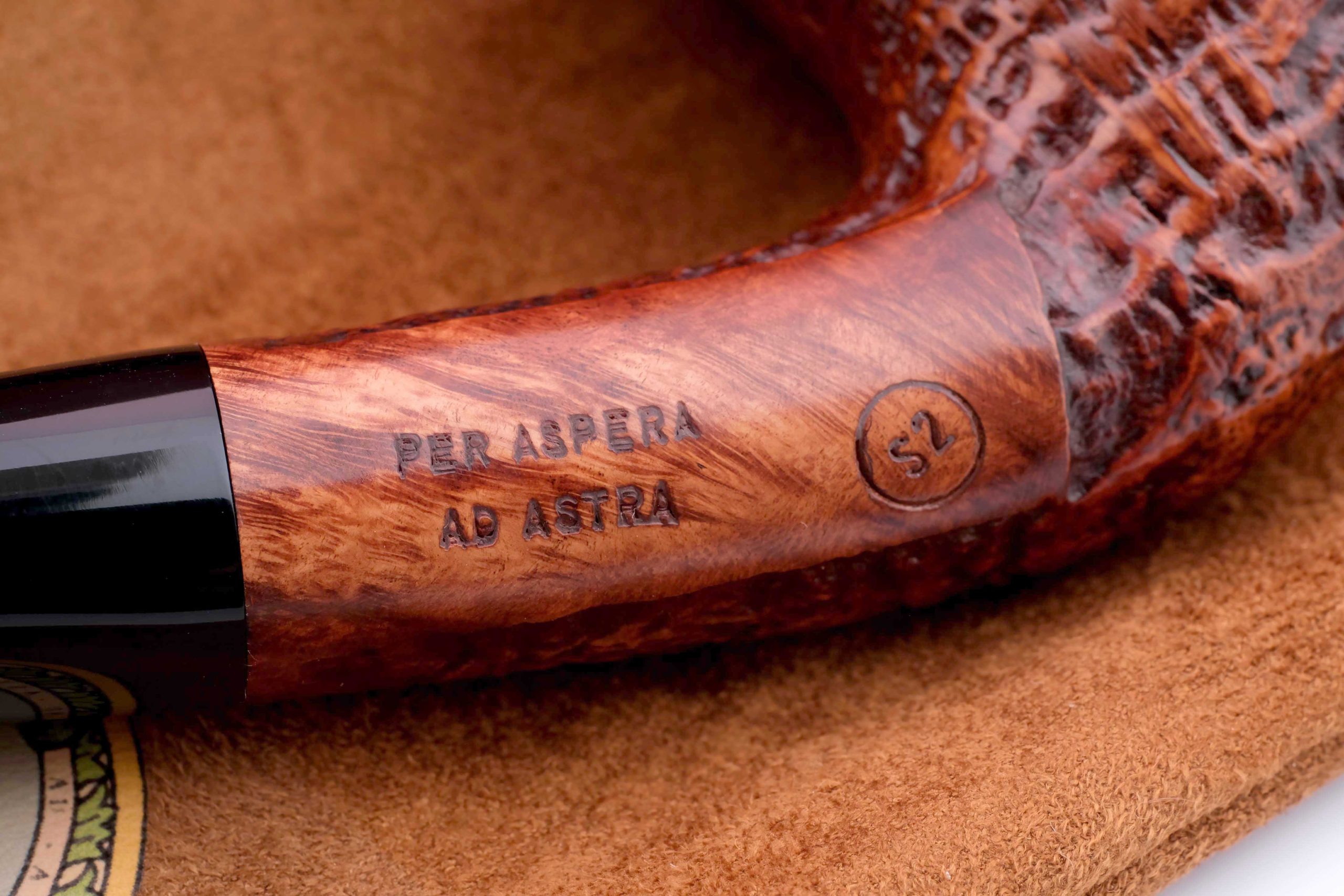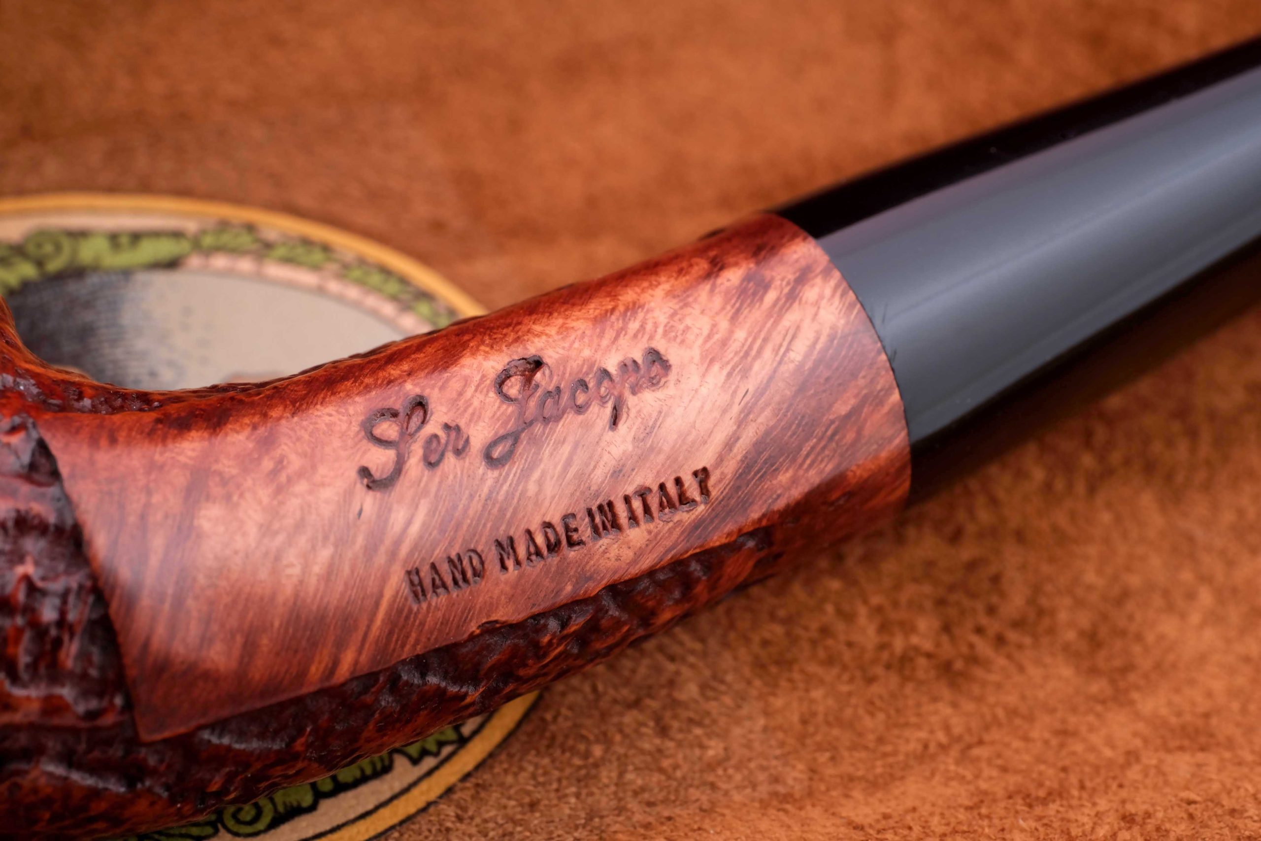 На трубке выбит девиз мастерской Ser Jacopo PER ASPERA AD ASTRA («Через тернии к звездам», лат.), маркировки: Ser Jacopo, Hand made in Italy, грэйд S2.